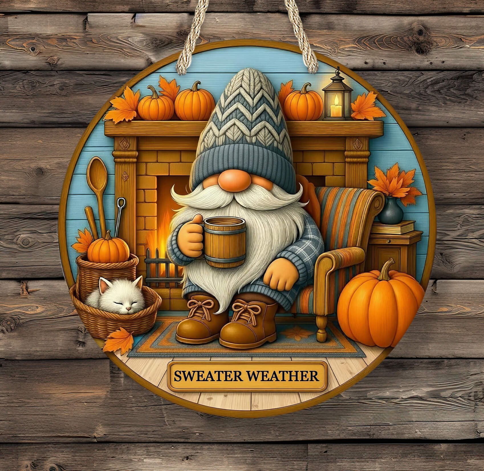 Add warmth and rustic charm to your space with this Welcome Gnome Sign, perfect for fall decorating or year-round coziness. Featuring a bearded gnome with a warm drink in front of a glowing fireplace, this round hardboard sign is filled with seasonal pumpkins, colorful leaves, and a cozy cat curled in a basket.