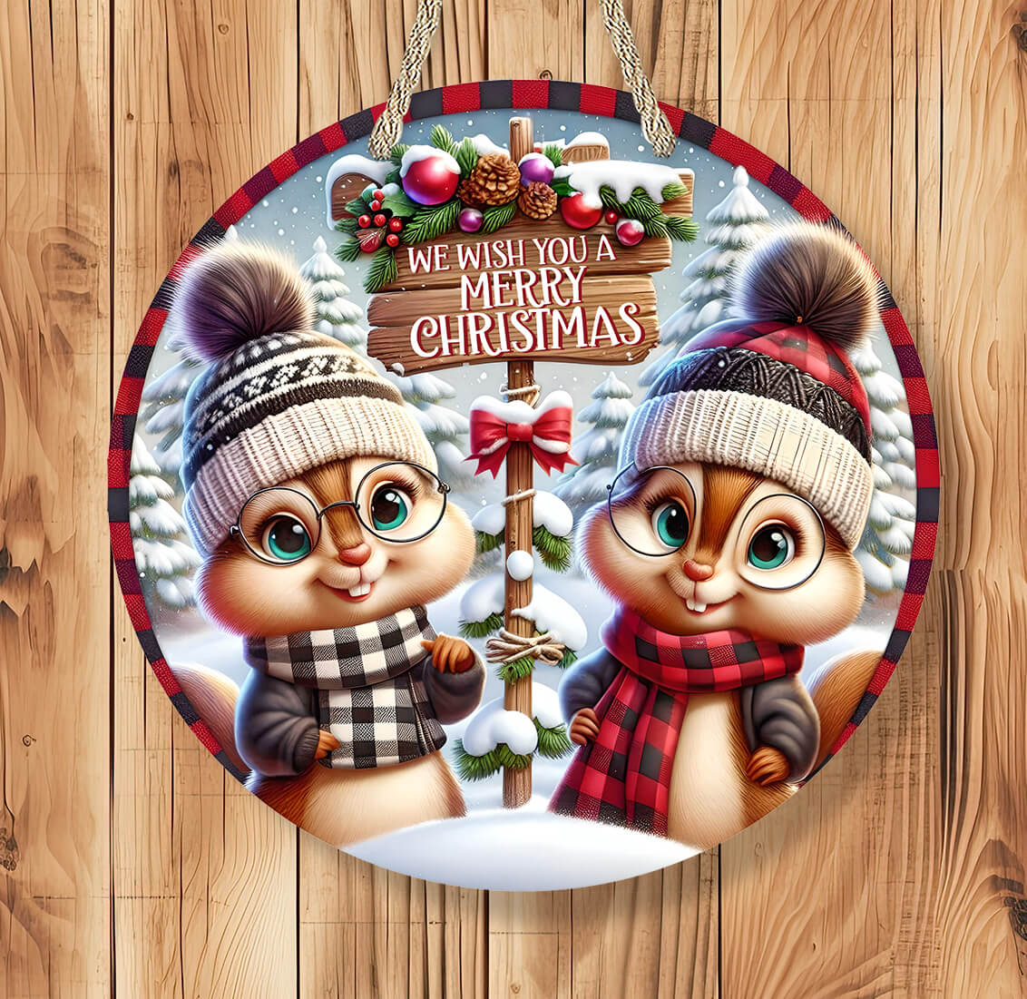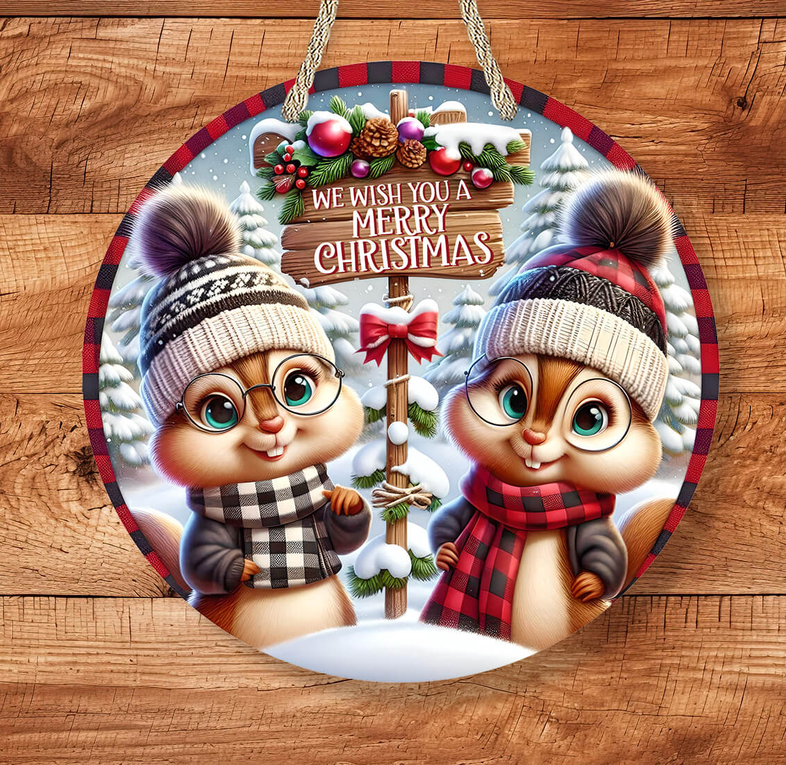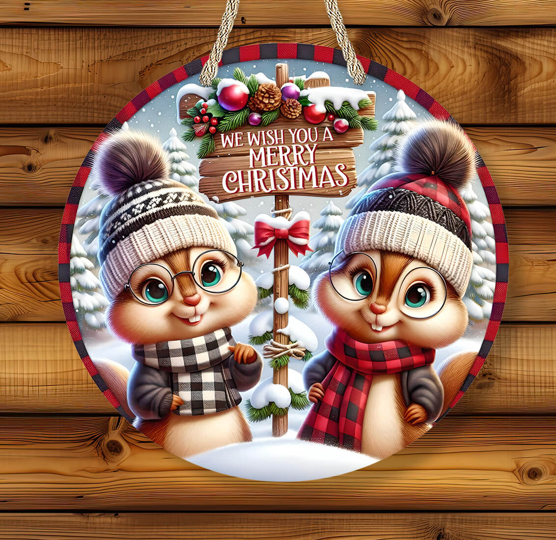 Bring festive woodland charm to your home with this Personalized Chipmunk Christmas Sign! Featuring two adorable chipmunks in cozy winter hats and scarves, holding a “We Wish You a Merry Christmas” sign, this round rustic farmhouse-style decoration is perfect for your porch, entryway, or living room.
