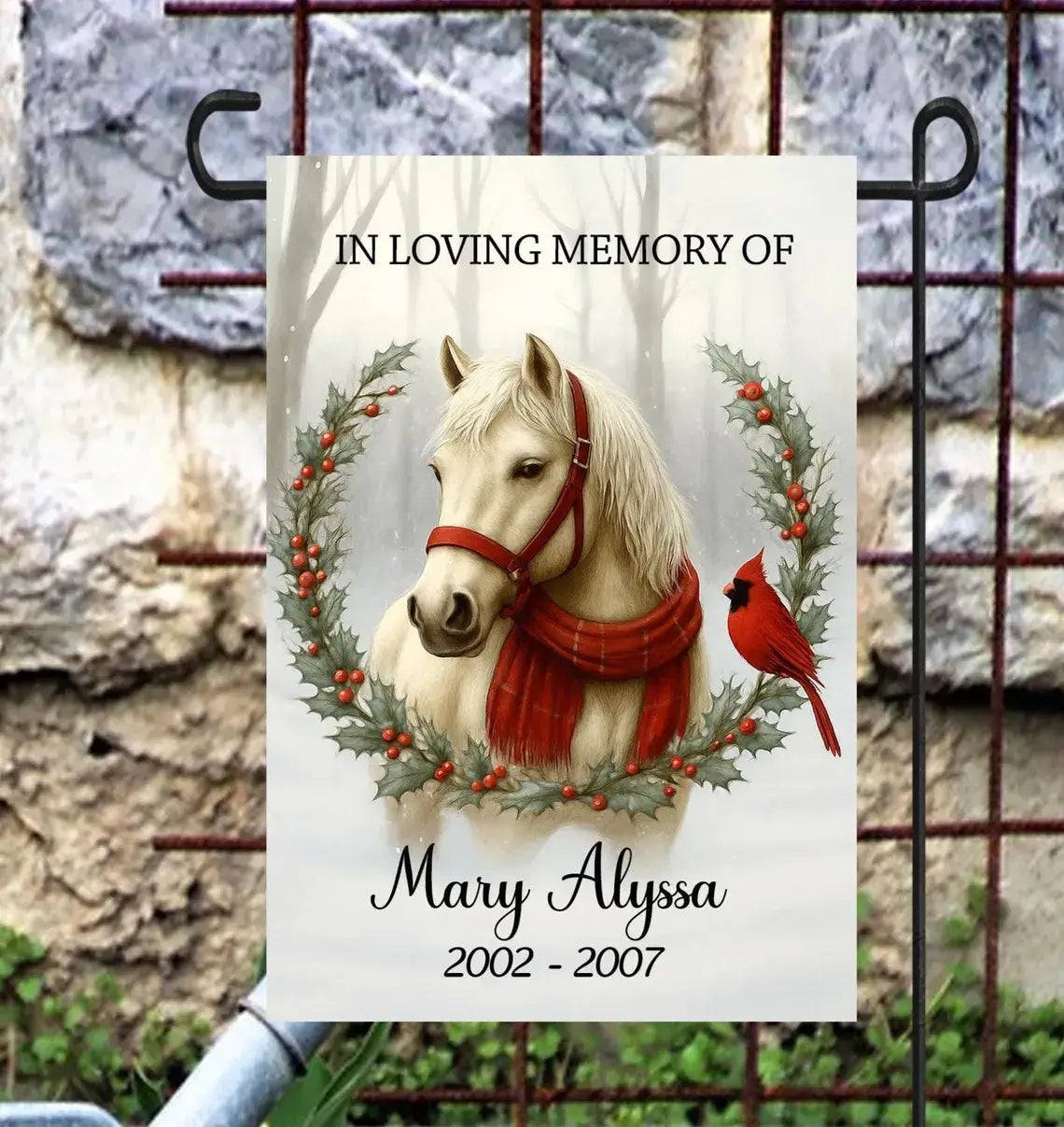 Personalized memorial horse flag with red cardinal — a heartfelt garden banner to honor a loved one’s memory during the holiday season, beautiful as a cemetery decoration for the Christmas season.