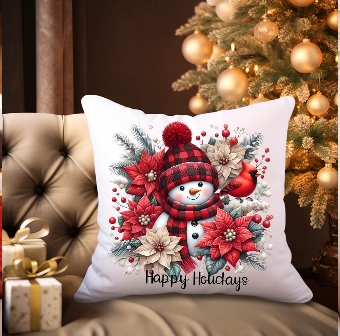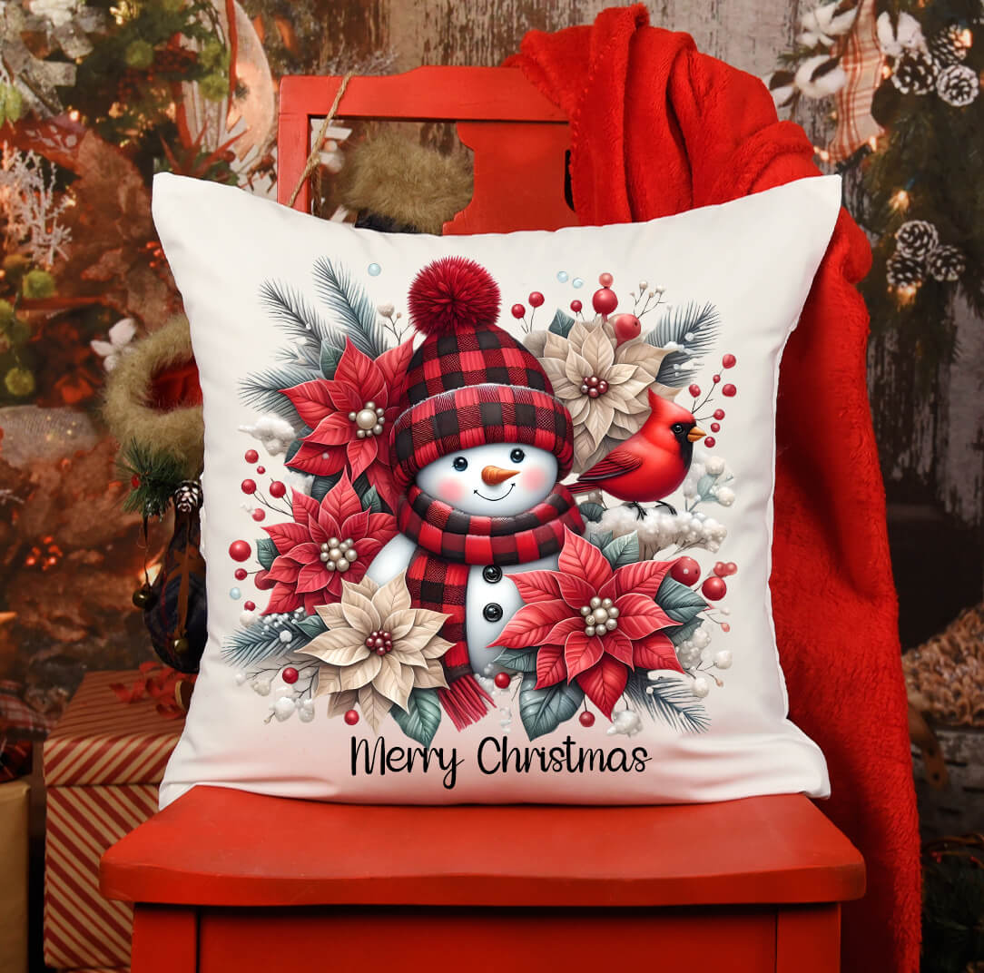 This premium throw pillow showcases an adorable snowman in a red buffalo-plaid hat and scarf, surrounded by poinsettias, berries, pine greenery, and a bright red cardinal. Your family name is printed in elegant script for a keepsake that doubles as festive home décor and a memorable Christmas gift.