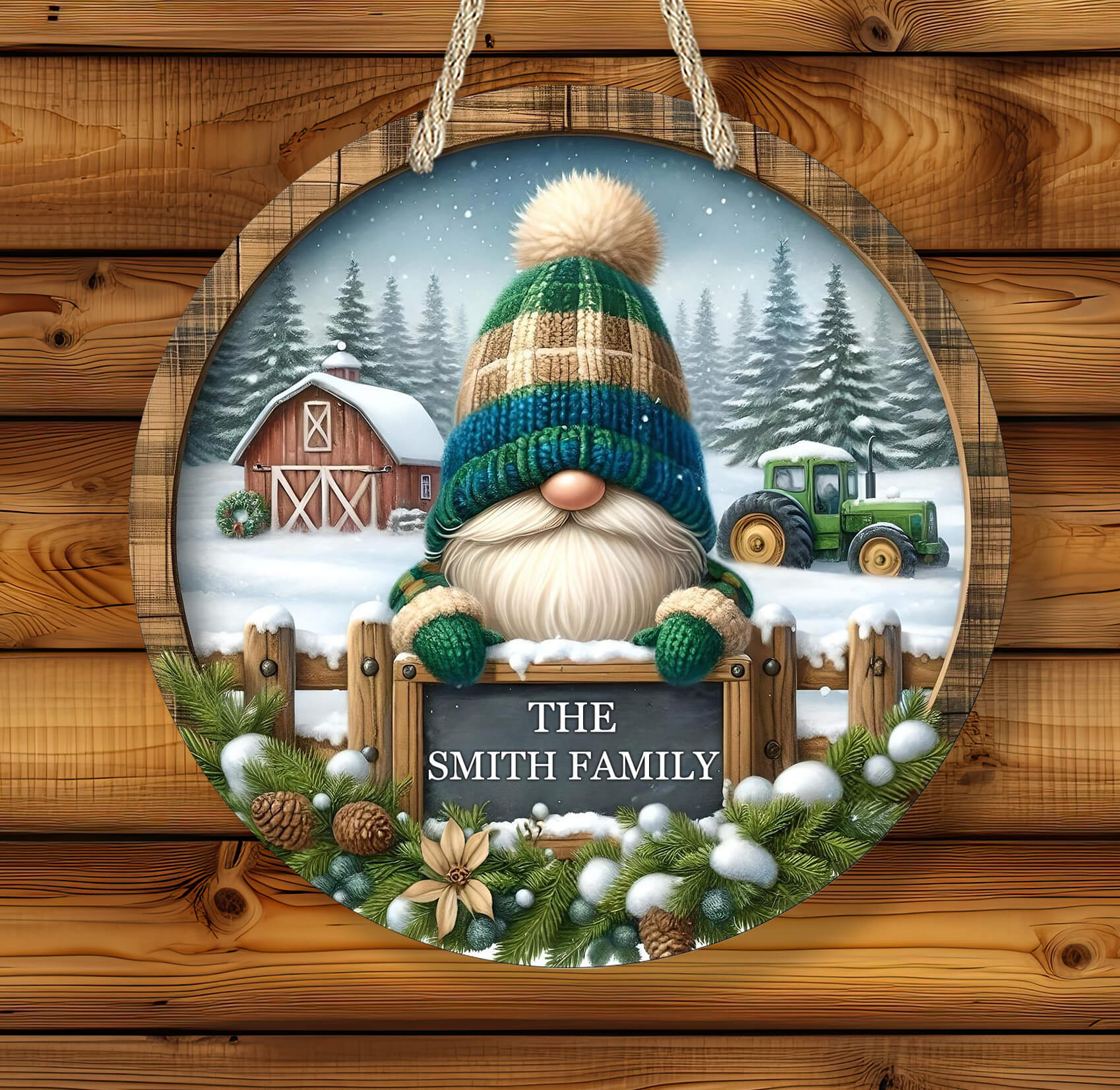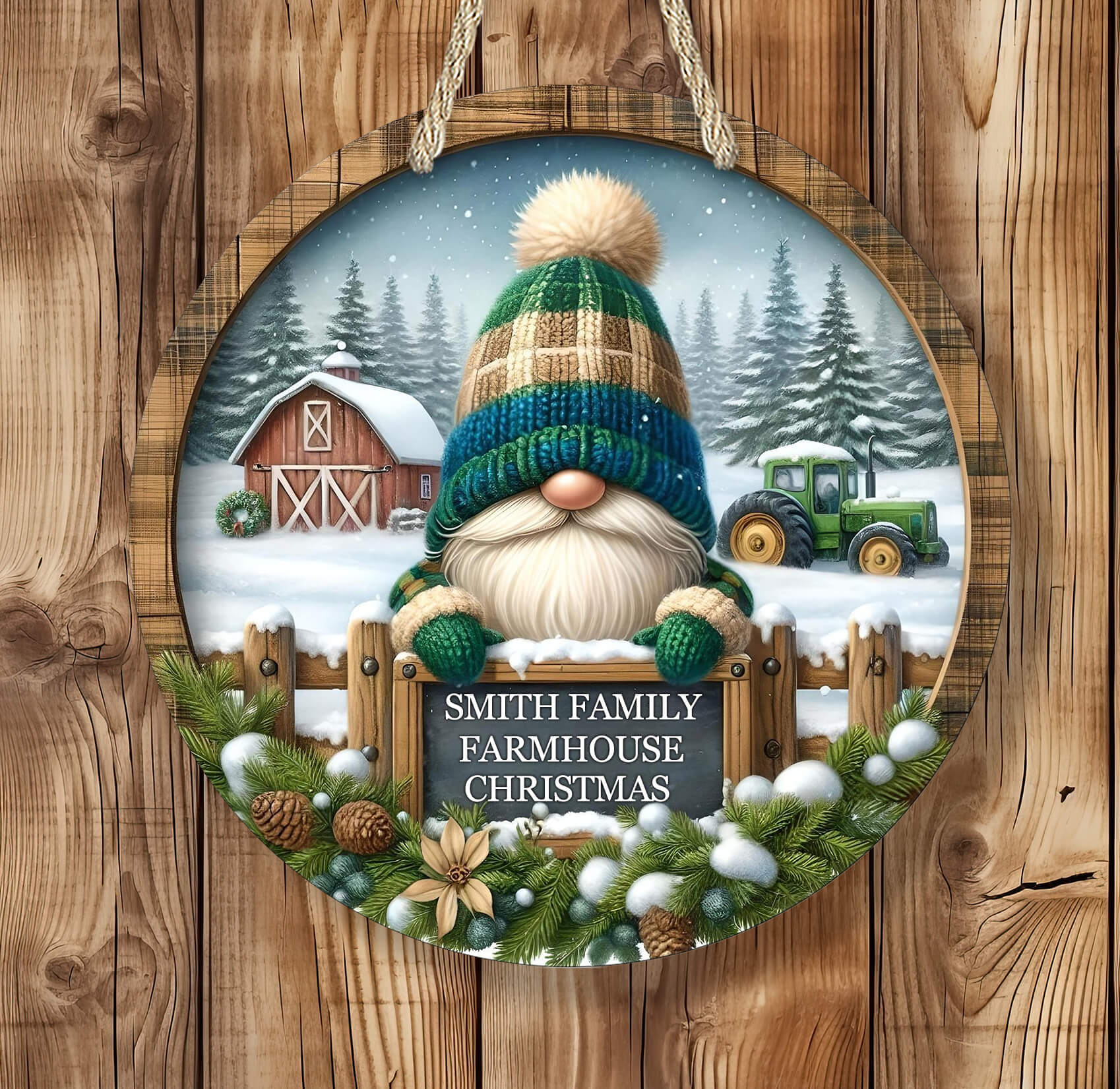 Bring cozy farmhouse charm to your holiday season with this personalized Christmas gnome sign! Featuring a rustic barn, tractor, snowy pine trees, and a festive gnome in a knitted hat, this custom family farmhouse sign is the perfect addition to your holiday décor. Made of laser cut hardboard 14" round, 1/4" thick with jute for hanging, the image is permanently printed and cooked into the hardboard along with your desired text creating a beautiful vibrant and colorful sign that will be treasured year after as part of your holiday decor. These digns are flat with a flat border they do not have real lights or frames they must be placed under a covered area and out of the direct elements like a covered porch, patio etc.