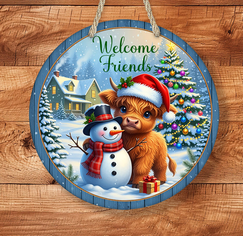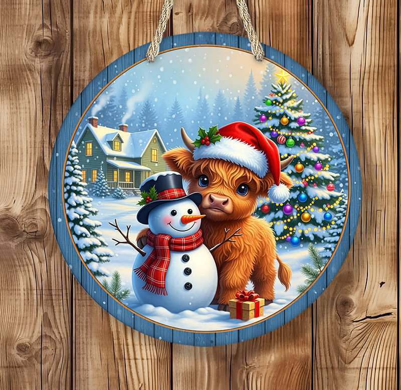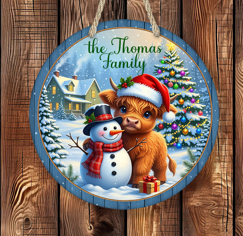 This personalized Highland Cow Christmas sign features an adorable Highland cow in a Santa hat cuddling a cheerful snowman, with a decorated Christmas tree and snowy cabin backdrop. Add your family name or holiday greeting to create a warm, one-of-a-kind winter decoration.