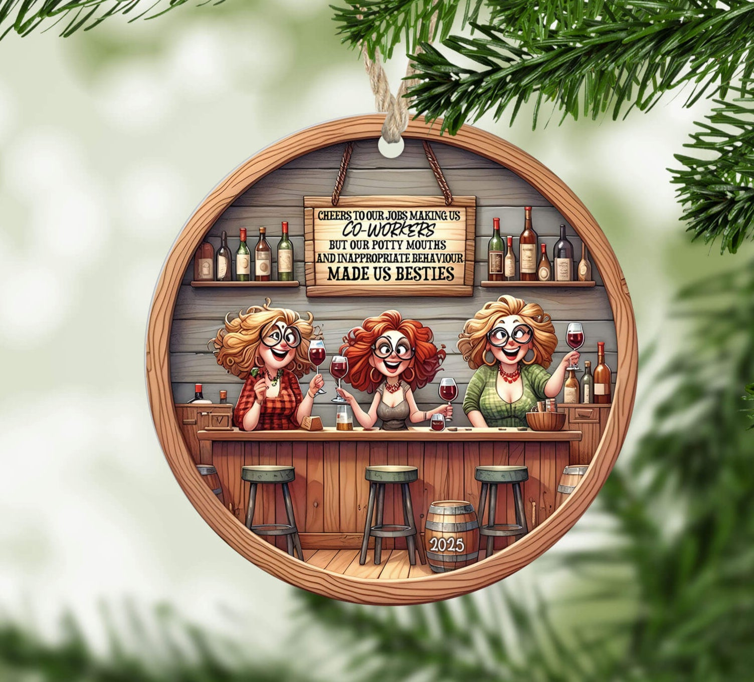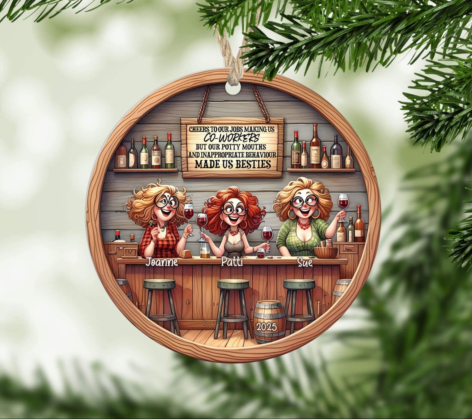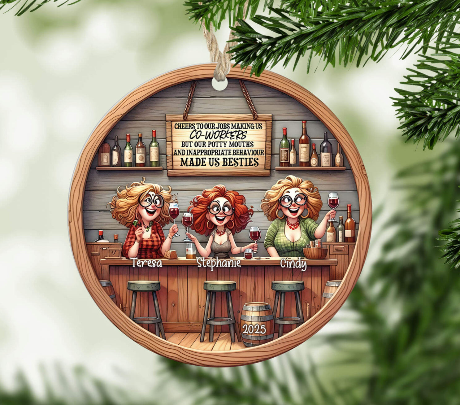 Celebrate the bond beyond just a job with this charming Personalized Holiday Coworker Ornament. Adorned with cheeky characters raising a toast under the sign “Cheers to our jobs making us coworkers—but our potty mouths and inappropriate behavior made us besties”, this ornament is tailored to bring joy, laughter, and workplace camaraderie to any office holiday décor.