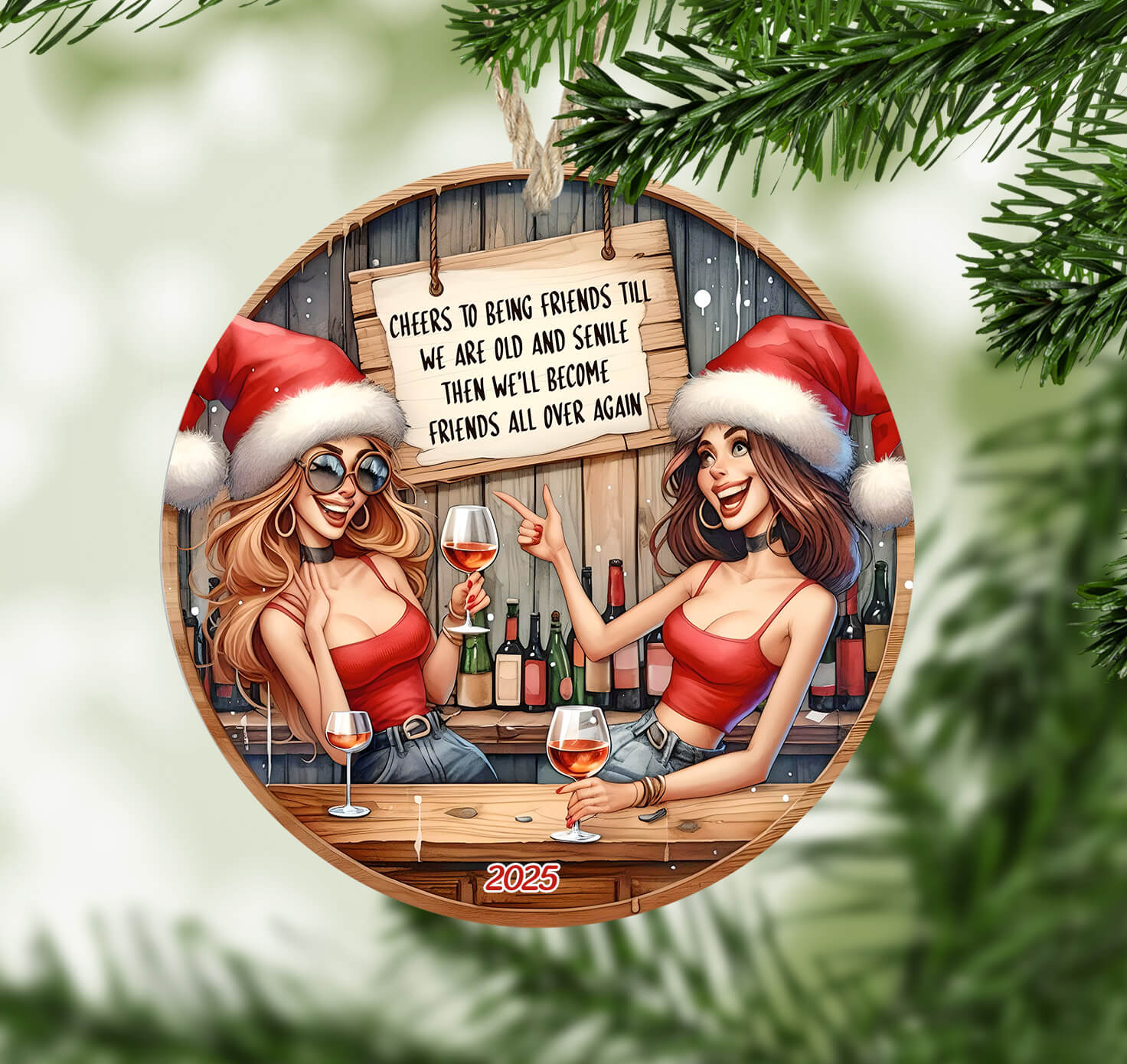 Celebrate friendship and laughter this holiday season with this Personalized Wine Bar Ornament! Featuring two festive girlfriends in Santa hats enjoying wine, this ornament can be customized with any text on the wooden bar sign — add names, dates, quotes, or your own fun message. Perfect as a coworker gift, best friend keepsake, or holiday party favor, this unique ornament will bring joy and a smile year after year. Made of laser cut hardboard 4 inch round 2 sided ornaments printed on both sides comes with juts for hanging, just add your desired names, year to this personalized ornament.