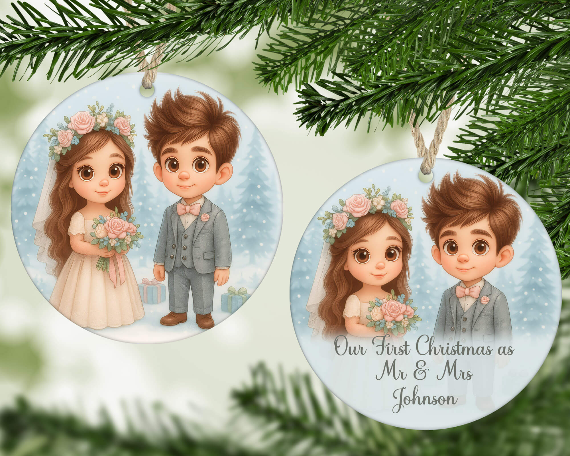 Celebrate love and the magic of the holidays with this personalized wedding couple ornament. Perfect for newlyweds, this keepsake features a charming bride and groom illustration with custom names, making it an unforgettable way to honor your first Christmas as Mr & Mrs.