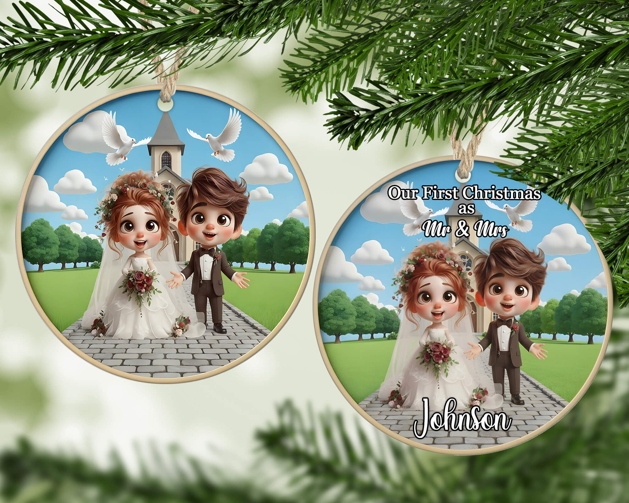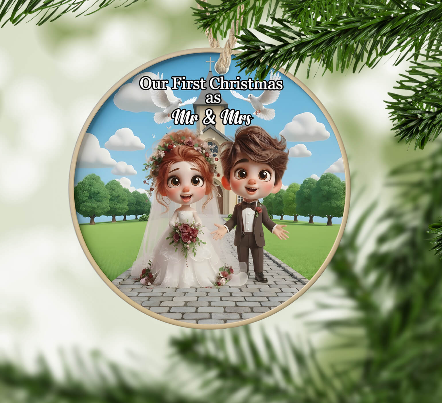 This custom wedding ornament features a sweet cartoon-style bride and groom standing outside a charming church, surrounded by greenery and doves. Perfect for commemorating your first Christmas as Mr & Mrs, it’s a meaningful way to remember the big day every holiday season.
