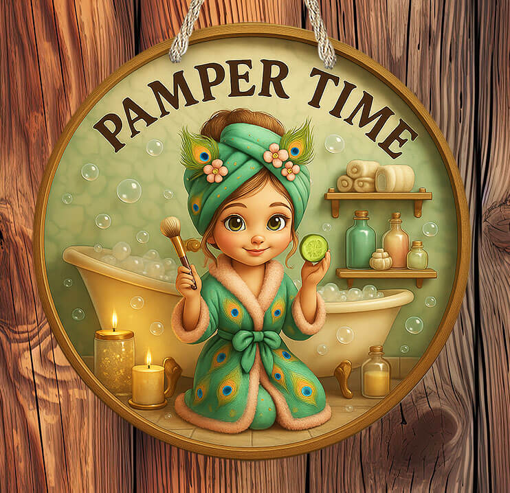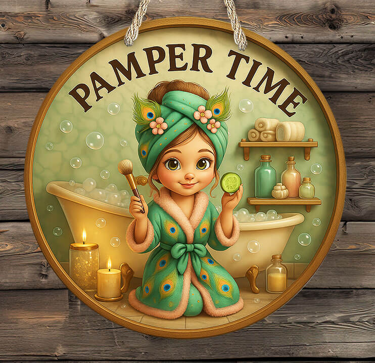 Turn your bathroom into a relaxing retreat with our Pamper Time Bathroom Sign! This charming round wall sign features an adorable girl in a peacock-feather robe and matching spa turban, sitting by a candlelit bubble bath with soothing details all around.