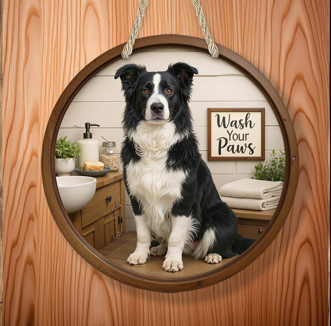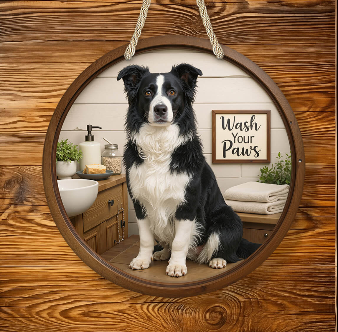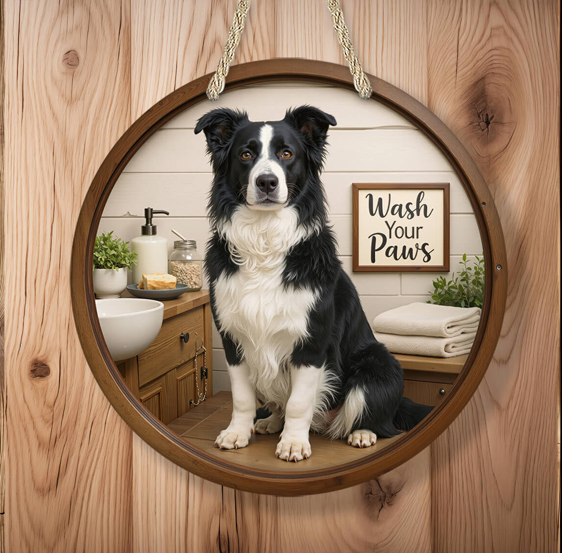 Add charm and personality to your bathroom with this Border Collie “Wash Your Paws” round 14" mdf hardboard flat sign with ink effect faux frame look. Featuring a lifelike Border Collie illustration set in a cozy farmhouse-style bathroom, this sign is the perfect blend of humor, warmth, and rustic décor.