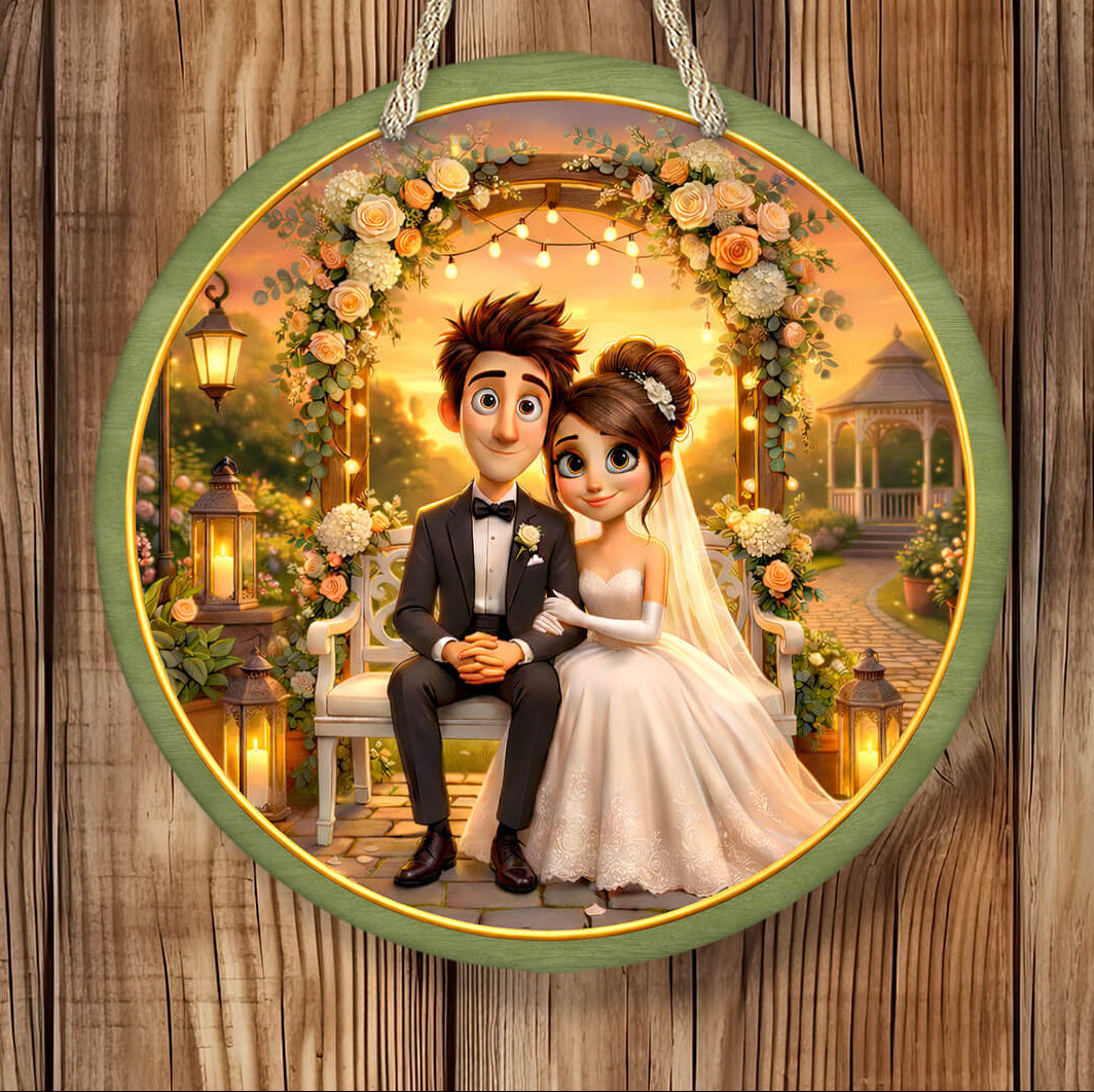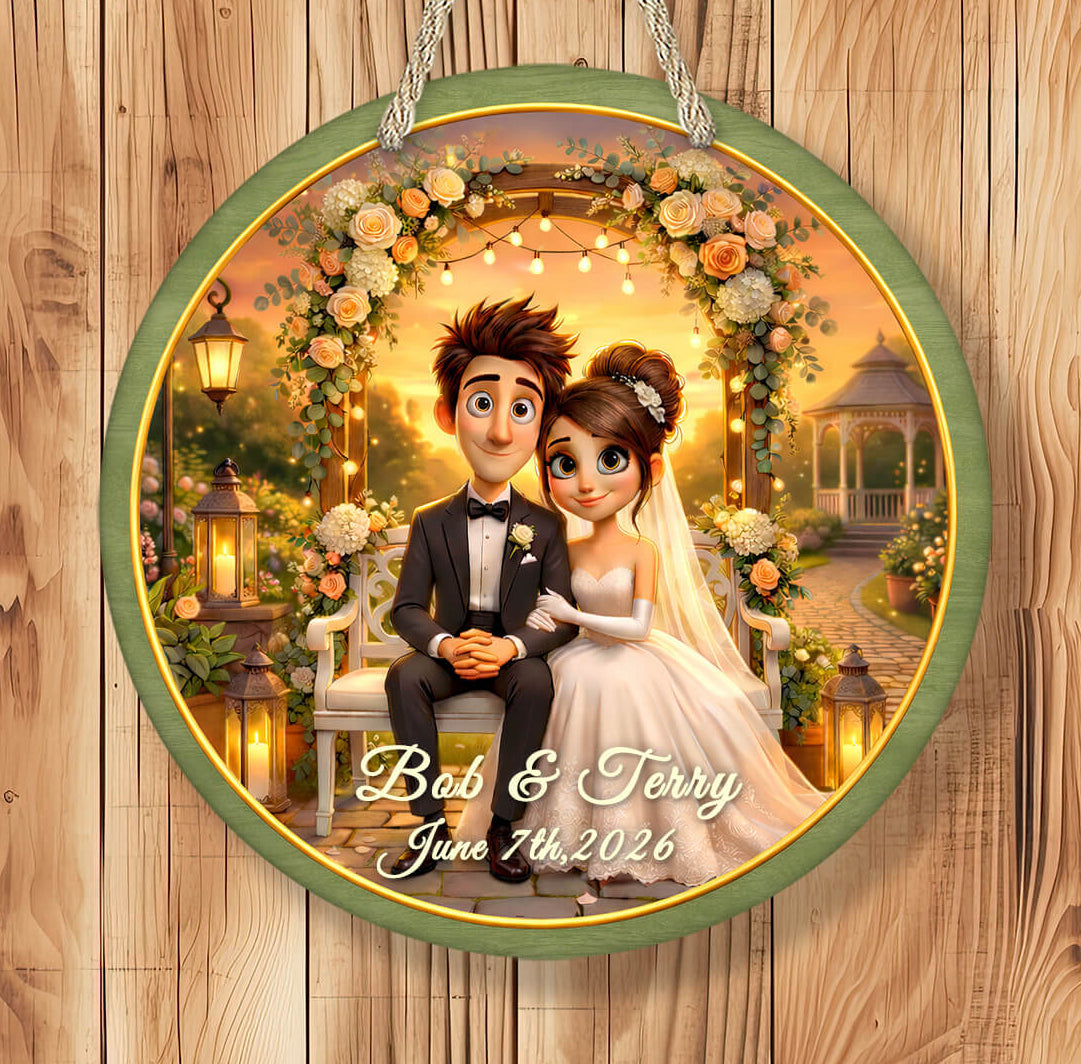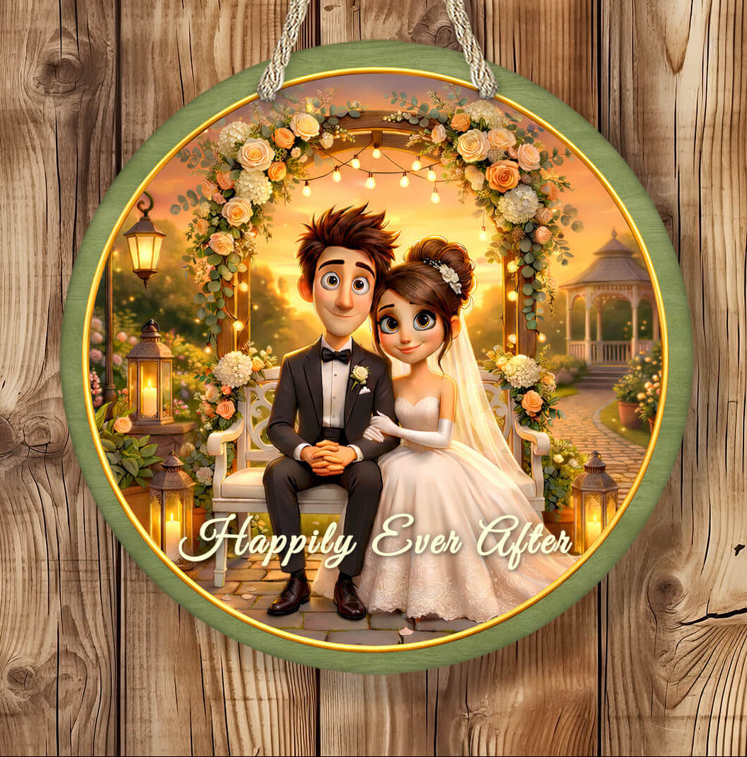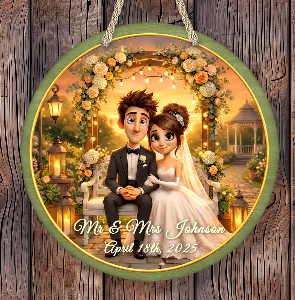 Celebrate your love story with a beautifully personalized wedding sign featuring a custom bride and groom portrait in a romantic floral setting. This sign becomes a treasured keepsake long after the wedding day — a reminder of where your forever began.