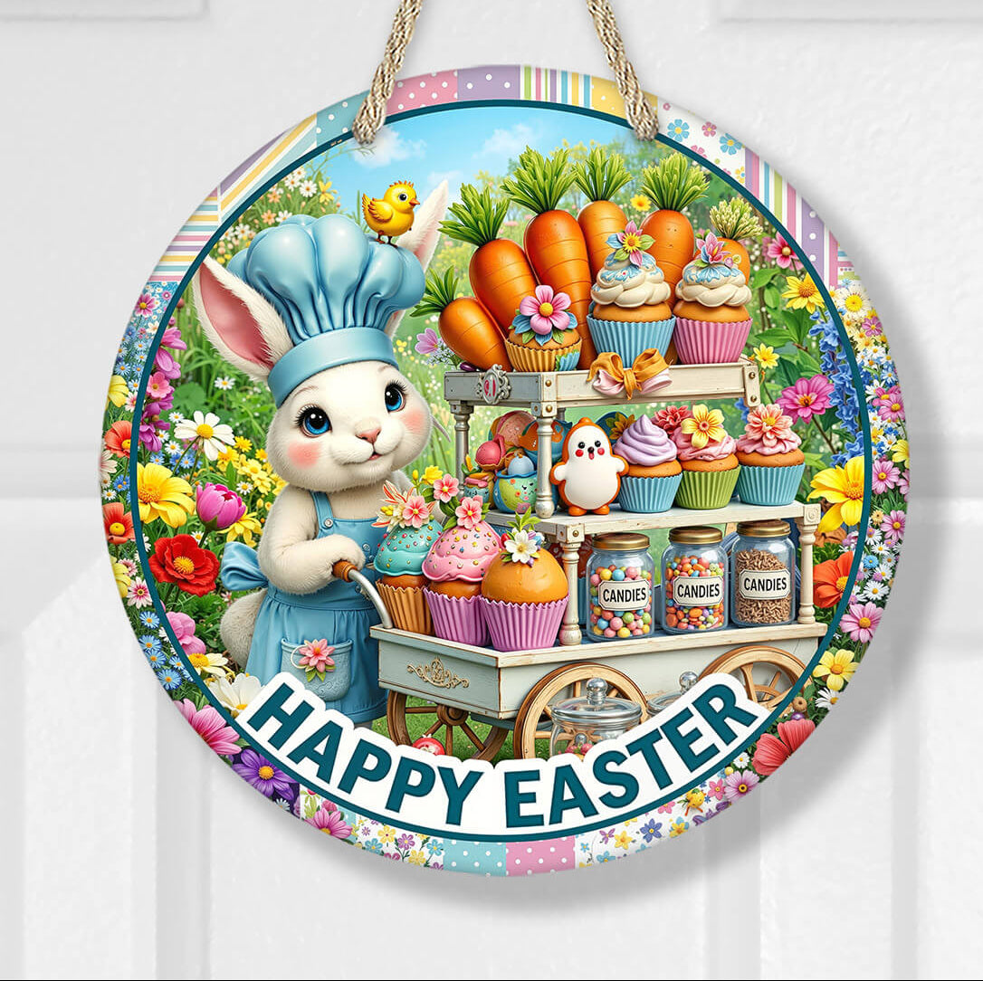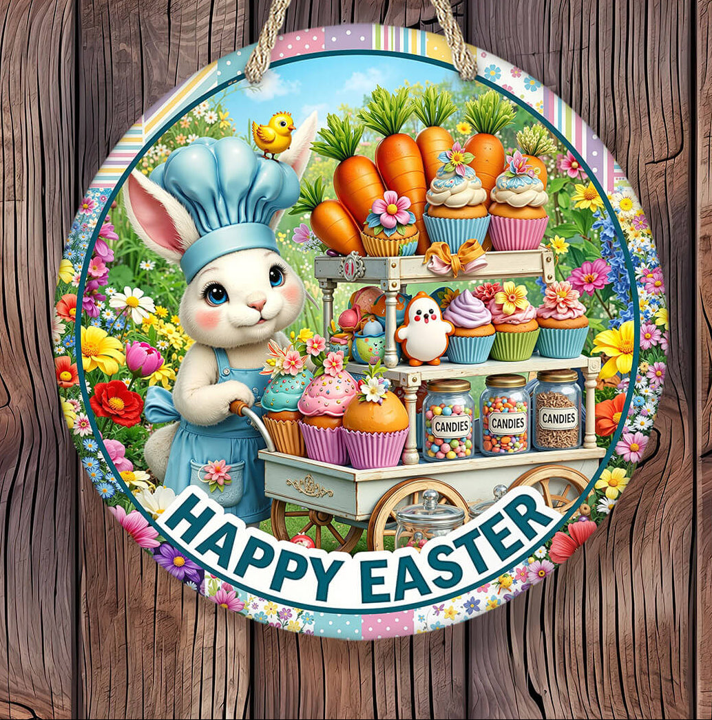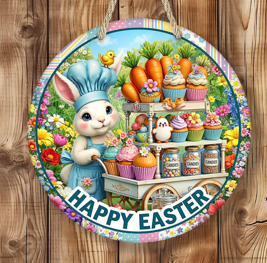 Celebrate spring and Easter with this adorable Happy Easter Bunny Sign, featuring a sweet bunny in a flower garden with a cart of cupcakes in a cozy farmhouse garden scene. With soft pastel colors, florals, and charming details, this sign brings warmth, joy, and seasonal cheer to any space.