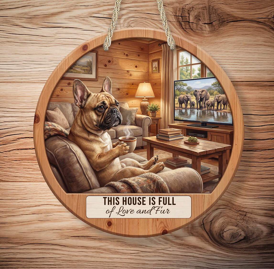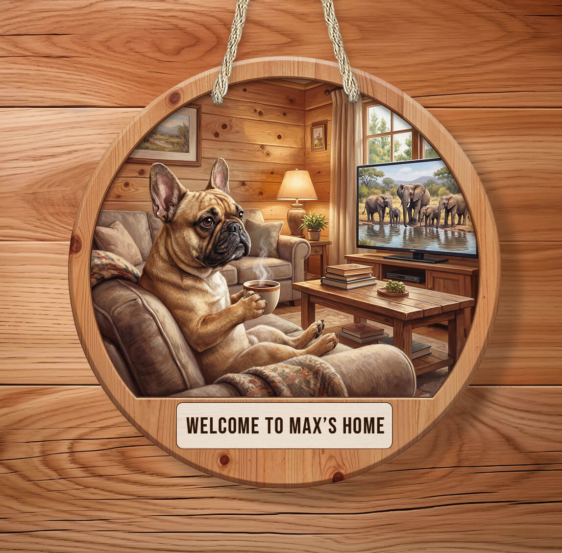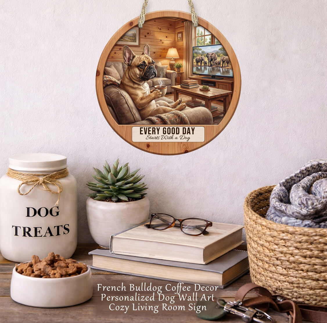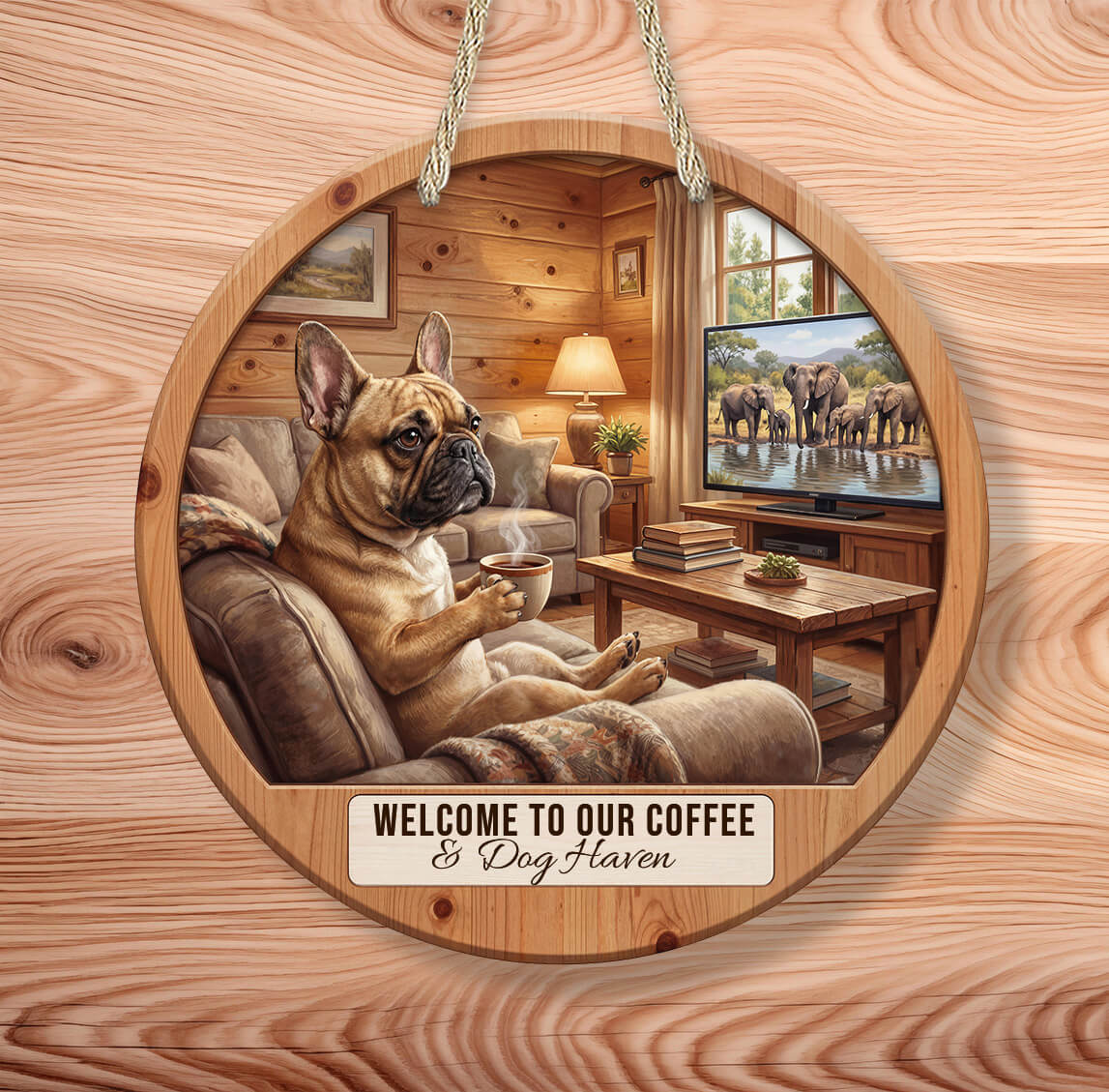 Perfect for French bulldog lovers, coffee enthusiasts, and cozy home décor fans, this round sign blends personality, comfort, and premium design — made to stand out in living rooms, dens, offices, or reading nooks.