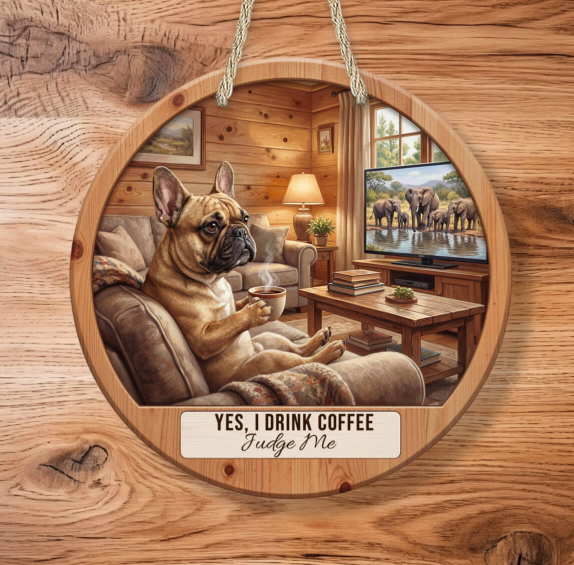 Bring cozy charm and a little humor into your home with this French Bulldog coffee wall sign, featuring a relaxed Frenchie enjoying a cup of coffee in a warm, cabin-style living room.