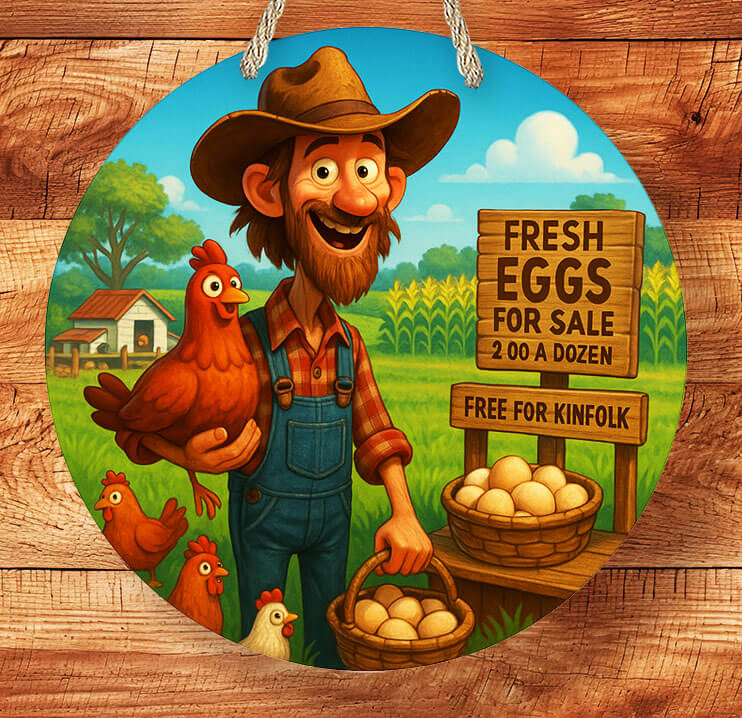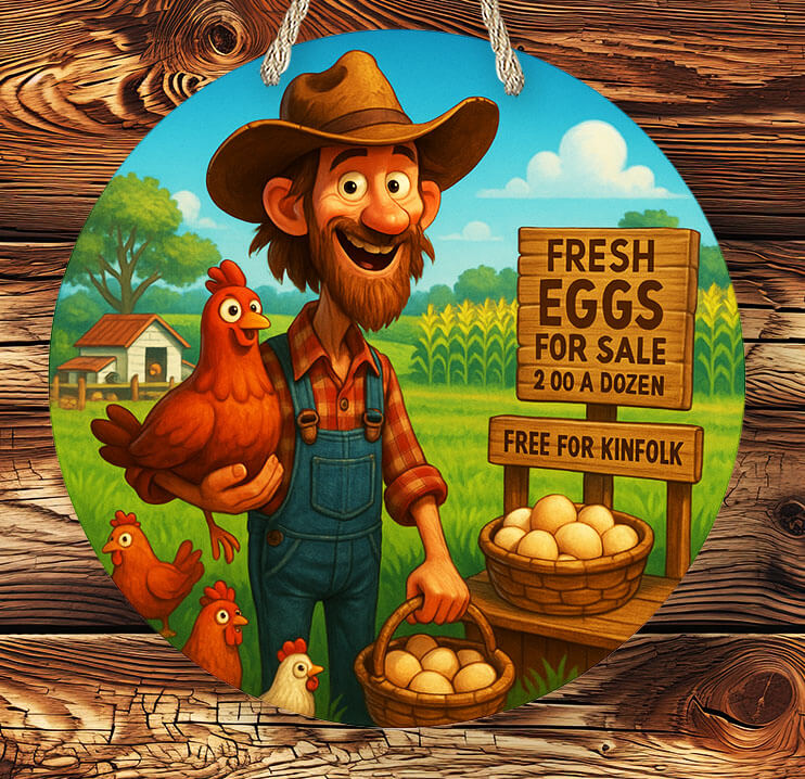 Add a touch of country humor with this 14-inch round premium hardboard “Hillbilly Fresh Eggs for Sale” sign. Featuring a smiling hillbilly farmer holding a chicken and a basket of eggs, with playful wooden signage reading “Fresh Eggs for Sale – $2.00 a Dozen, Free for Kinfolk”, this vibrant farmhouse-style wall decor brings personality and charm to any space.
