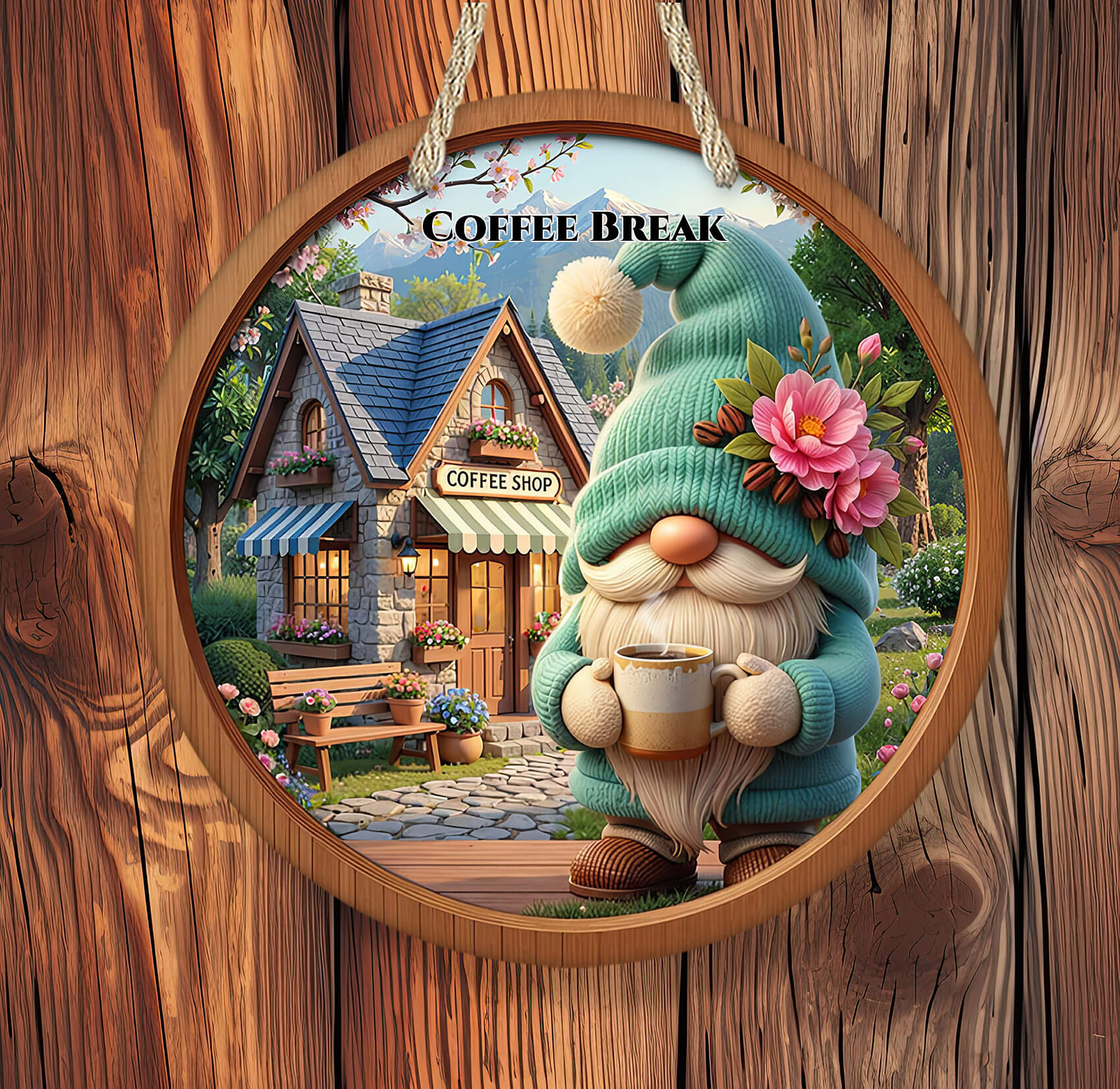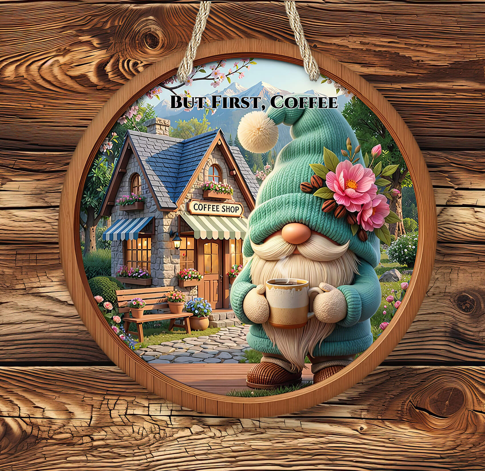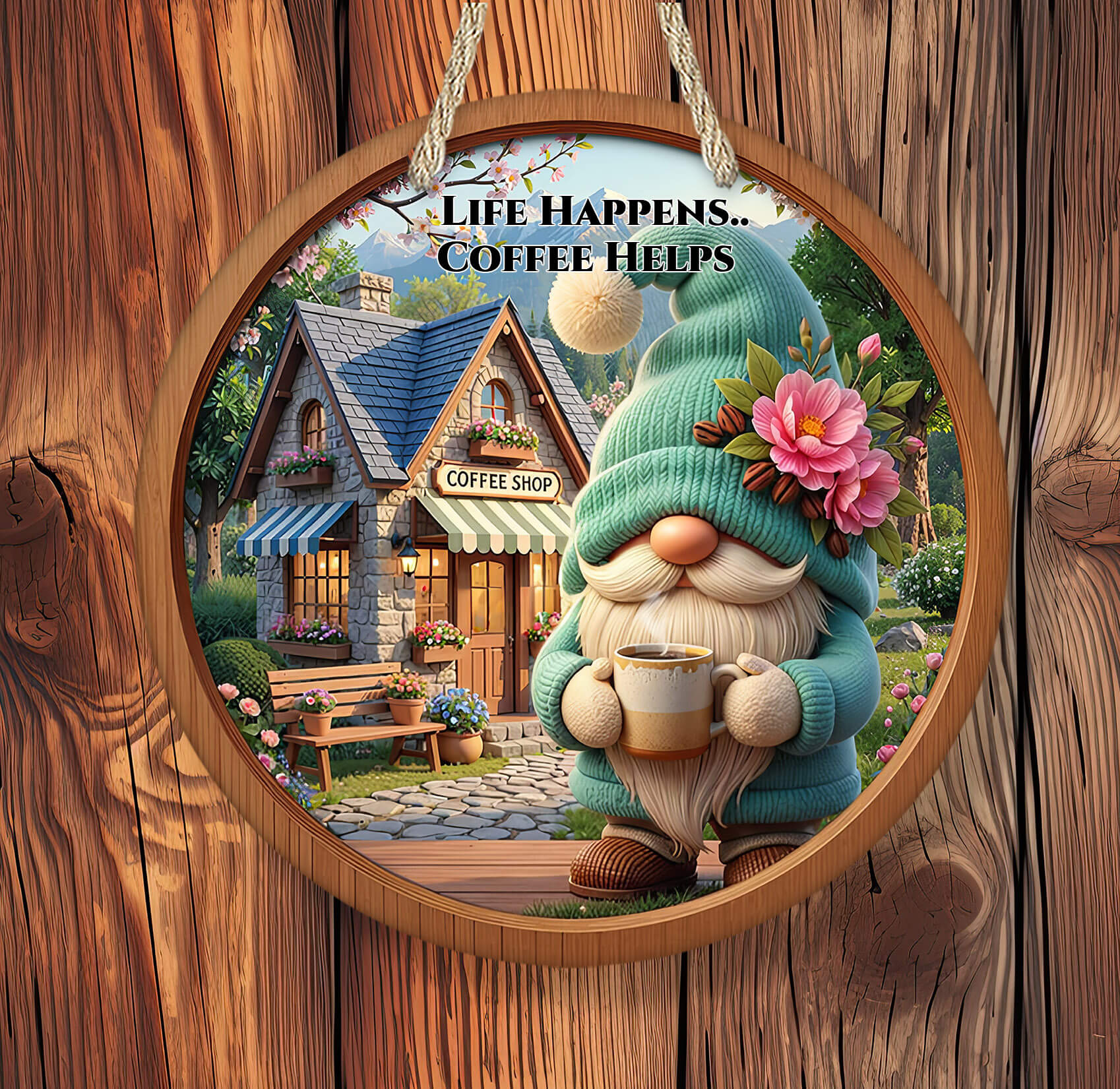 Make it truly yours by customizing the text to anything you choose – ideal for gnome lovers, kitchen décor collectors, or anyone obsessed with caffeine and cottagecore vibes. Made of laser cut mdf-hardboard and measuring 14" round, the design is [ermanently printed into the sign creating a very vibrant colorful high quality sign. These beautiful signs are flat and made to look framed, must be undered a covered area if outdoors.