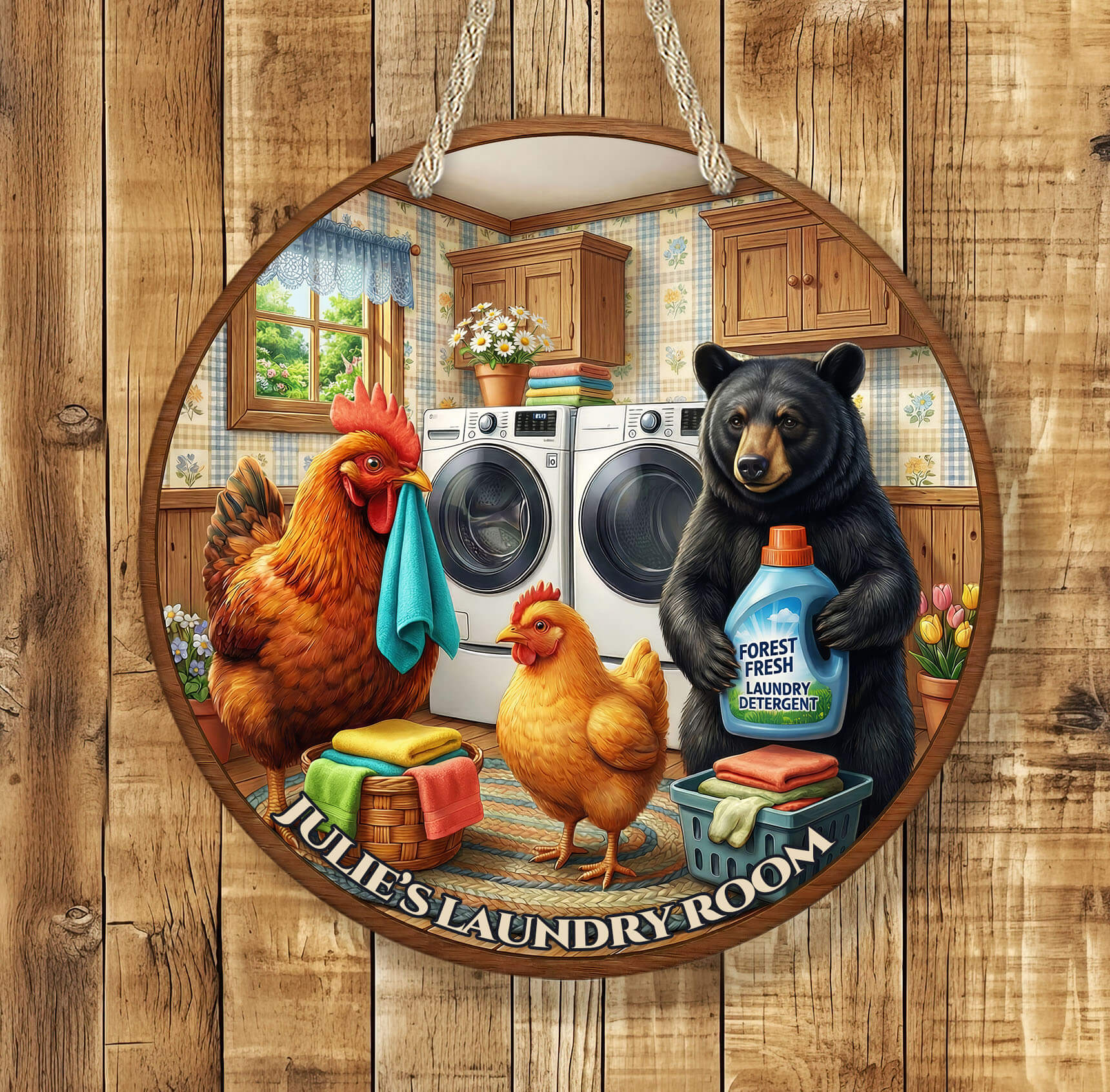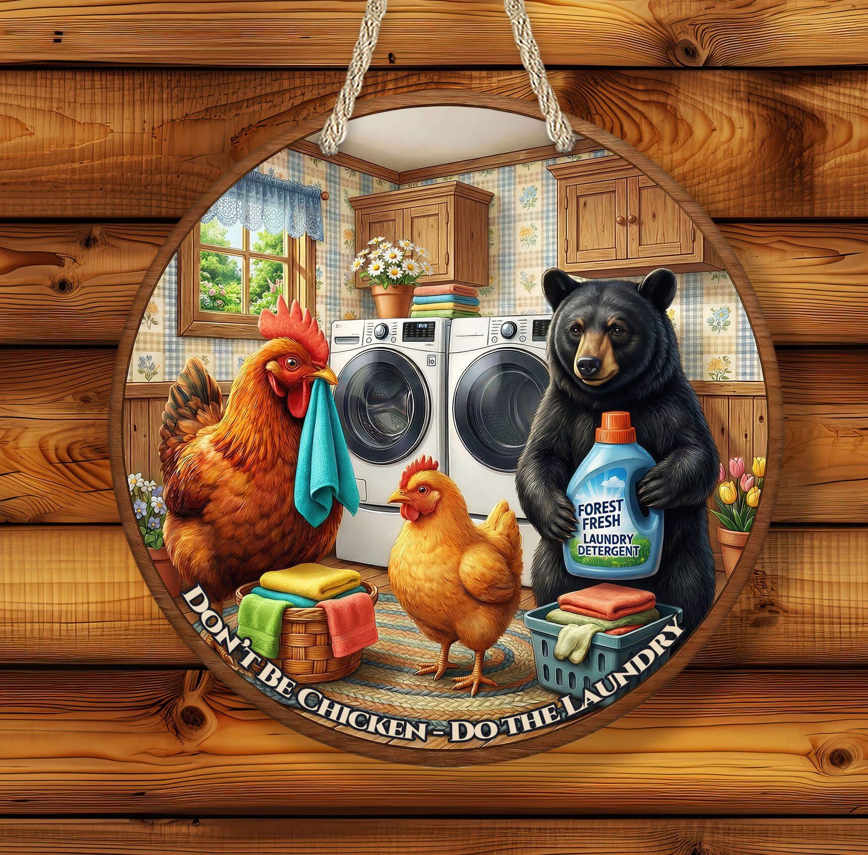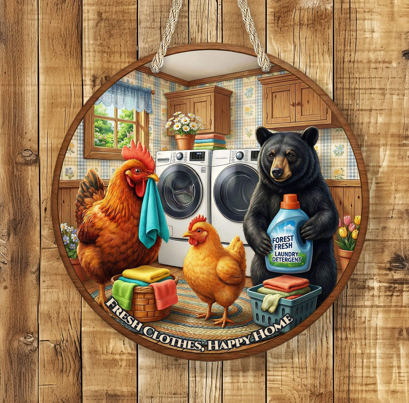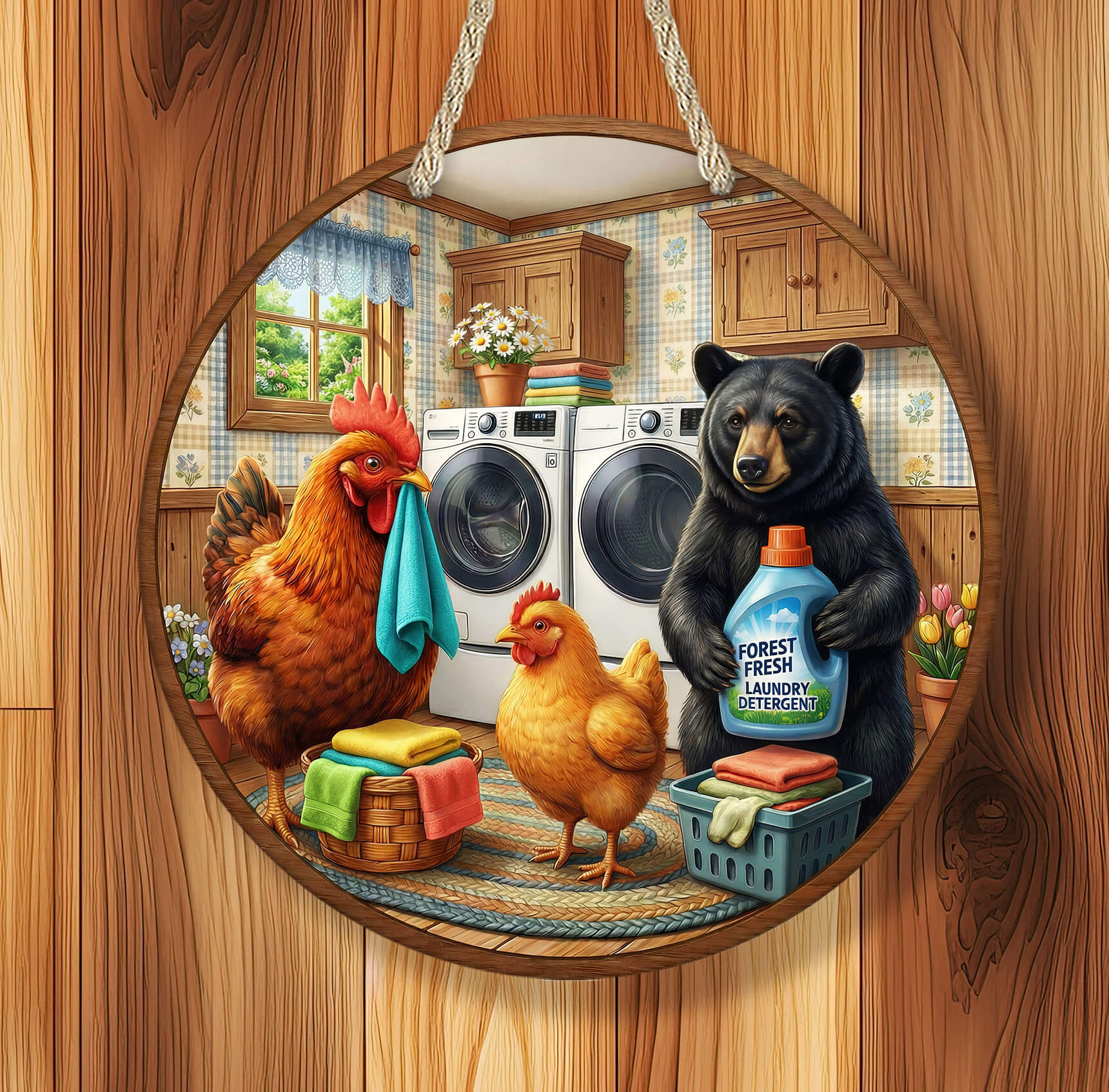 Add a touch of humor and rustic charm to your laundry space with this adorable farmhouse-style laundry room sign! Featuring a lovable black bear holding detergent while two charming chickens manage the wash, this cozy cabin scene is full of warmth, personality, and clean fun.