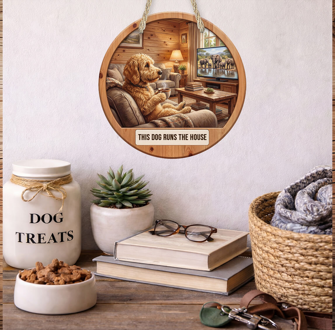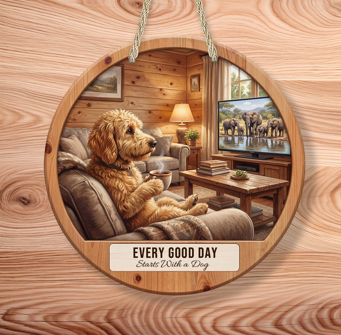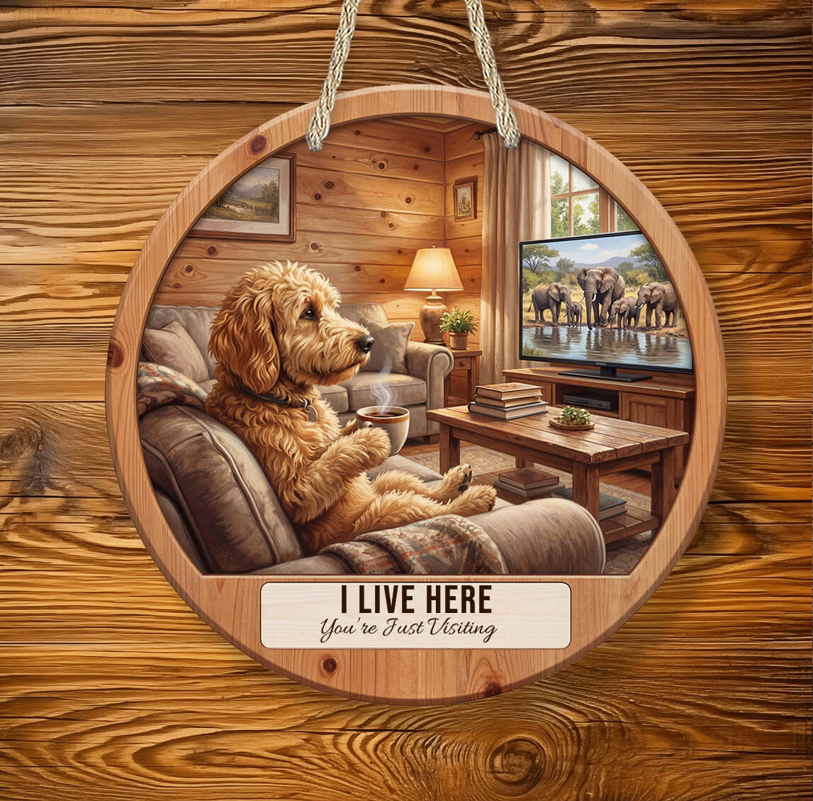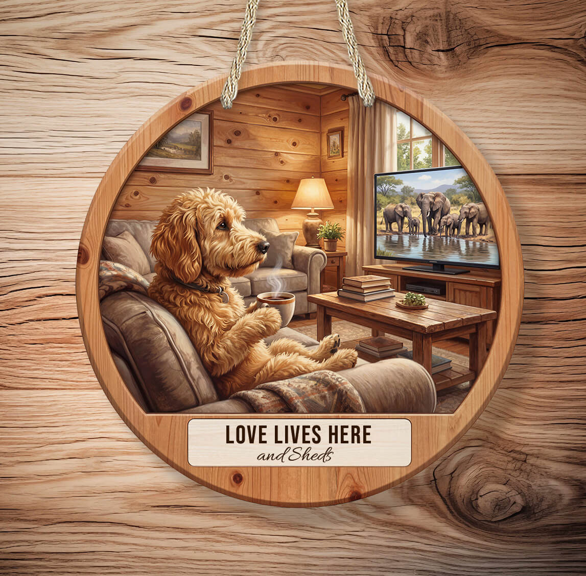 Designed with warm wood textures, soft lighting, and a relaxed lifestyle feel, this goldendoodle sign makes the perfect statement piece for: