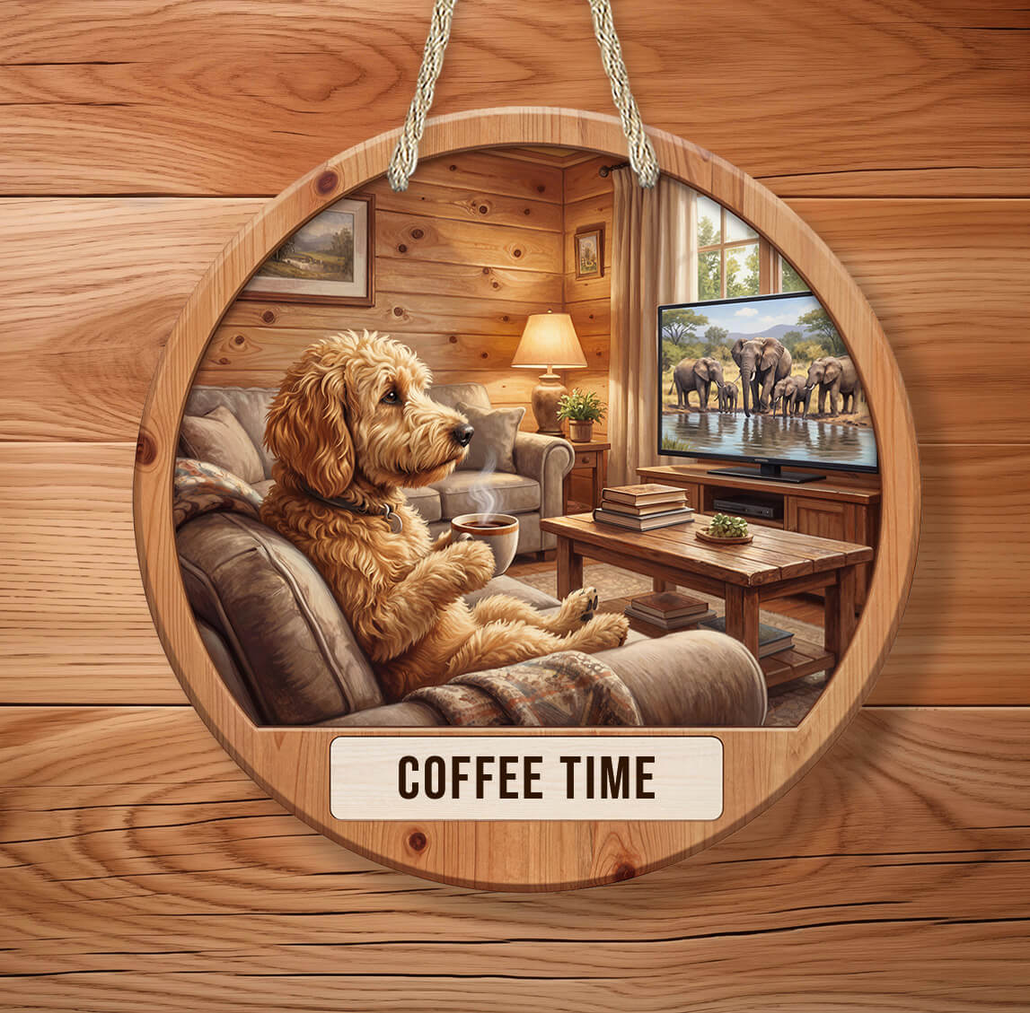 This custom goldendoodle and coffee dog wall sign features a charming, cozy living room scene with your chosen dog breed and personalized name, paired with any text you like printed into the sign on the bottom as shown. Made in the USA from laser cut hardboard mdf and made in 14" round sign they come with jute for hanging.