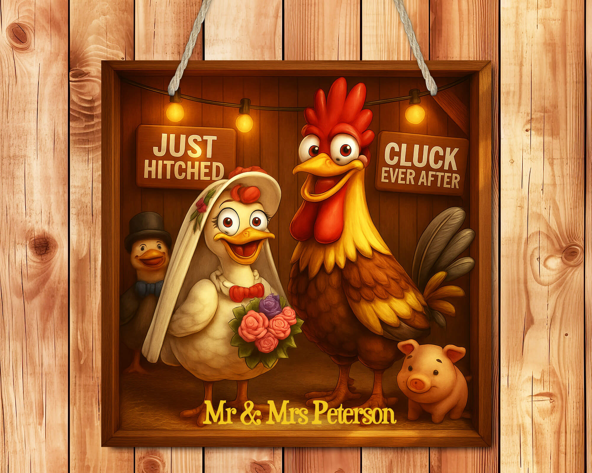 Celebrate love, laughter, and happily-ever-after with this personalized chicken wedding sign! Featuring a bride and groom rooster and hen in rustic farmhouse style, this fun design includes the phrases “Just Hitched” and “Cluck Ever After.” A perfect wedding gift, barnyard kitchen décor, or anniversary keepsake for couples who love humor, animals, and rustic charm. Made of 14" laser cut hardboard and 1/4" thick, the chicken wedding along with your text is dyed into the hardboard creating a gift that will be treasured for years to come.