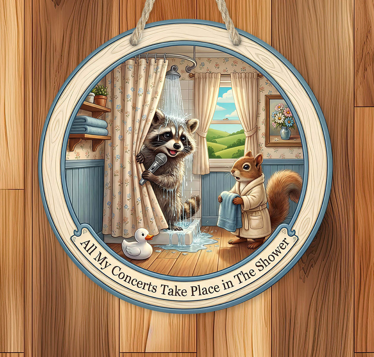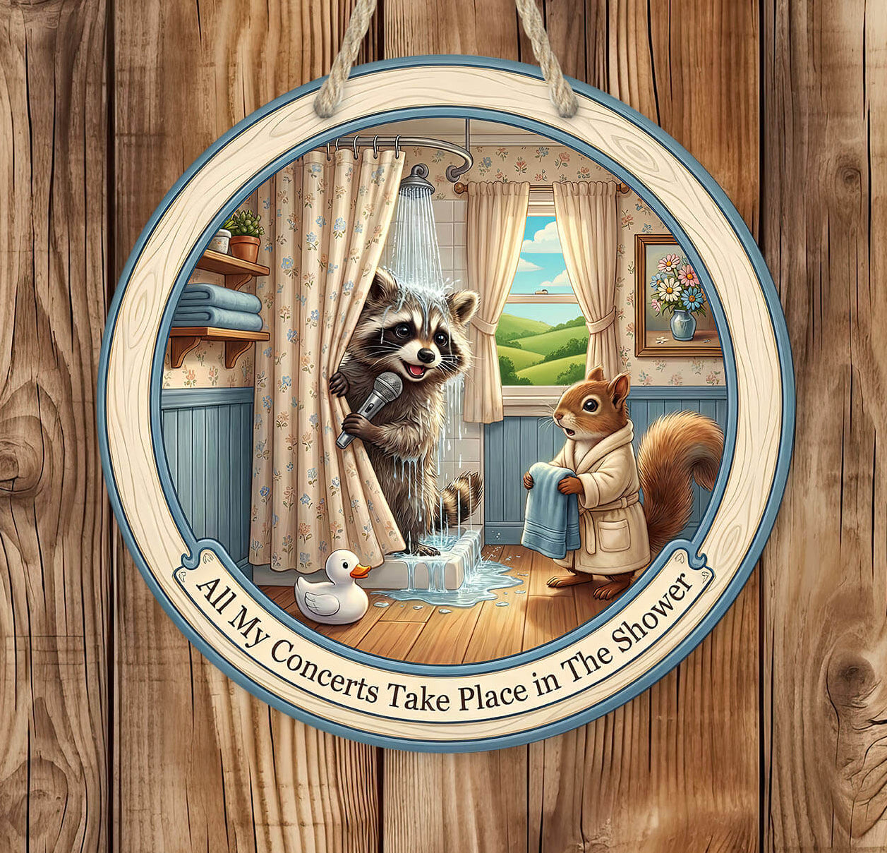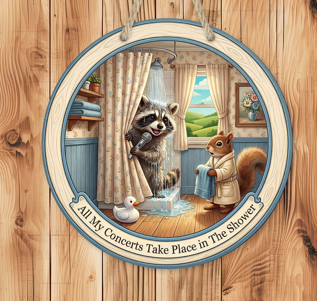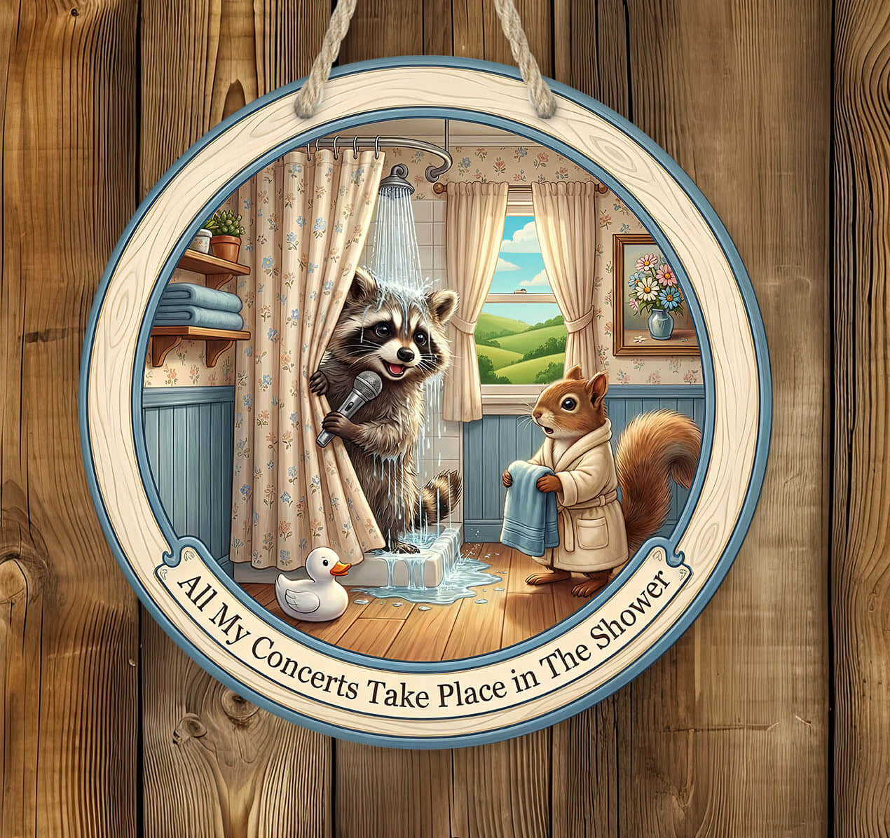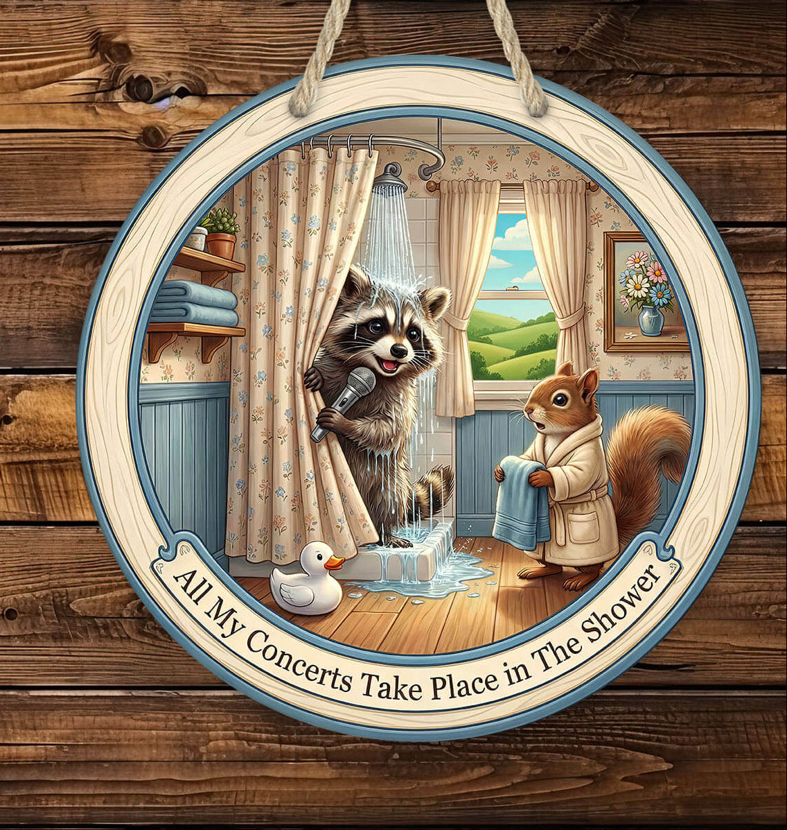 Bring a splash of humor to your washroom with this adorable raccoon shower sign, featuring a singing raccoon holding a microphone behind a curtain, with a squirrel handing a towel. With the phrase “All My Concerts Take Place in The Shower,” this round wooden-style 12" or 14" laser cut mdf hardboard hanging sign is a perfect mix of cute and comedic for all ages.