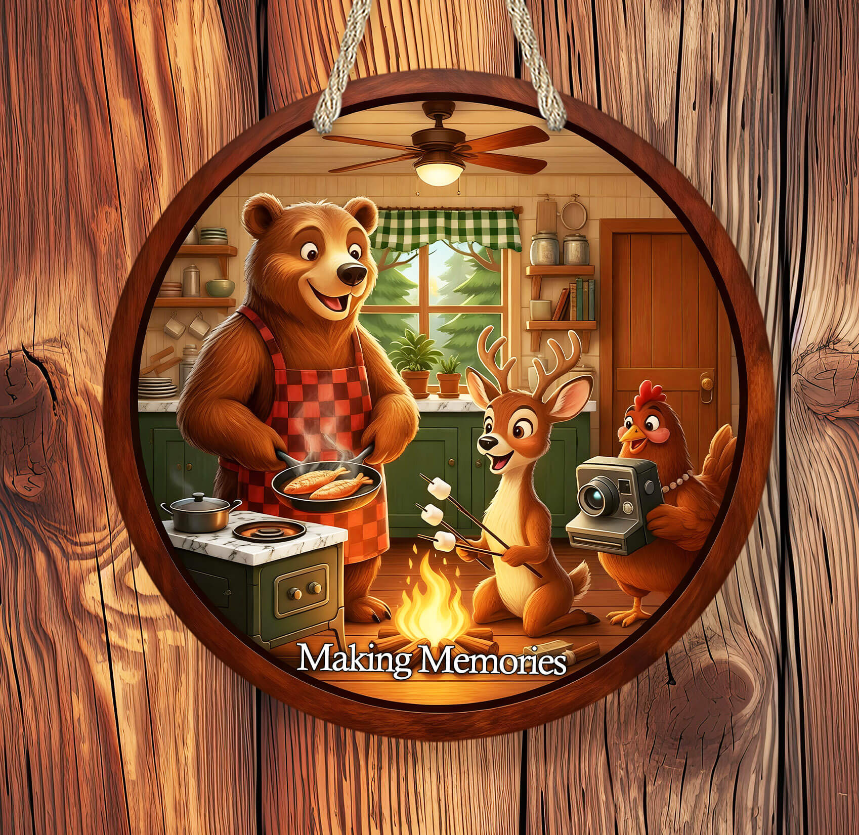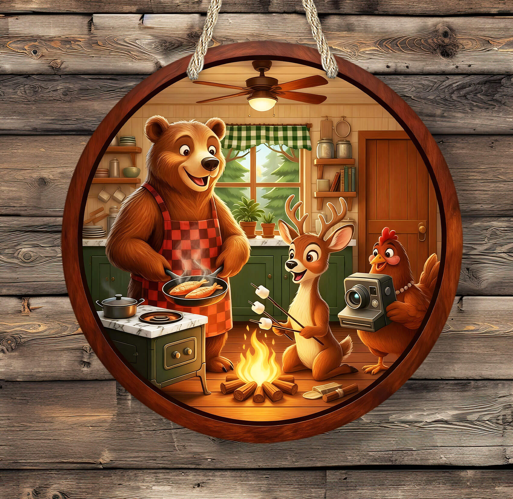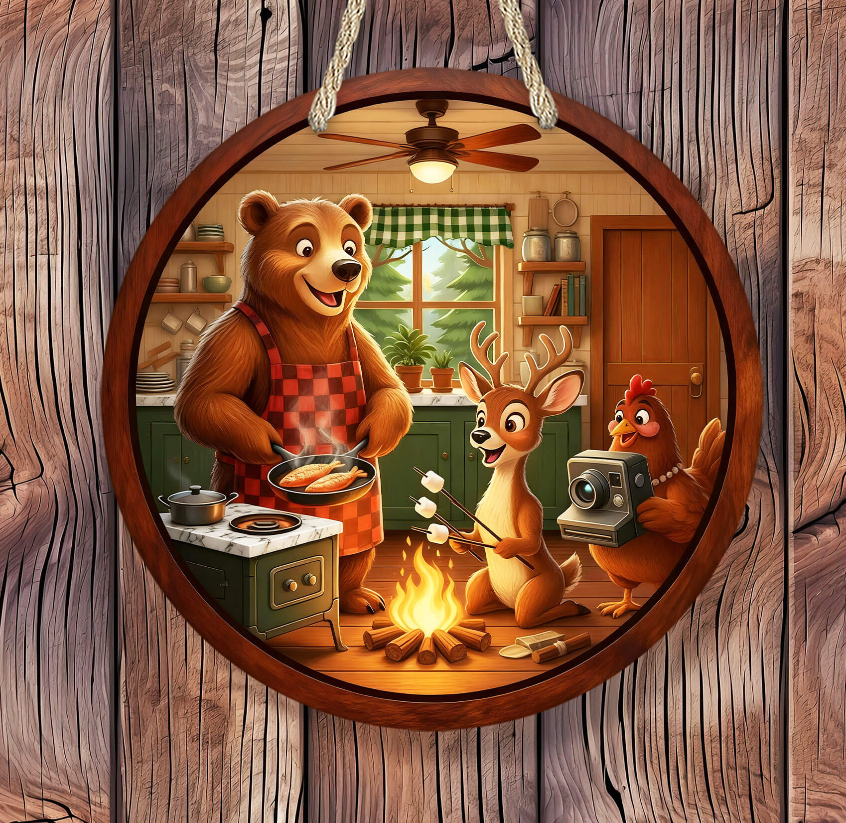 This adorable round MDF sign features a smiling bear fish fry cooking by the campfire with his deer and chicken friends — perfect for adding cozy cabin vibes to any home, kitchen, or lodge.