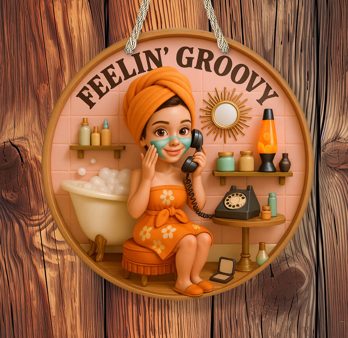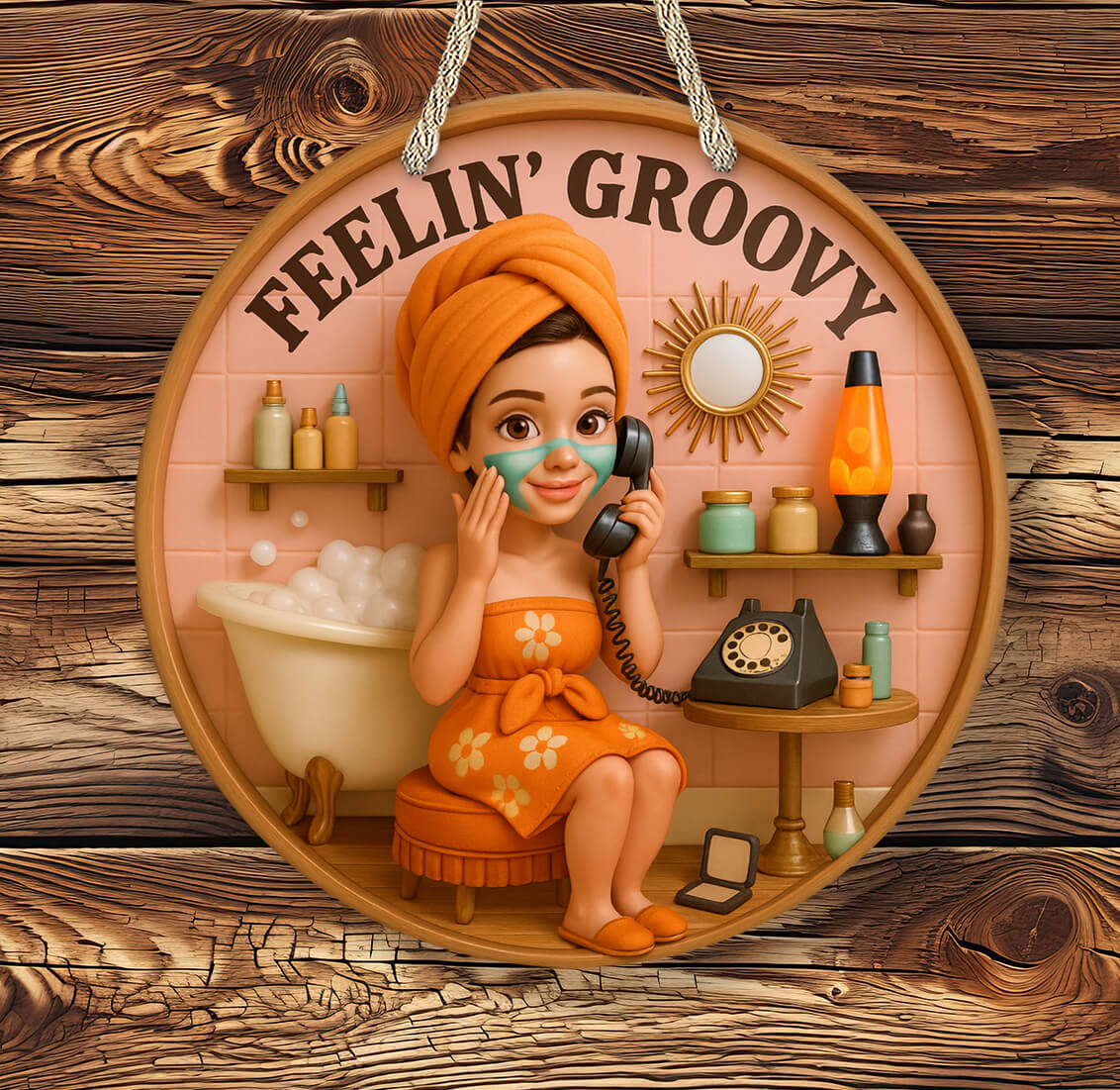 Bring retro vibes and playful charm to your bathroom or spa space with our Feelin’ Groovy Self Care Bathroom Sign! This round wall sign features a groovy 70s-inspired design with a smiling girl in a floral robe, face mask, towel turban, and vintage rotary phone, surrounded by retro décor like a lava lamp, sunburst wall art, and hair dryer.