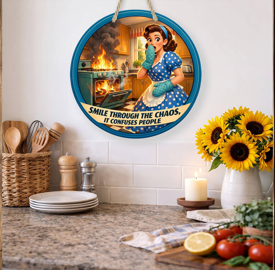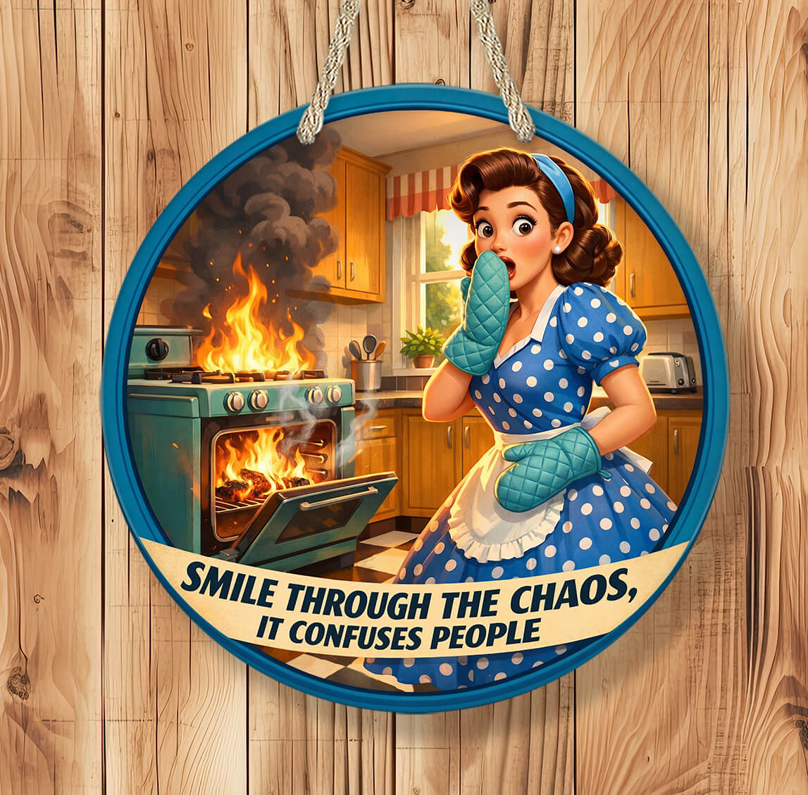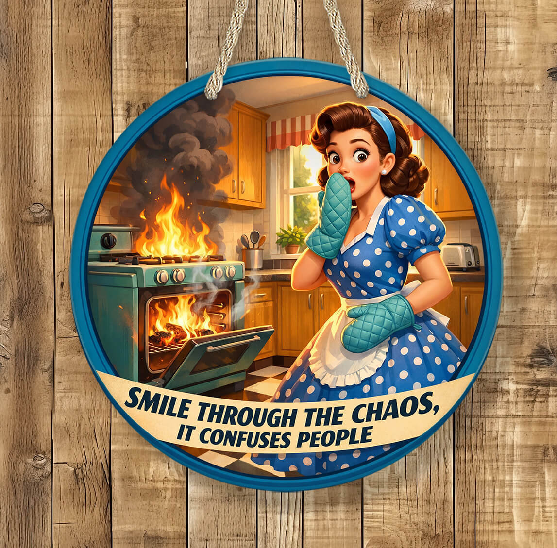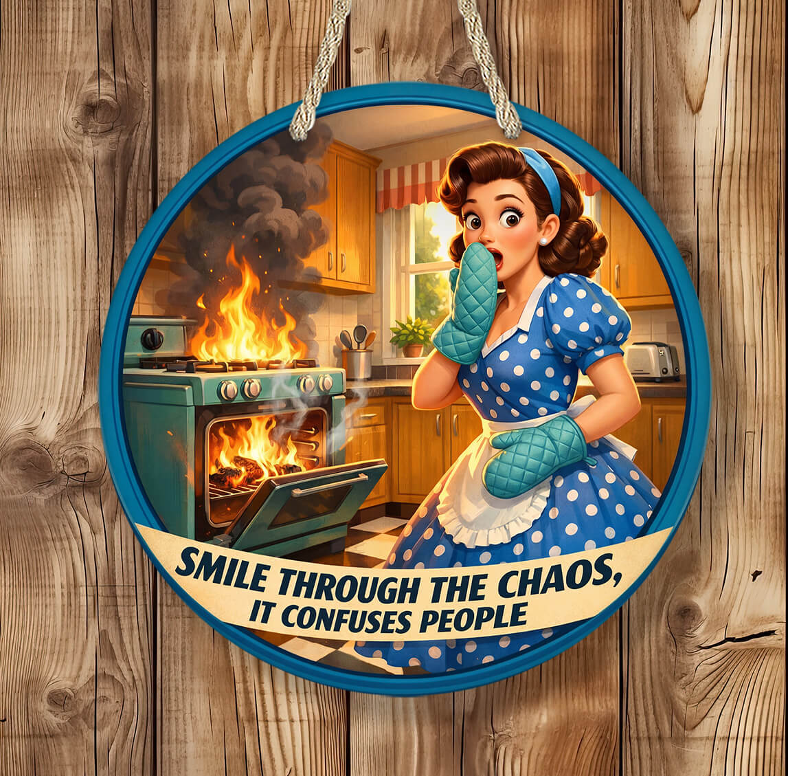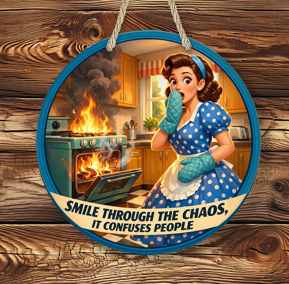 Add retro charm and a little sarcasm to your space with this 1950s-inspired vintage housewife wall sign. Designed in bold mid-century style with playful humor, this piece brings personality to any kitchen, laundry room, or home space.