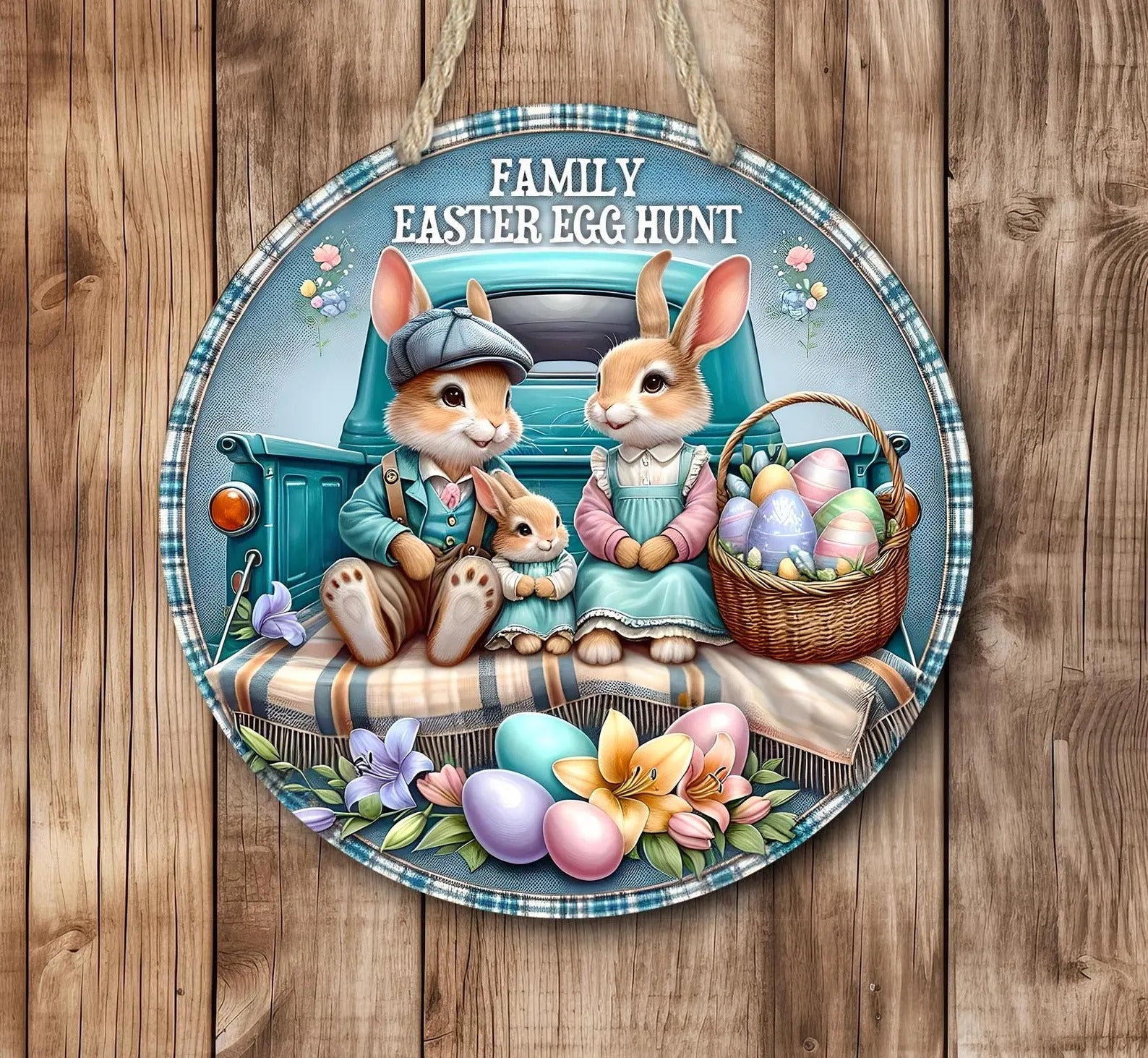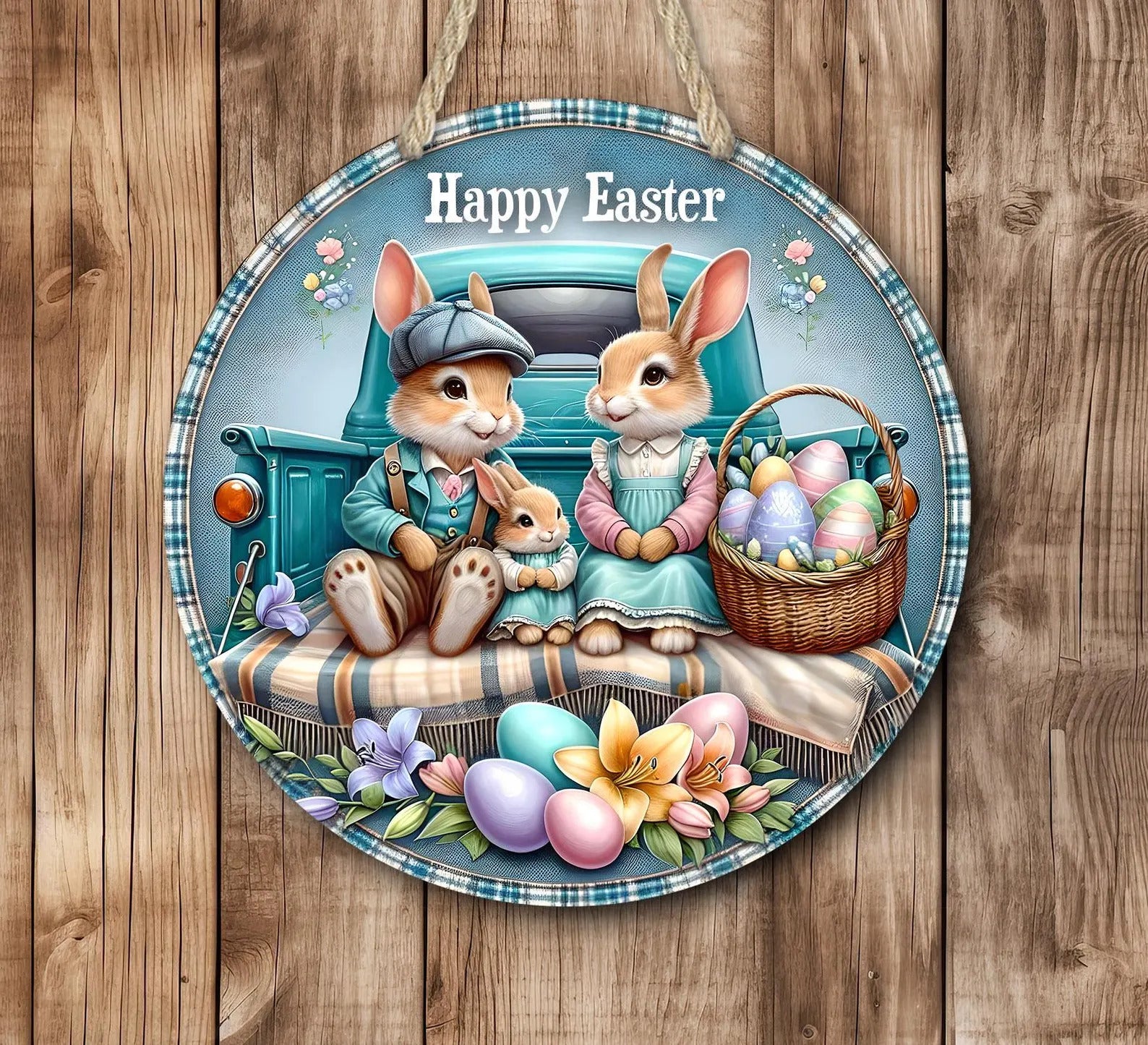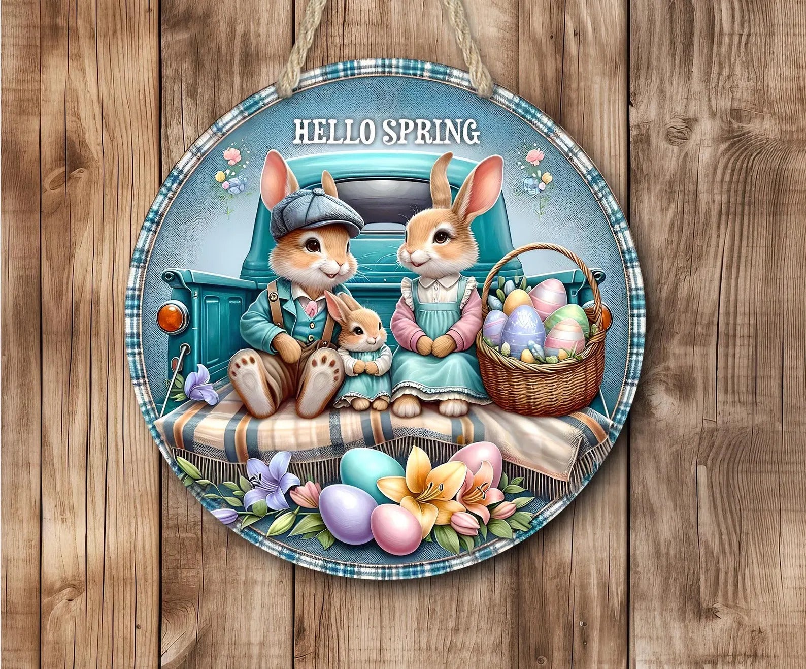 This beautifully crafted round hardboard sign features a charming vintage truck with a bunny family, Easter eggs, and spring flowers, making it the perfect seasonal decoration for your home. Whether youโ€™re celebrating Easter, springtime, or farmhouse decor, this Spring Bunny Sign adds a warm, rustic touch to any space.ย  If outdoors they must be under covered like covered porch or patio and out of the direct elements.ย