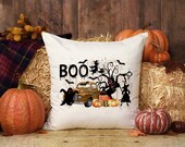 The text on the pillow covers simply reads "Boo," which is a classic and well-known expression associated with Halloween. The word "Boo" is likely to be in a fun and spooky font, adding to the overall Halloween charm of the design.