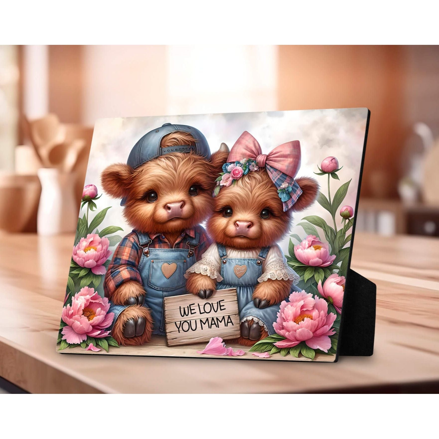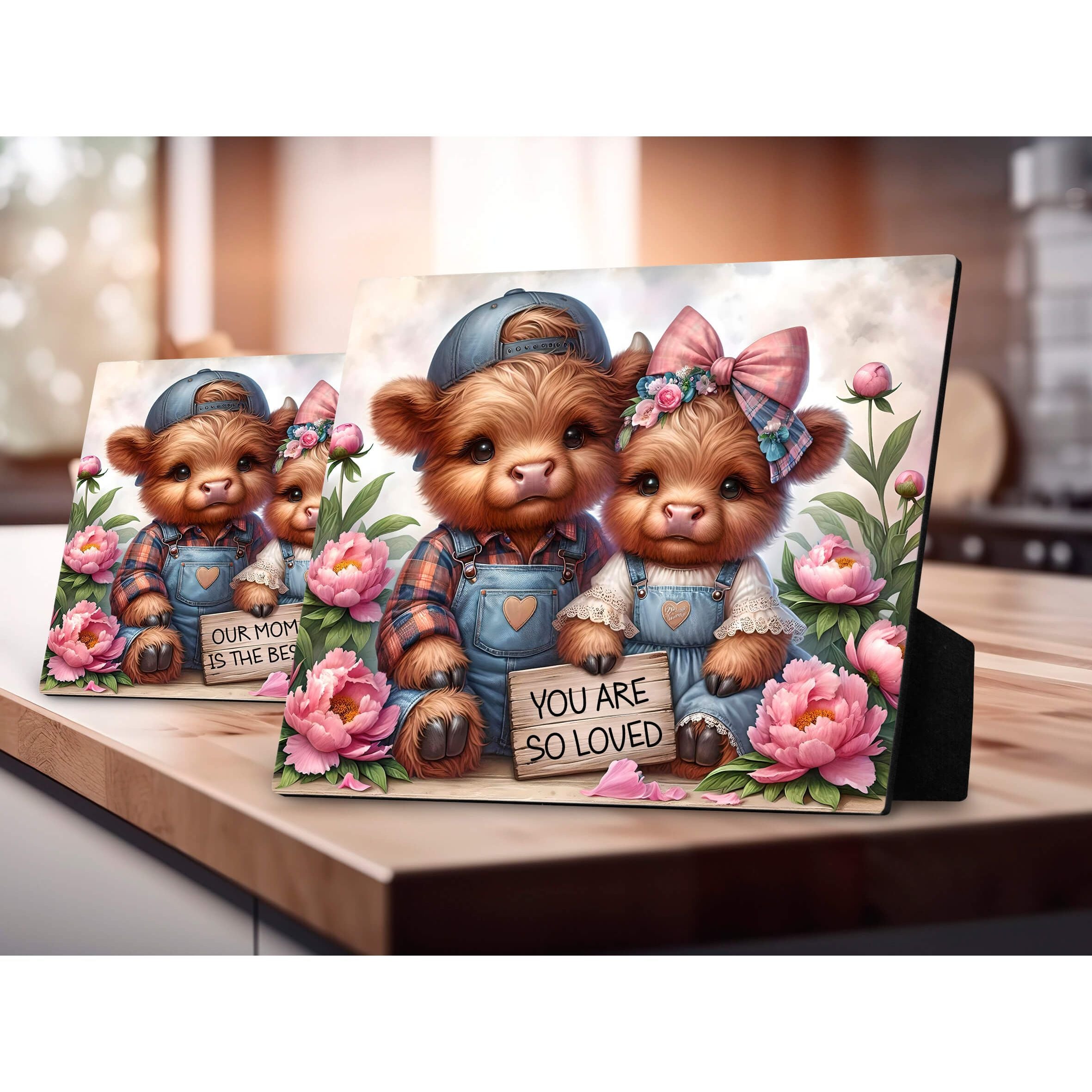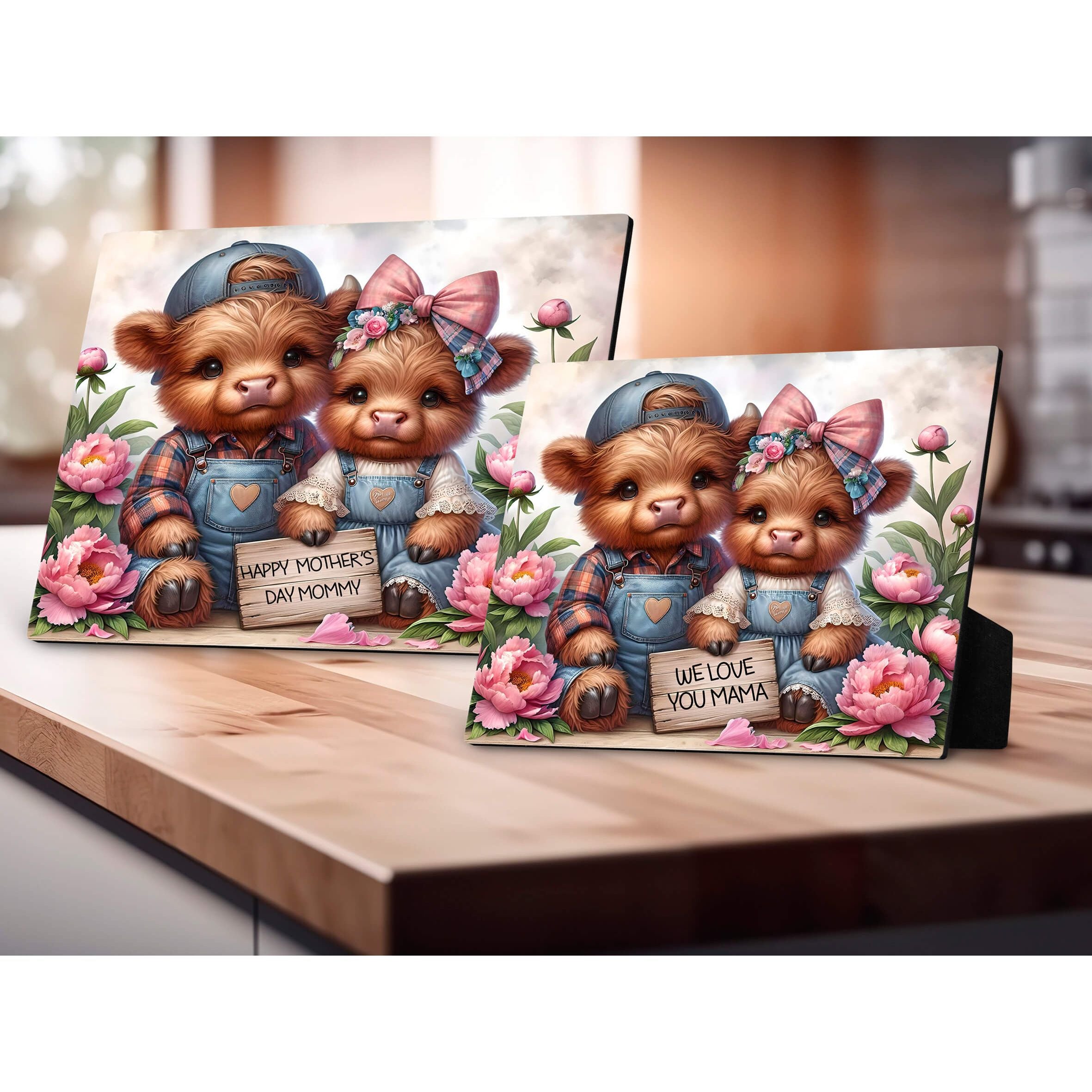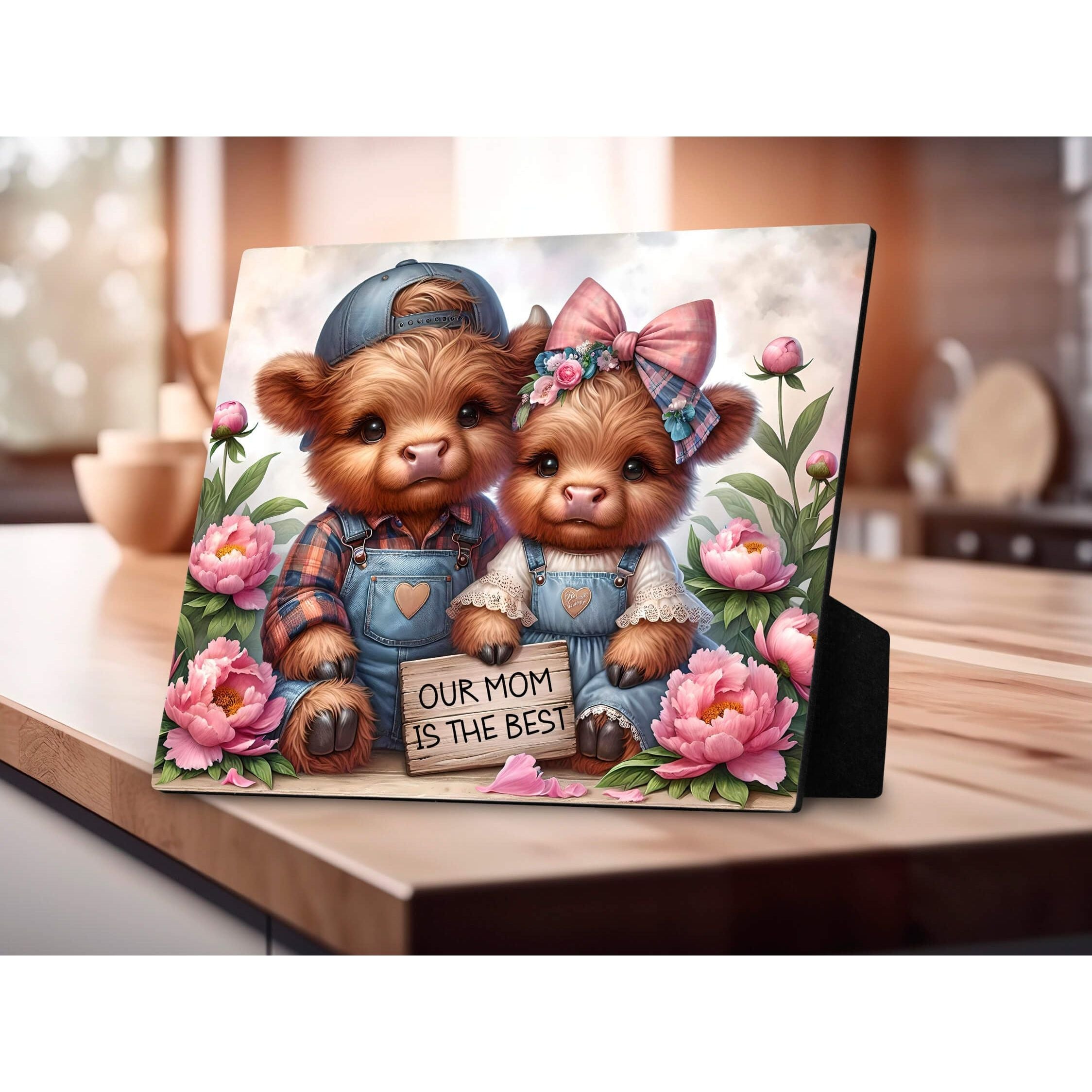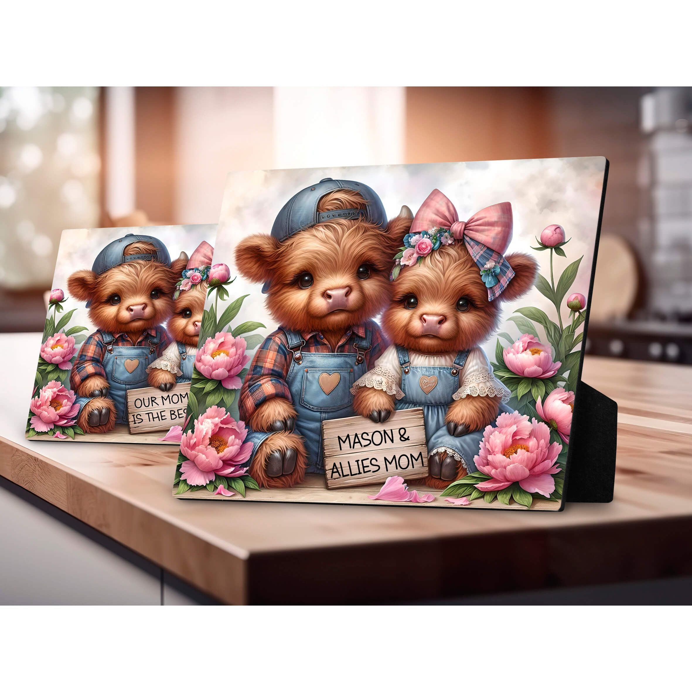 Surprise Mom with the sweetest Mother’s Day gift she’ll never forget — this personalized highland cow calves plaque frame is bursting with charm! Featuring two adorable fluffy highland calves in overalls, nestled in bright pink florals and holding a rustic “Our Mom is the Best” sign or any text you like, this farmhouse-style design brings cozy countryside vibes and heartfelt love. Made of hardboard with an easel attached and available in 5x7 and 8x10 inches permanently printed and such a beautiful gift for anyone.