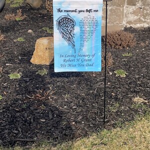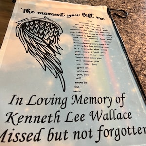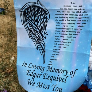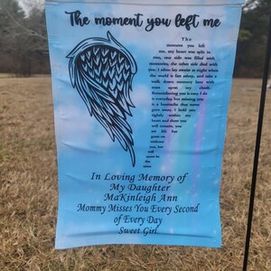 Designed to evoke a sense of serenity and comfort, these In Memory flags feature an Angel wing design, symbolizing protection, guidance, and eternal love. The flags bear the touching inscription, "The moment you left me," accompanied by a heartfelt poem that captures the essence of love, loss, and remembrance.