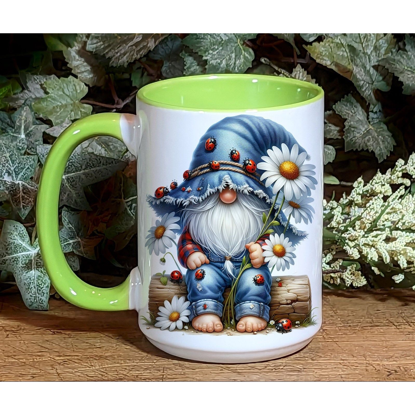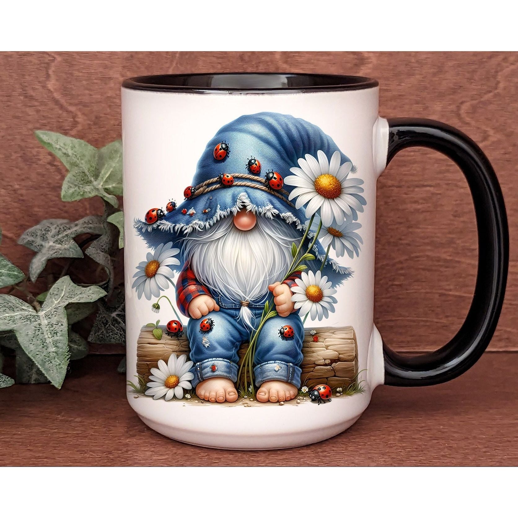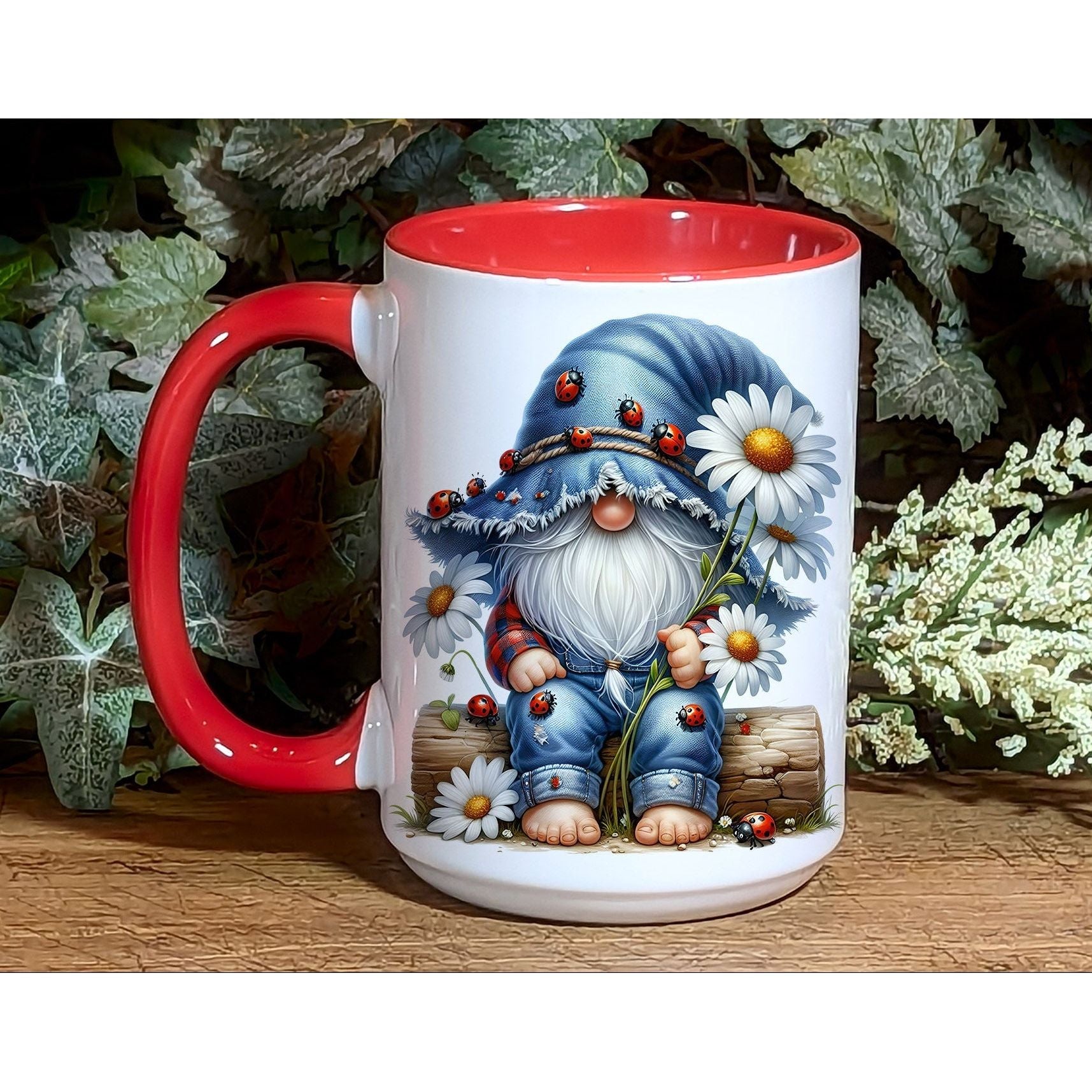 π Charming Gnome Design: Adorably illustrated gnome sitting among daisies, covered in cute ladybugs and rustic textures.