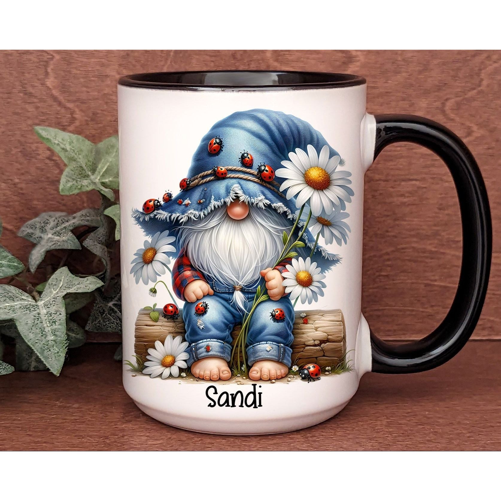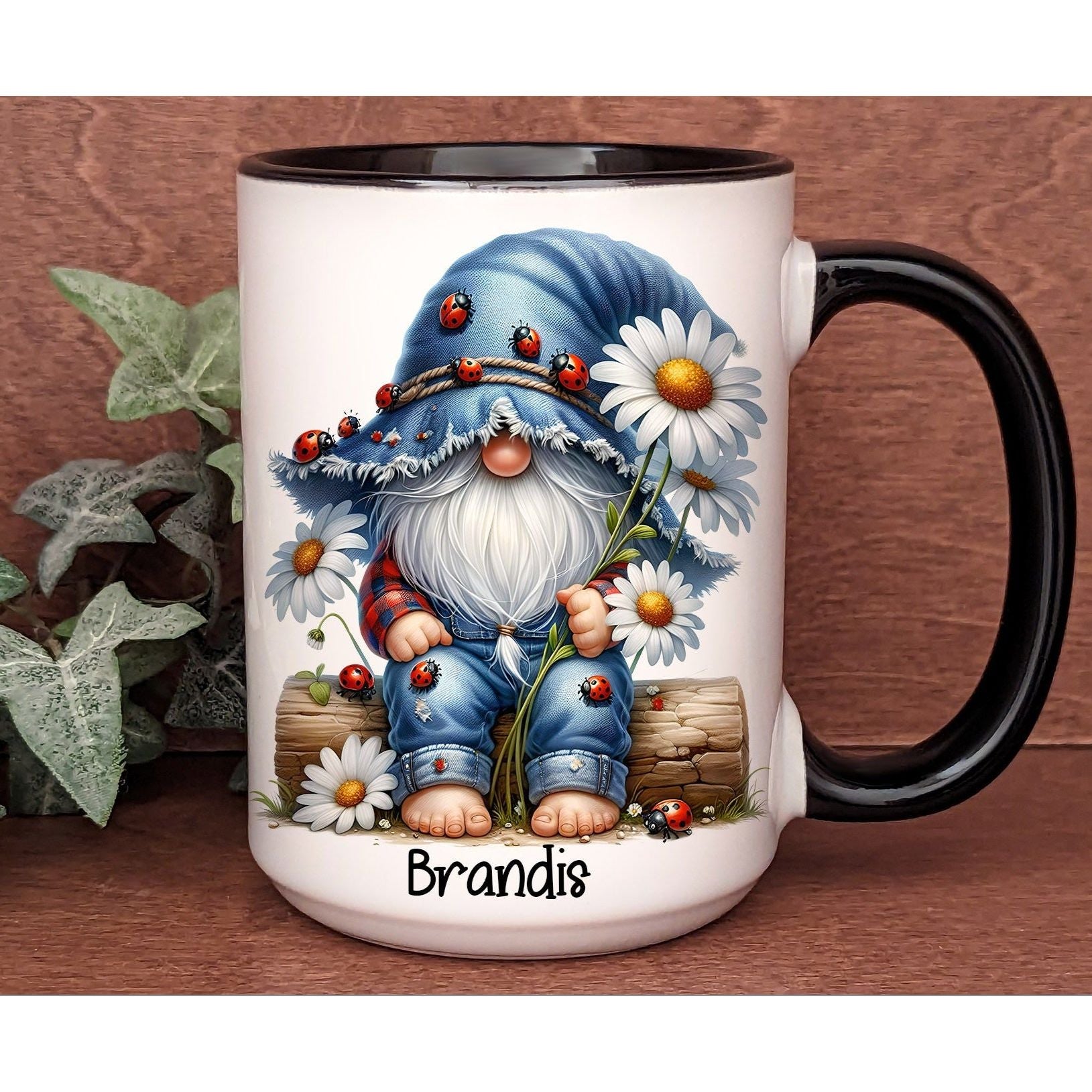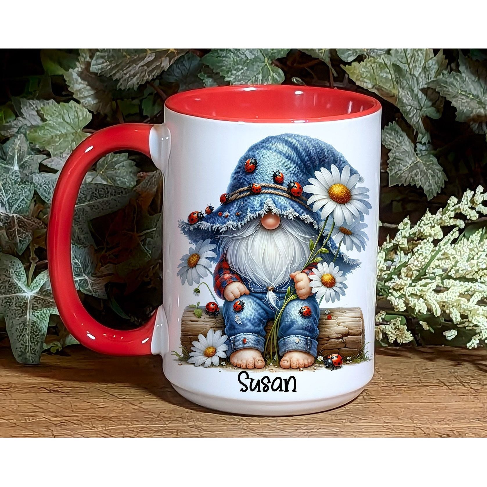 π Charming Gnome Design: Adorably illustrated gnome sitting among daisies, covered in cute ladybugs and rustic textures.