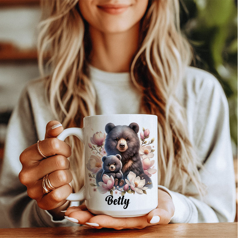 Celebrate the love of motherhood with this beautiful personalized Mama Bear mug, featuring an adorable mom and baby bear surrounded by soft floral artwork. This premium 15oz ceramic coffee mug makes a thoughtful gift for Mother’s Day, birthdays, baby showers, or everyday appreciation.