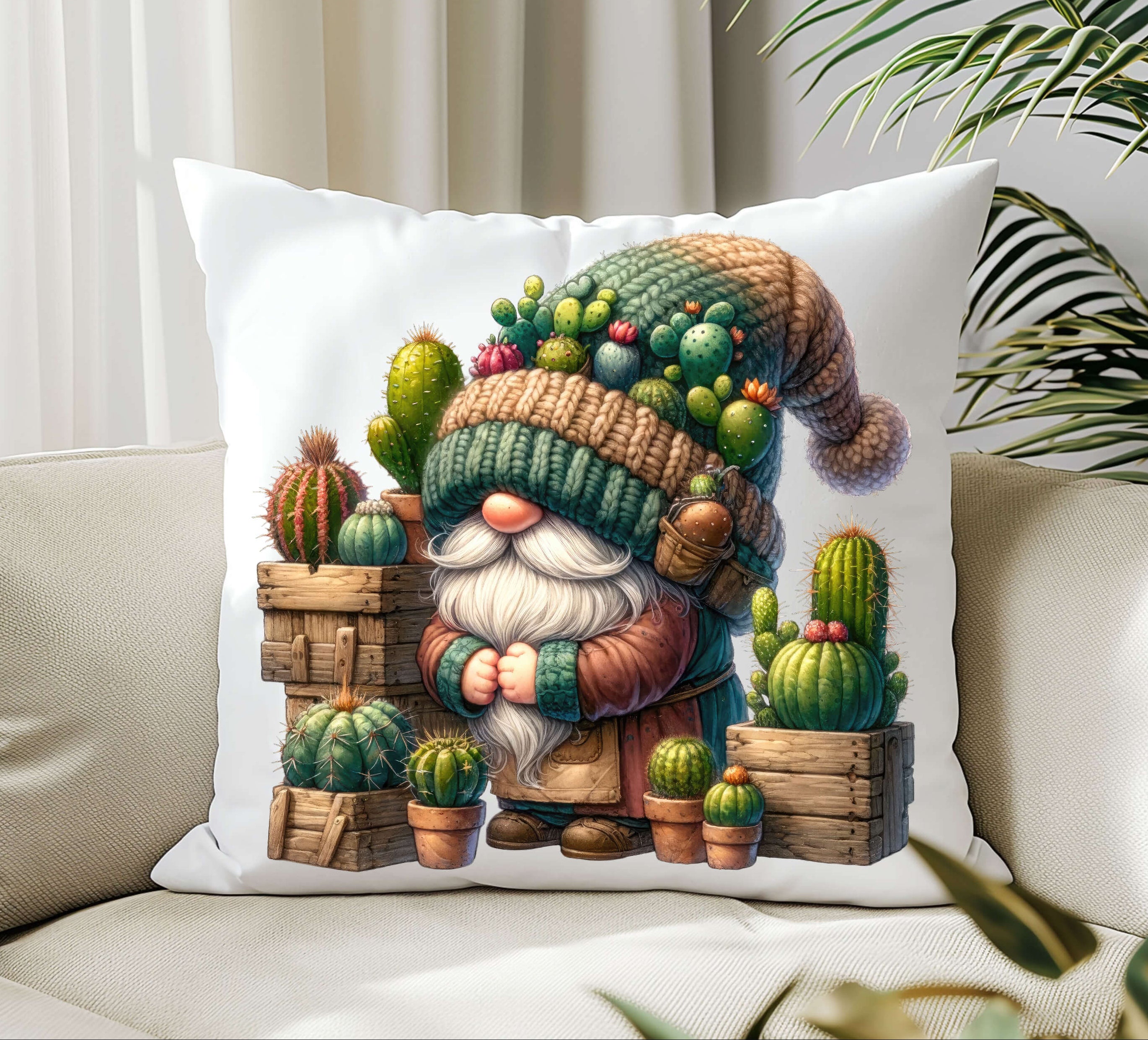 Add a whimsical desert charm to your home with this Personalized Cactus Gnome Pillow Cover! Featuring an adorable bearded gnome wearing a cactus-filled beanie, surrounded by potted succulents and wooden crates, this cozy pillow blends farmhouse warmth with Southwestern flair.