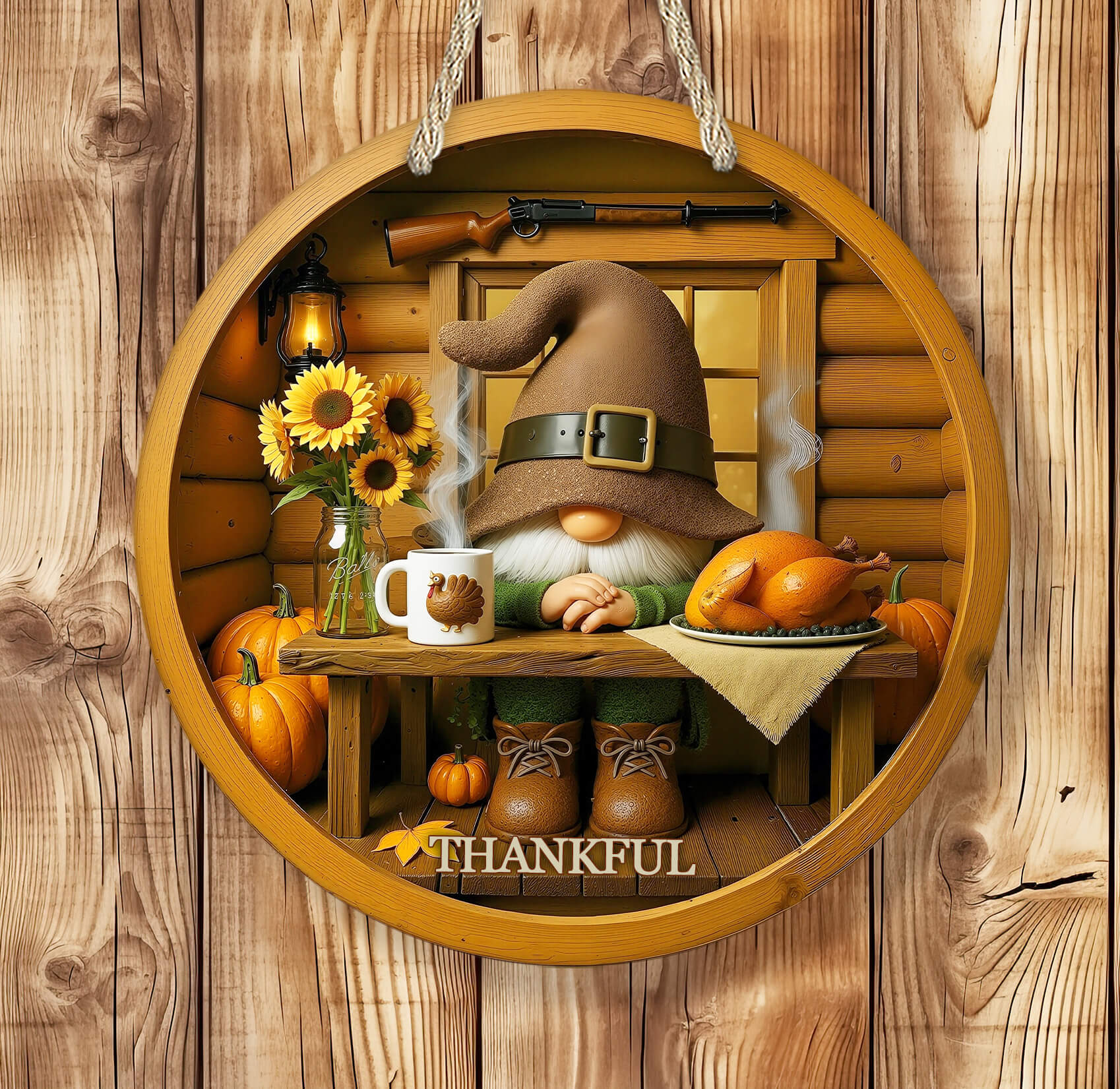 Featuring a charming pilgrim-hat gnome seated at a harvest feast with pumpkins, roasted turkey, steaming coffee, and cheerful sunflowers, this round wooden sign adds warmth and gratitude to any space. Customize it with your family name, special message, or year to create a treasured keepsake for every Thanksgiving.