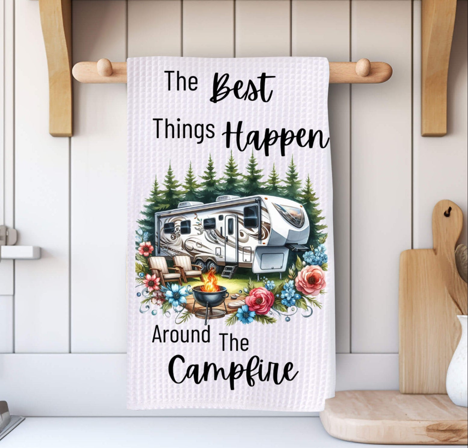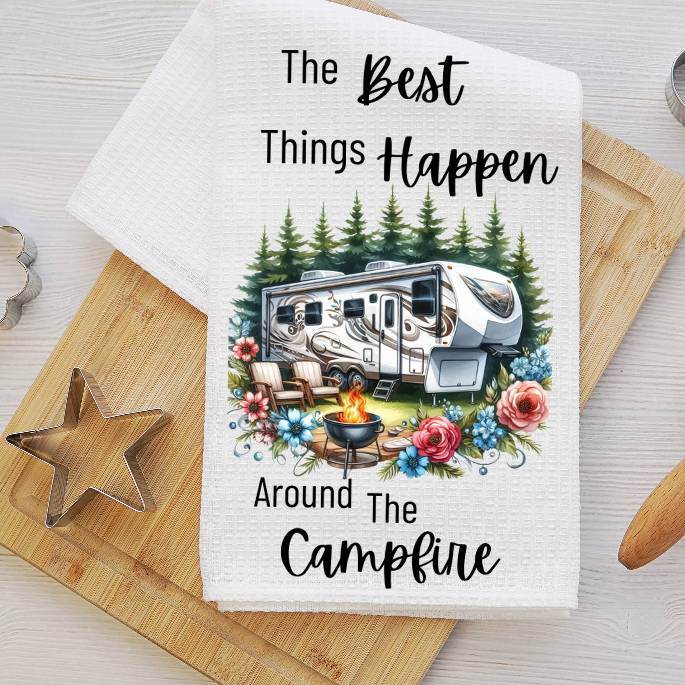 Bring the joy of the great outdoors into your kitchen with this adorable 5th wheel Camping Towel Set! Featuring vibrant camper scenes with campfires, colorful florals, and retro outdoor furniture, these waffle weave towels are perfect for any nature-loving family or full-time RVers.