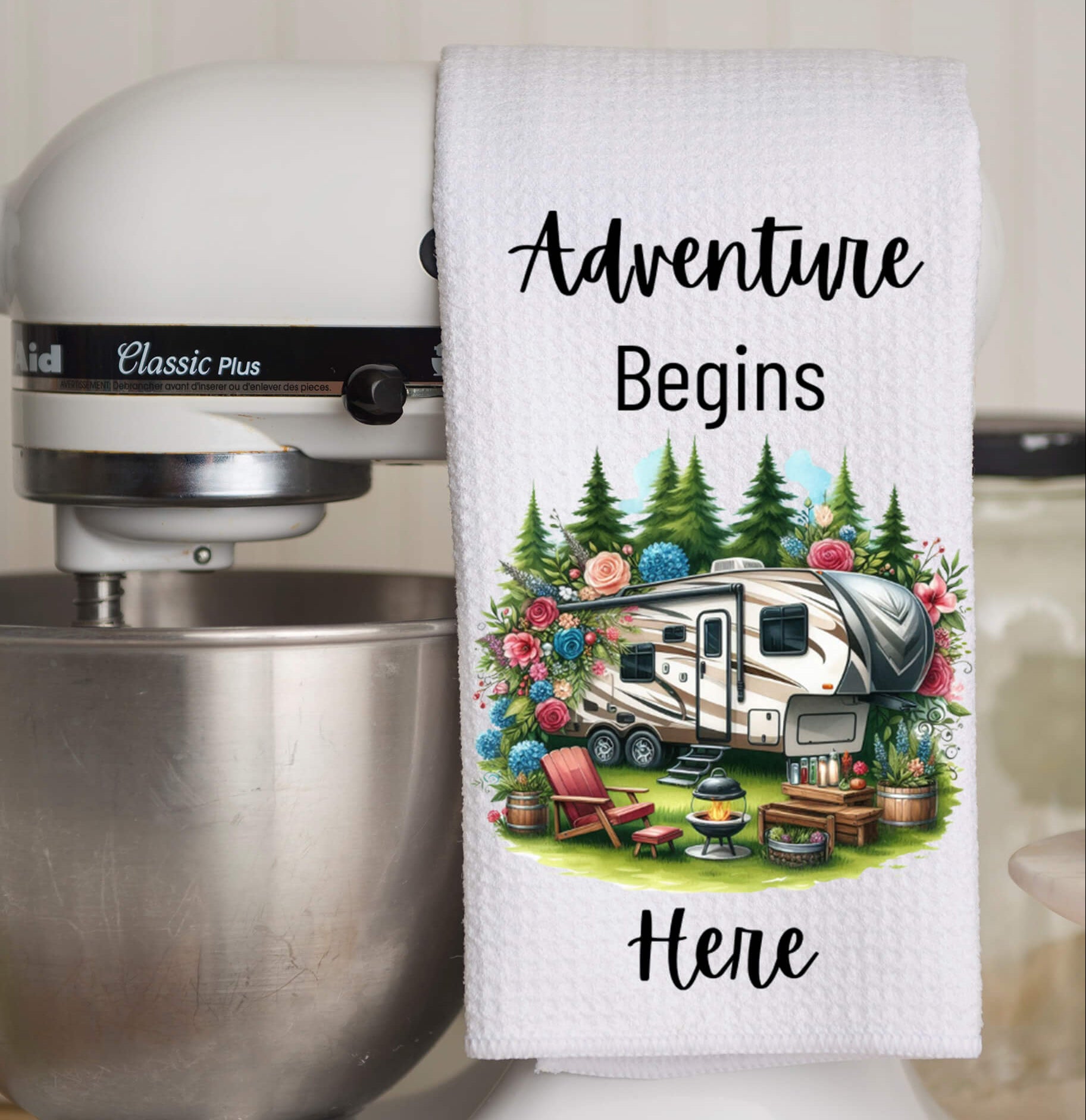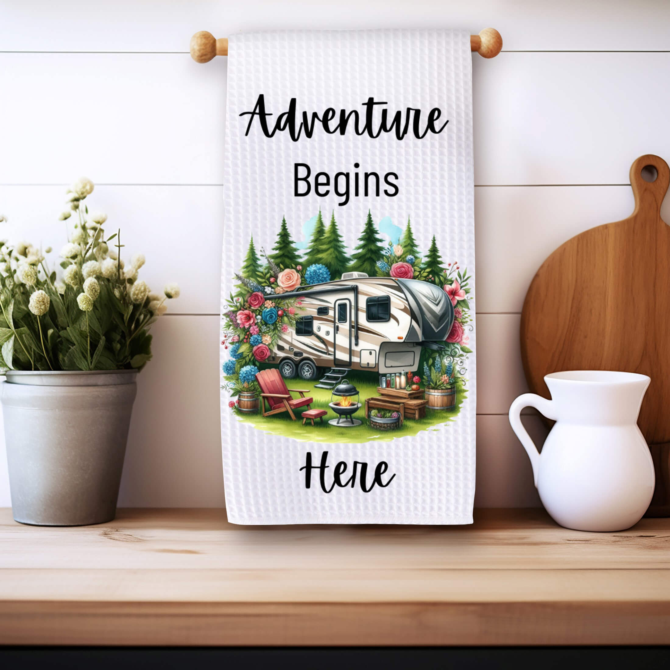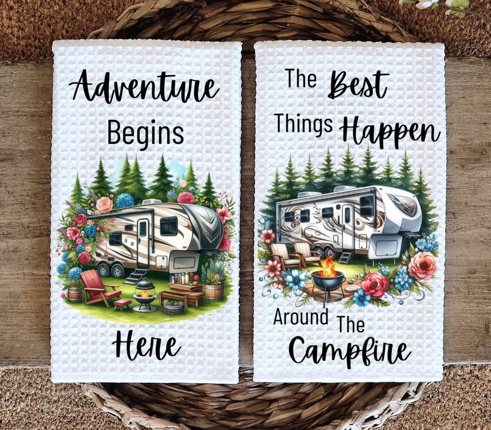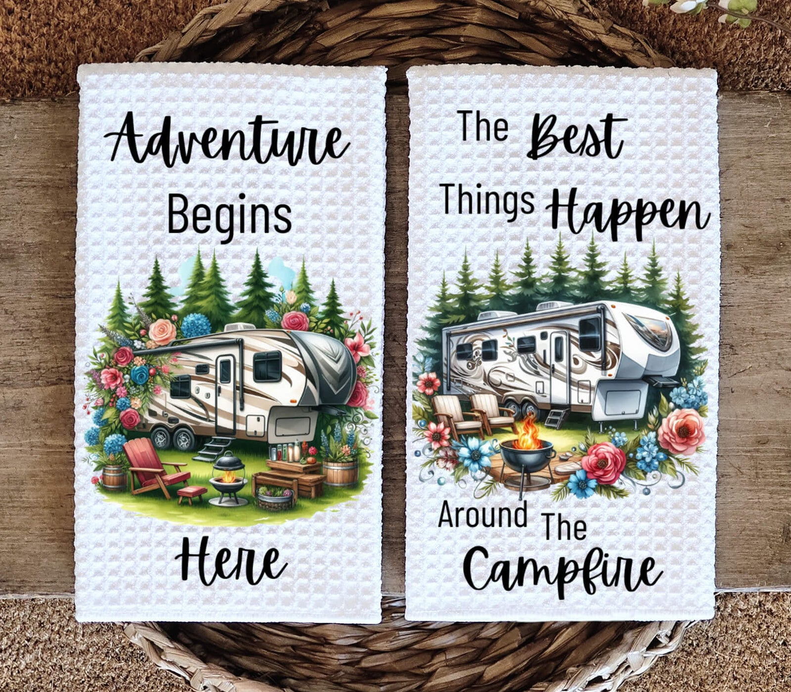 Bring the joy of the great outdoors into your kitchen with this adorable 5th wheel Camping Dish Towel Set! Featuring vibrant camper scenes with campfires, colorful florals, and retro outdoor furniture, these waffle weave towels are perfect for any nature-loving family or full-time RVers.