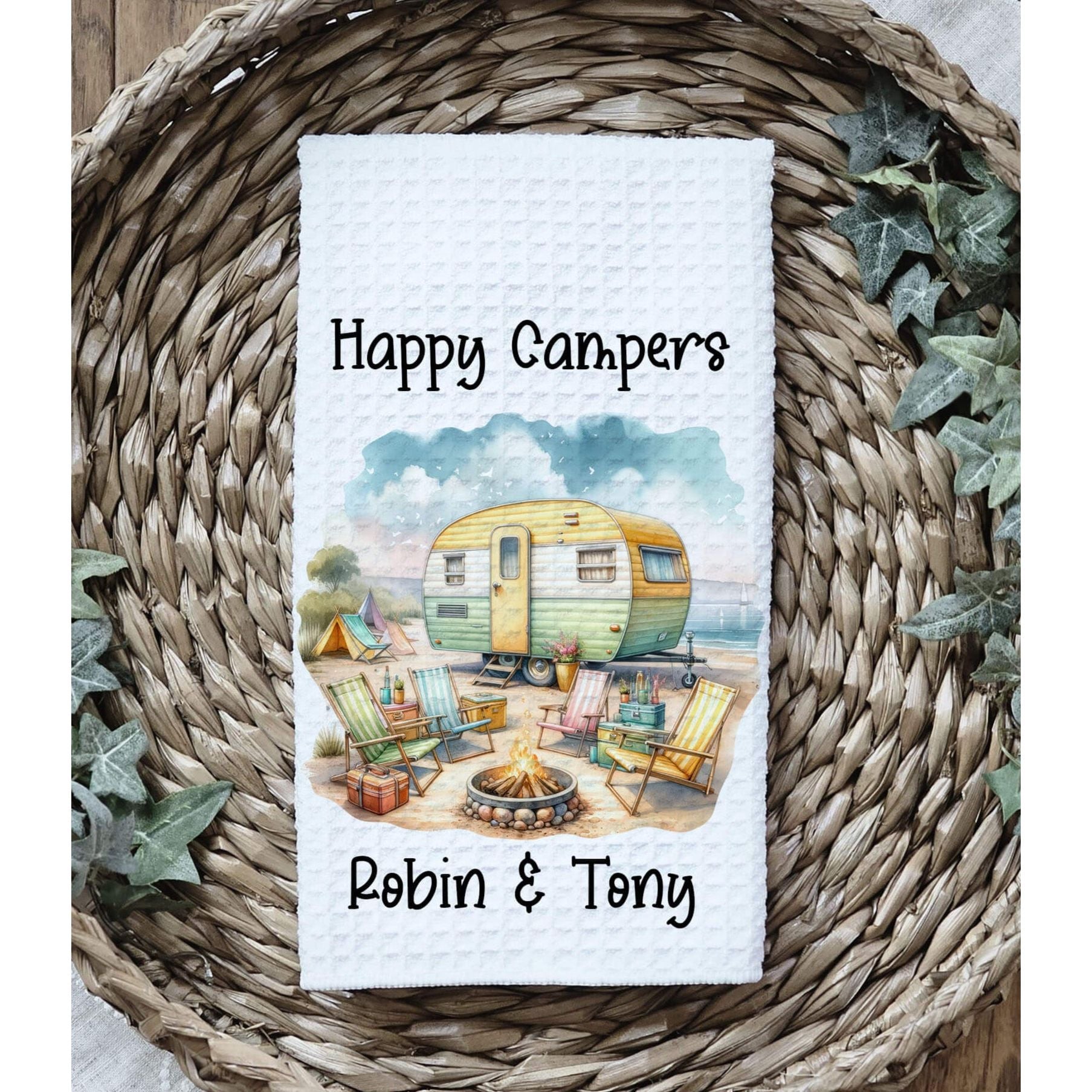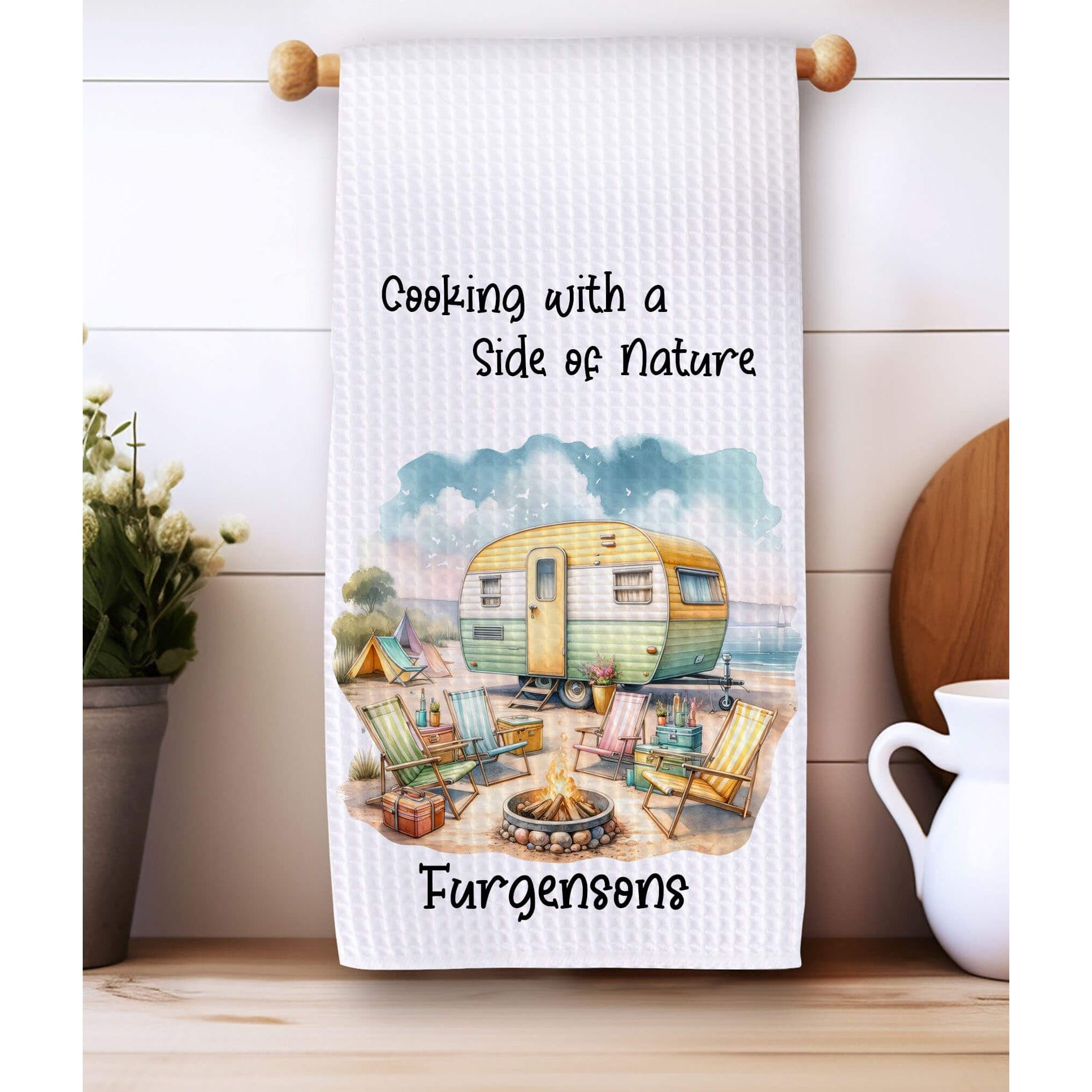 Bring a taste of the great outdoors right into your kitchen with this Beach themed personalized camping kitchen towel. Featuring a sunny retro yellow and green camper surrounded by colorful folding chairs, string lights, tents, and a cozy campfire, this towel adds charm and personality to your RV or home kitchen.