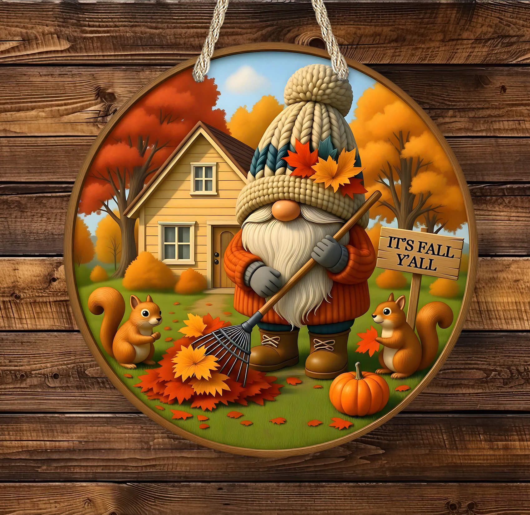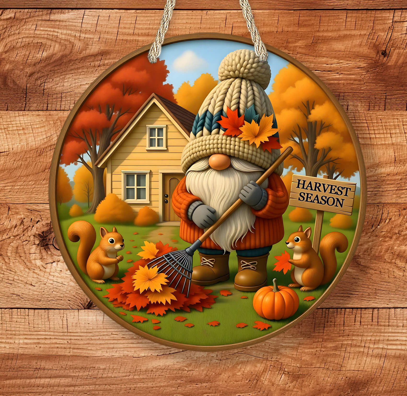 Celebrate sweater weather with this Cozy Fall Gnome Sign, a heartwarming touch for your porch, entryway, or living room this autumn. Featuring a bearded gnome raking leaves among squirrels, pumpkins, and golden trees, this round sign is perfect for seasonal decorating or gifting.