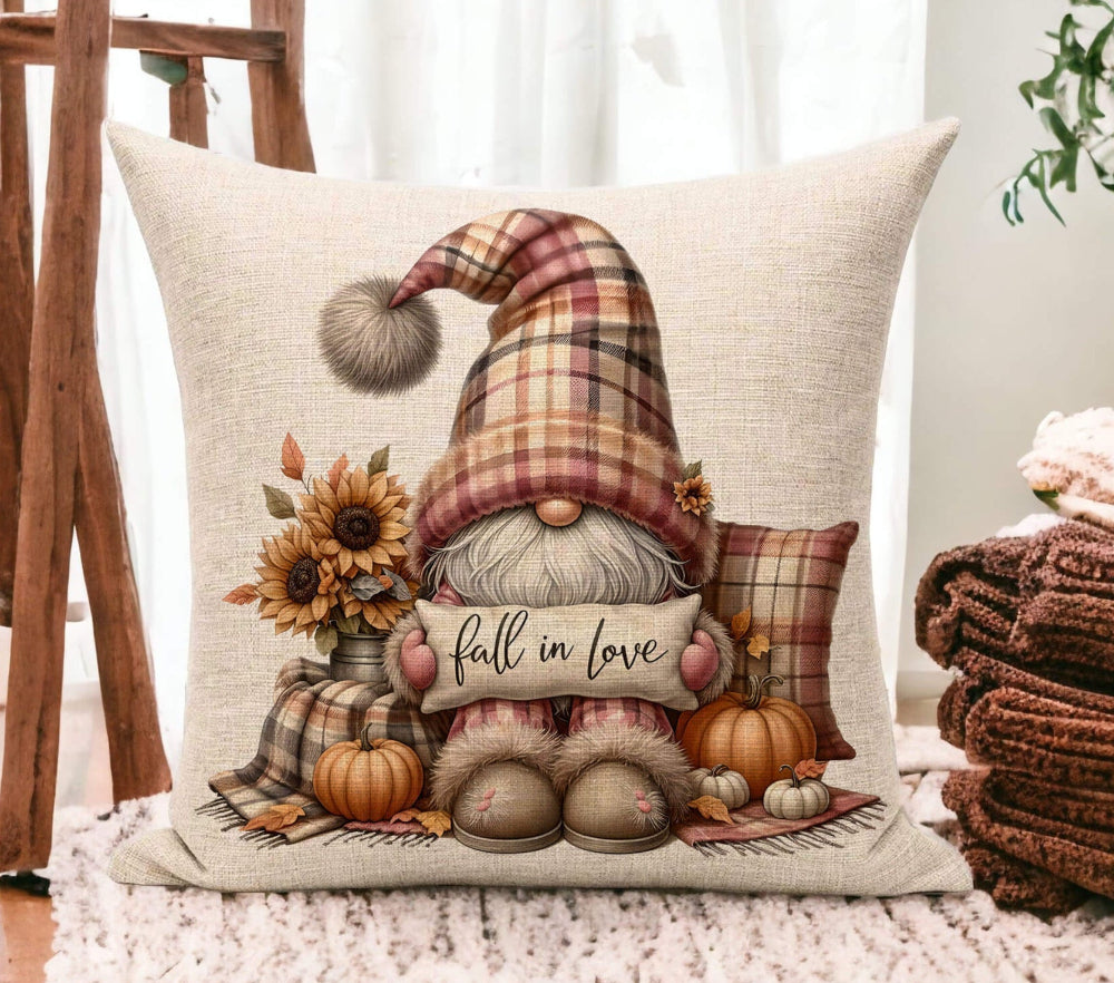Bring warmth and whimsy to your autumn décor with this “Fall In Love” Gnome Pillow, featuring a charming fall gnome holding a festive sign, surrounded by pumpkins, sunflowers, and cozy plaid pillows. This beautifully illustrated design adds a heartwarming farmhouse touch to your sofa, entry bench, or reading nook.
