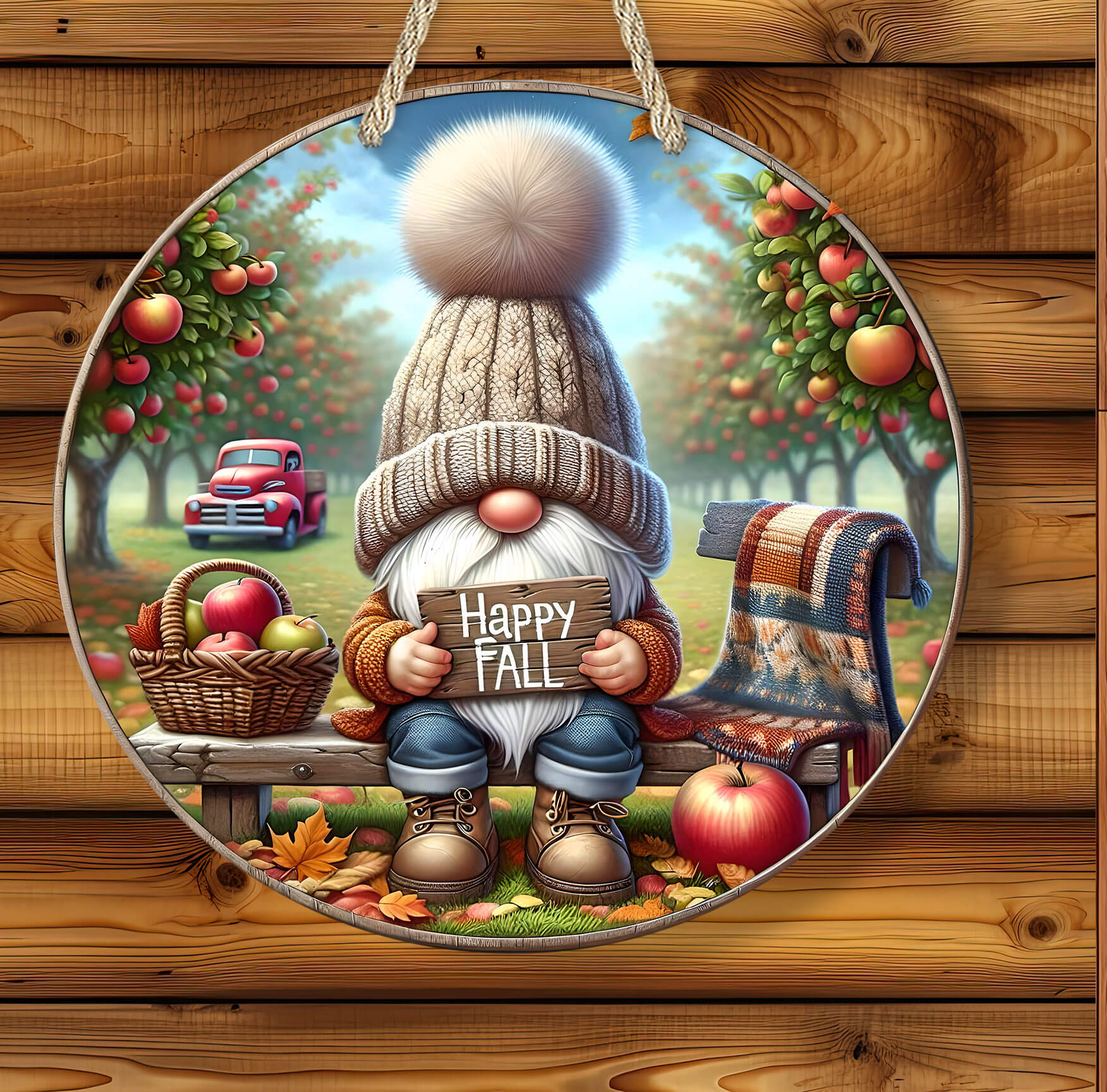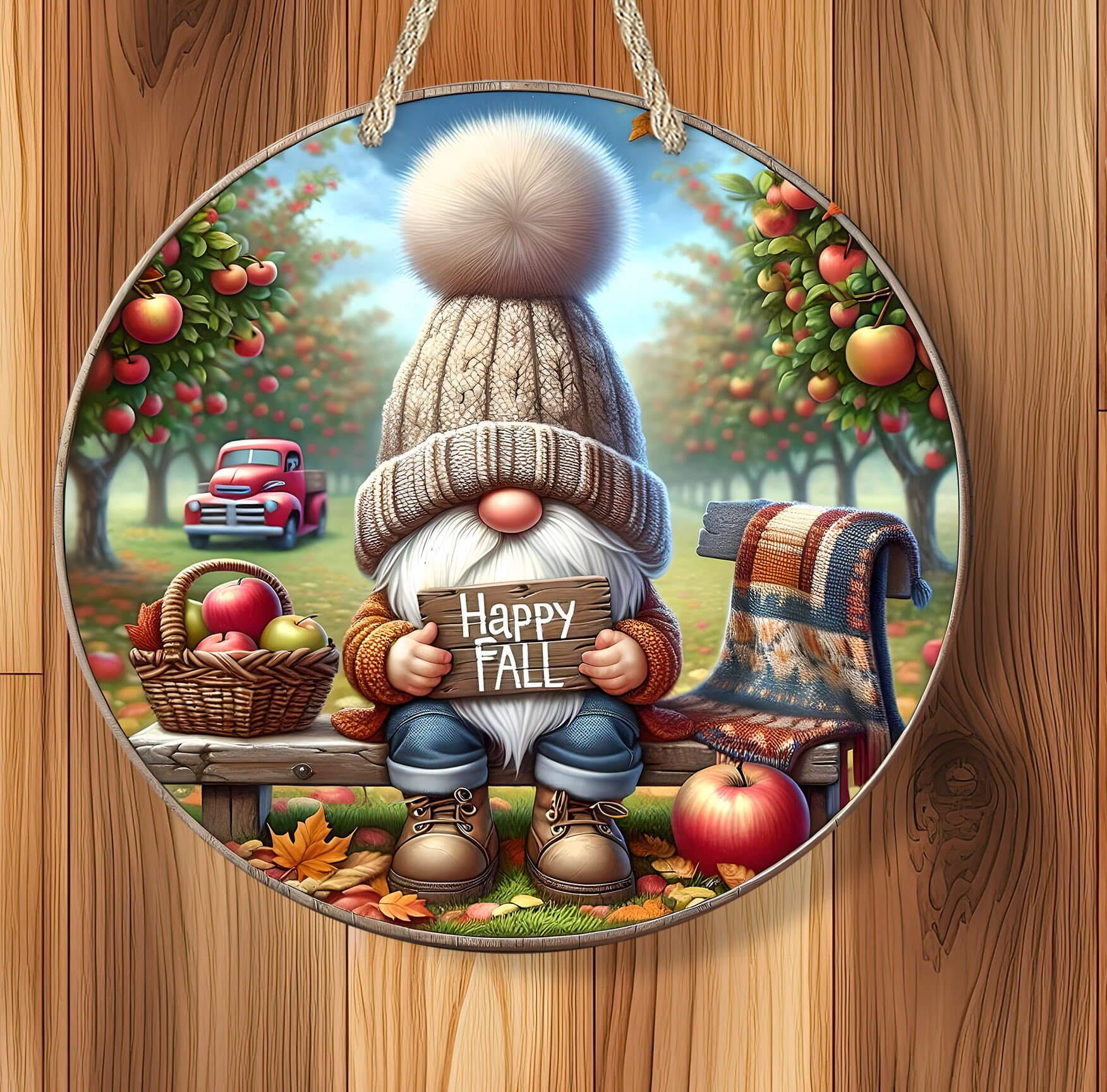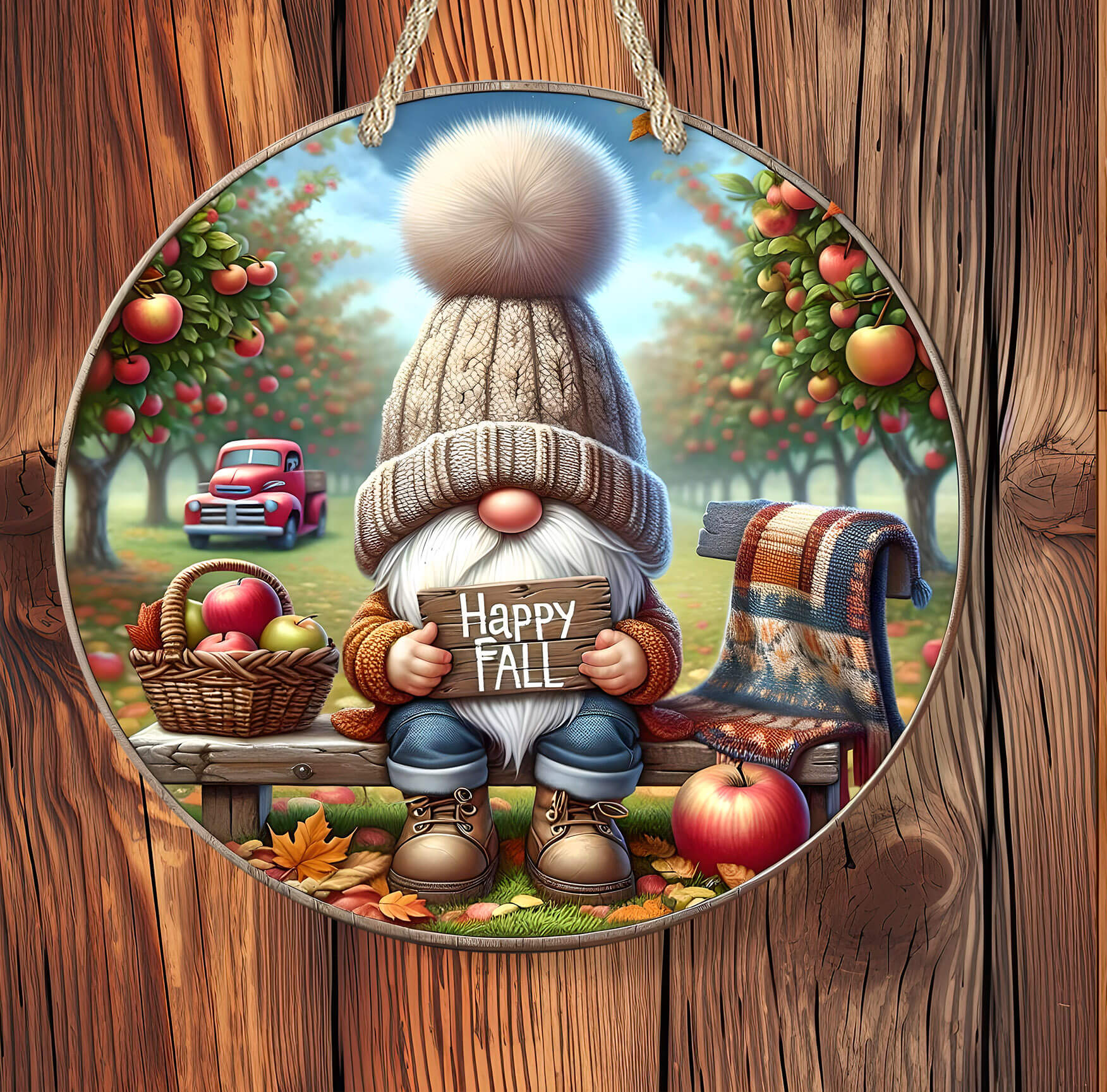 Welcome autumn with cozy charm and apple-picking nostalgia! This personalized round rustic apple sign features an adorable gnome holding a “Happy Fall” sign, surrounded by apple trees, a vintage red pickup, a warm plaid blanket, and vibrant autumn leaves. Perfect for welcoming guests, decorating farmhouse porches, or gifting loved ones.