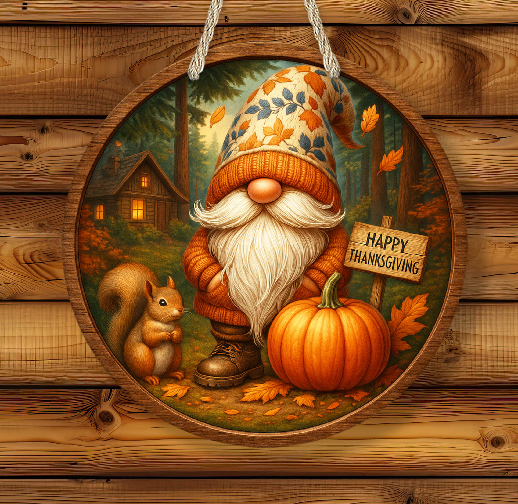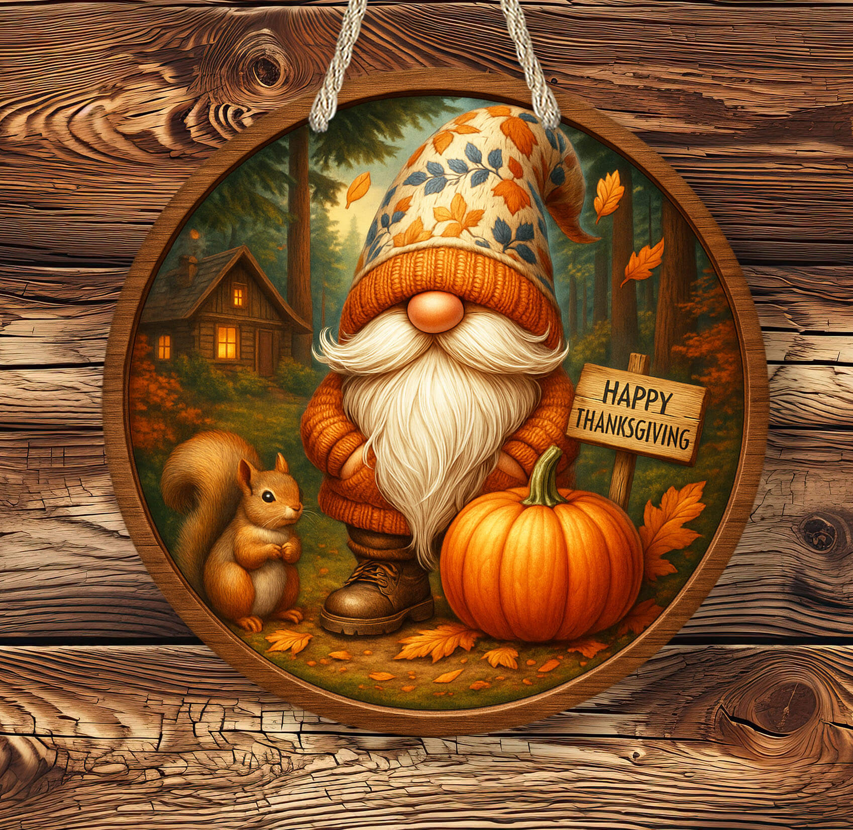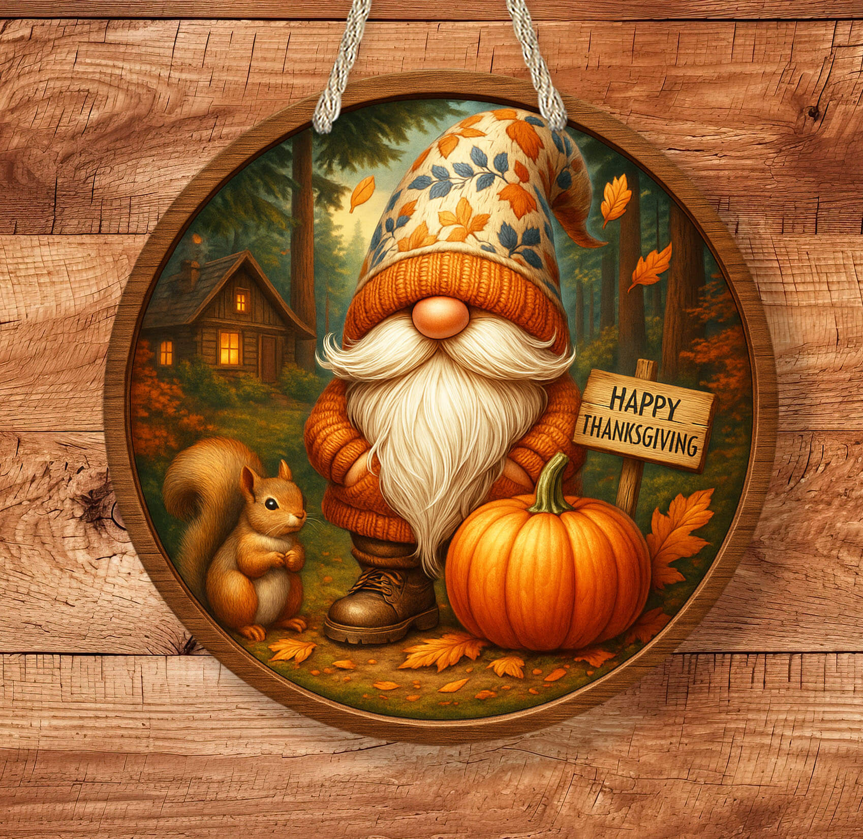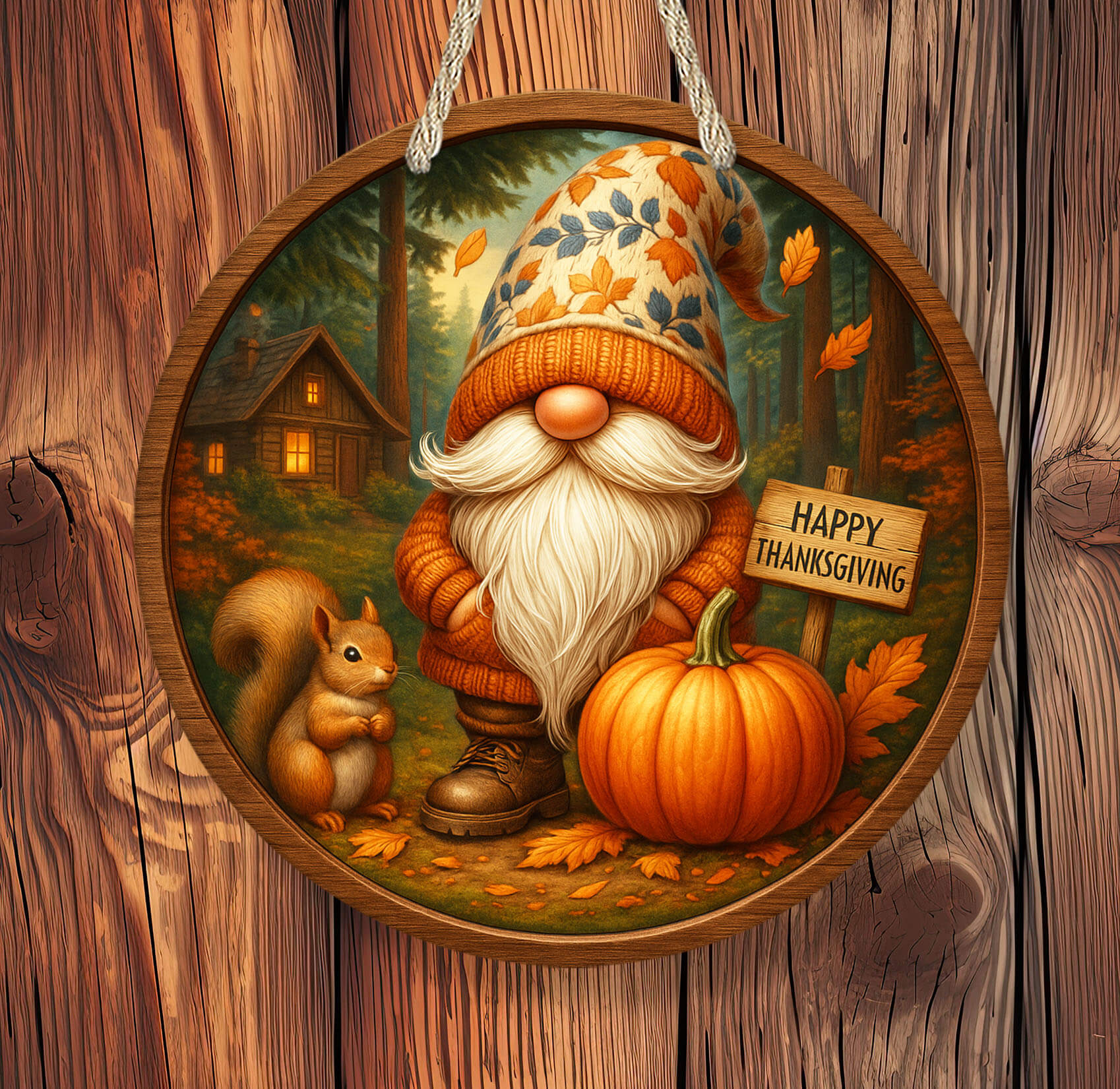 Celebrate the cozy beauty of fall with this Happy Thanksgiving Gnome Sign, featuring a bearded gnome in a leaf-patterned hat, standing next to a pumpkin and a friendly squirrel in front of a forest cabin. Surrounded by autumn leaves and woodsy warmth, this round wood-look sign is perfect for farmhouse doors, porch displays, or rustic Thanksgiving décor.