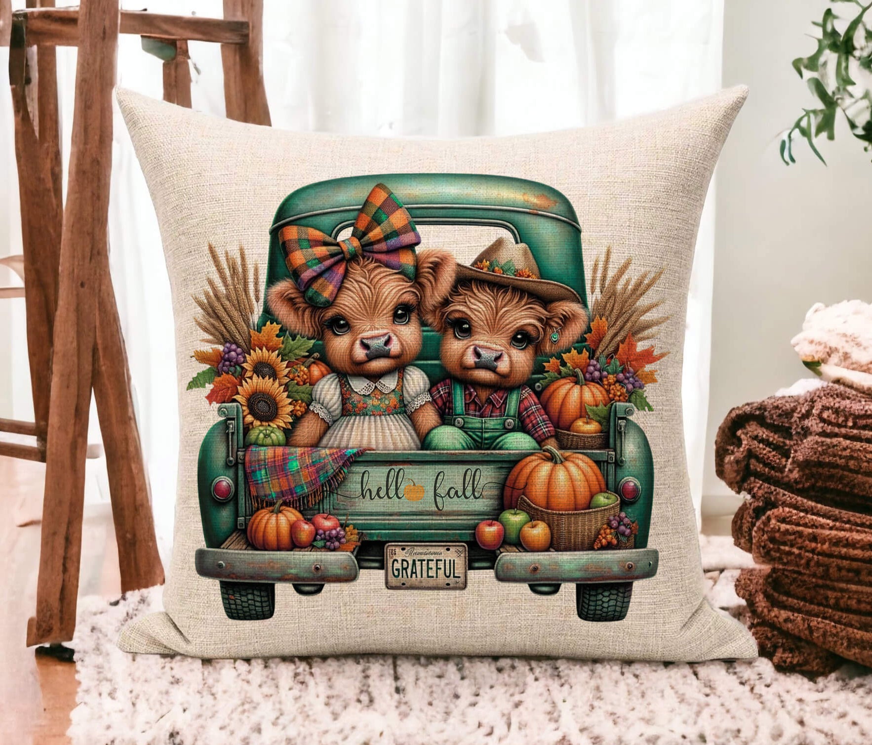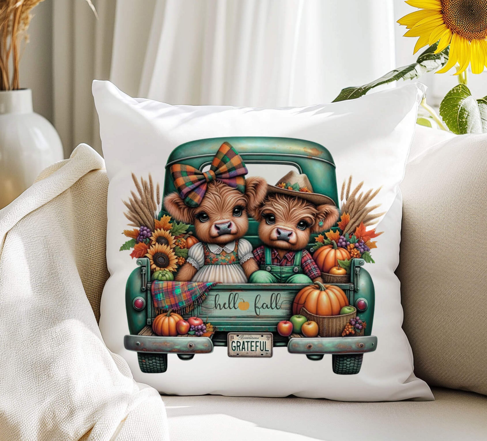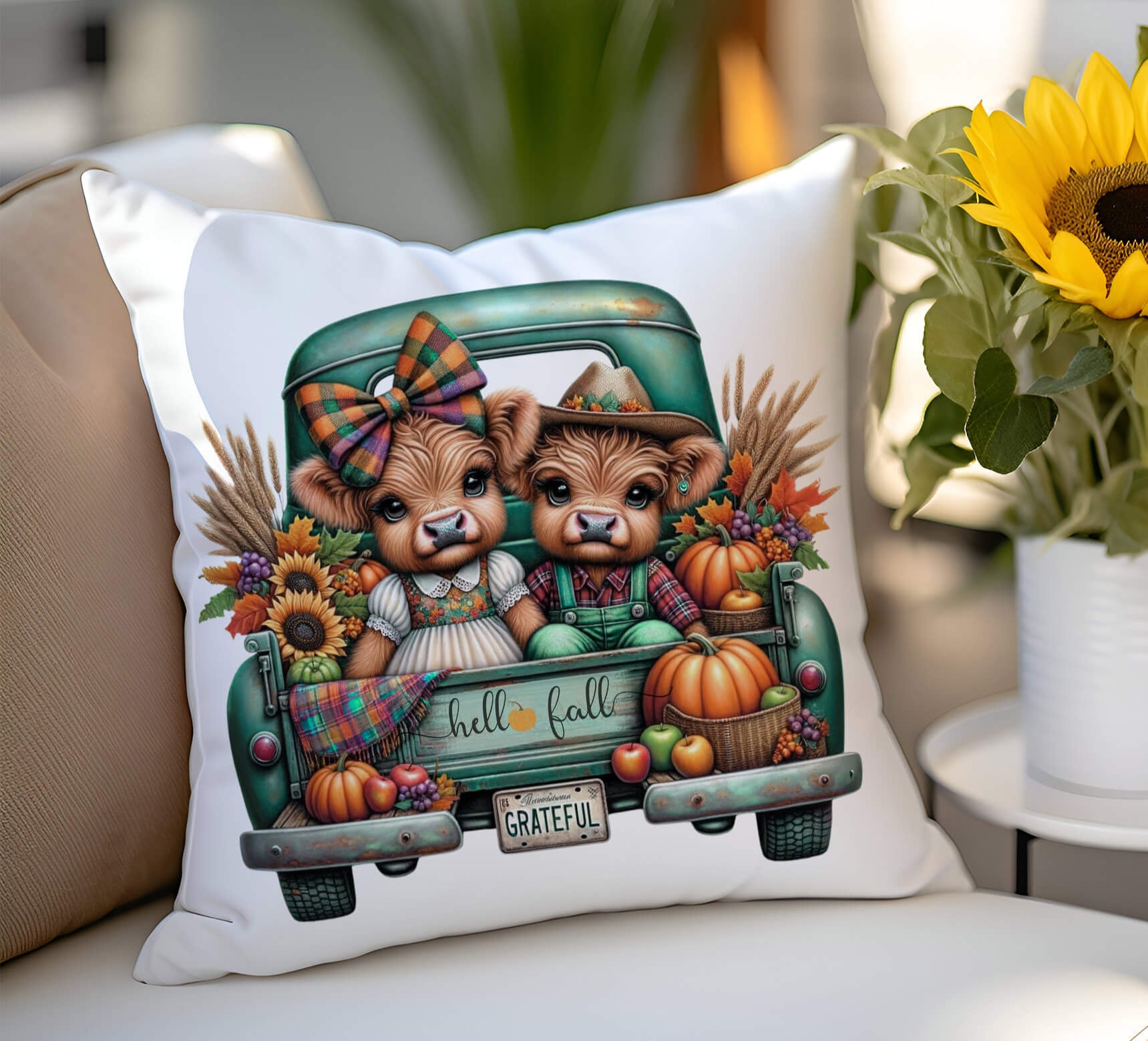 Cozy up your space with this charming Highland Cow Fall Pillow, featuring two adorable cows riding in a teal vintage truck filled with pumpkins, sunflowers, and autumn goodness. With plaid accents, rustic florals, and the heartwarming message "Hello Fall," this decorative pillow cover brings a touch of country charm to your living room, porch, or farmhouse décor.
