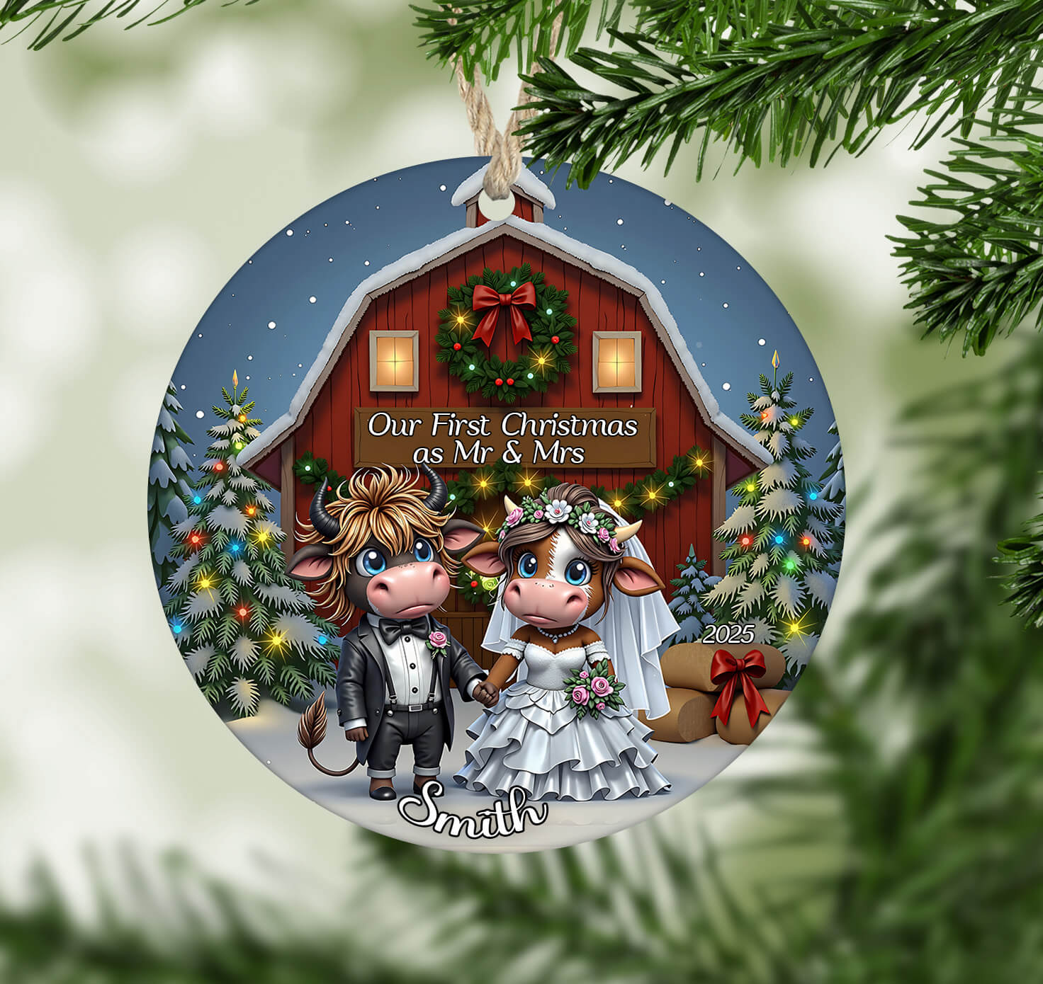 Celebrate love and new beginnings with this personalized “Our First Christmas as Mr & Mrs” ornament. Featuring an adorable bride and groom cow couple standing in front of a decorated barn, this rustic farmhouse ornament is the perfect keepsake for newlyweds or couples celebrating their first Christmas together.