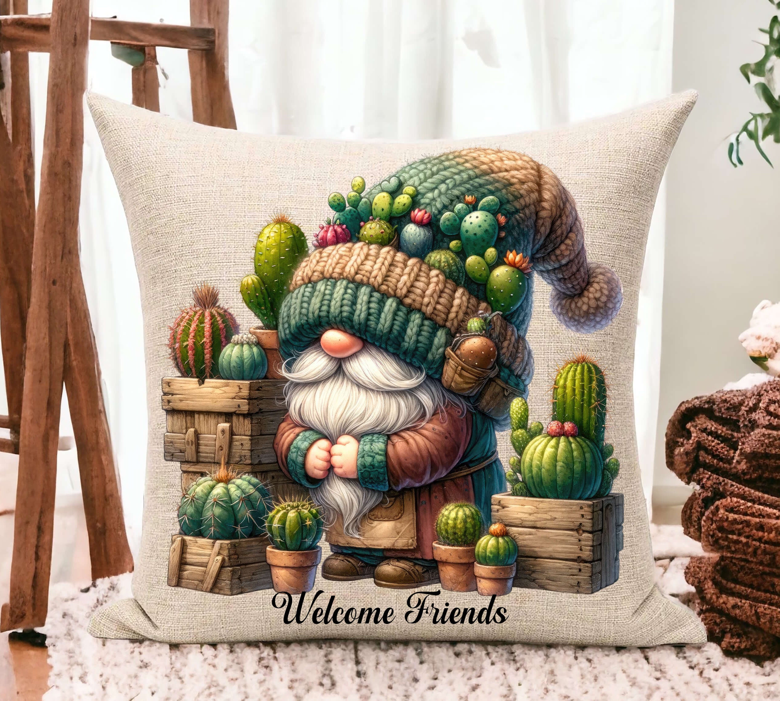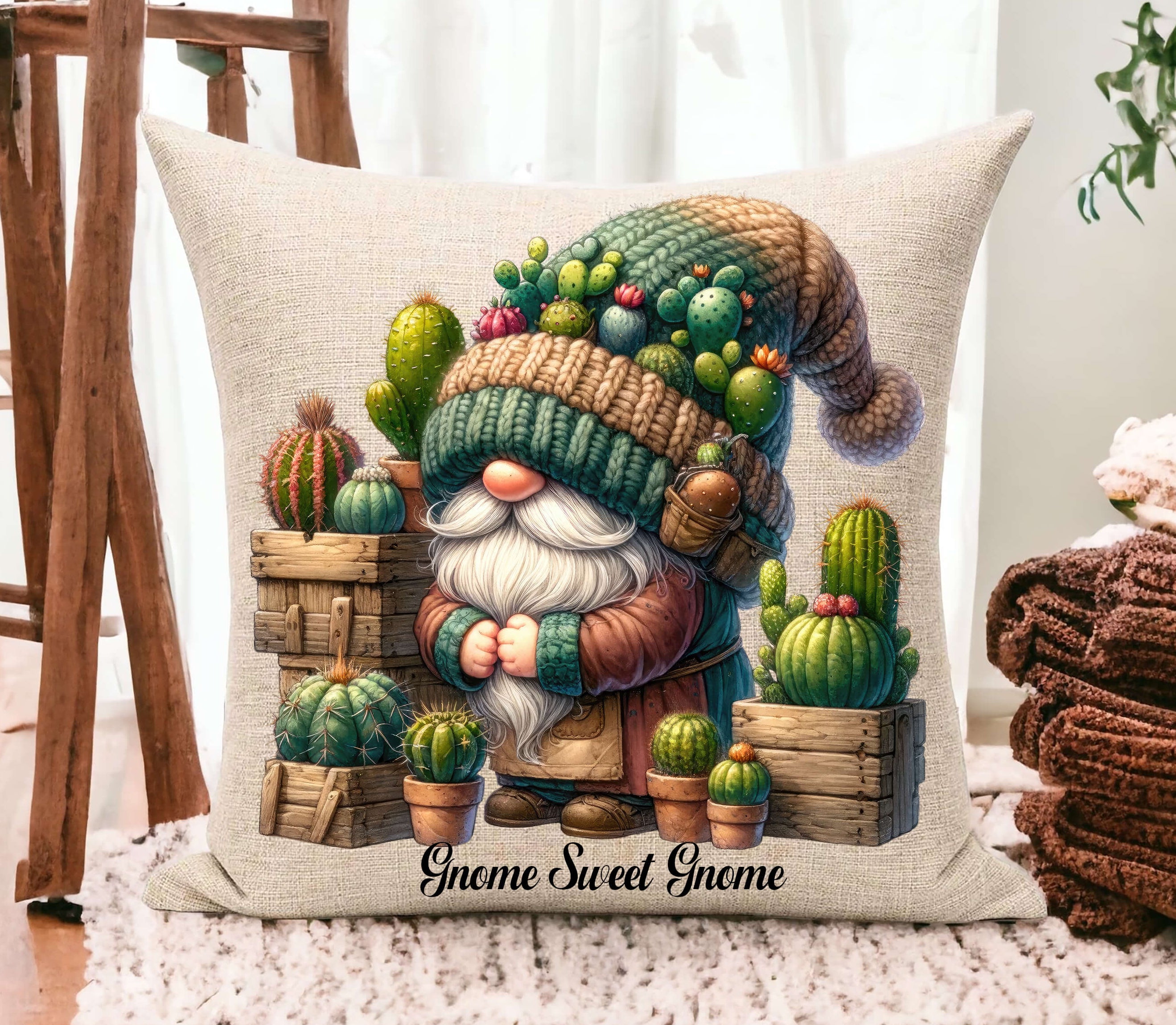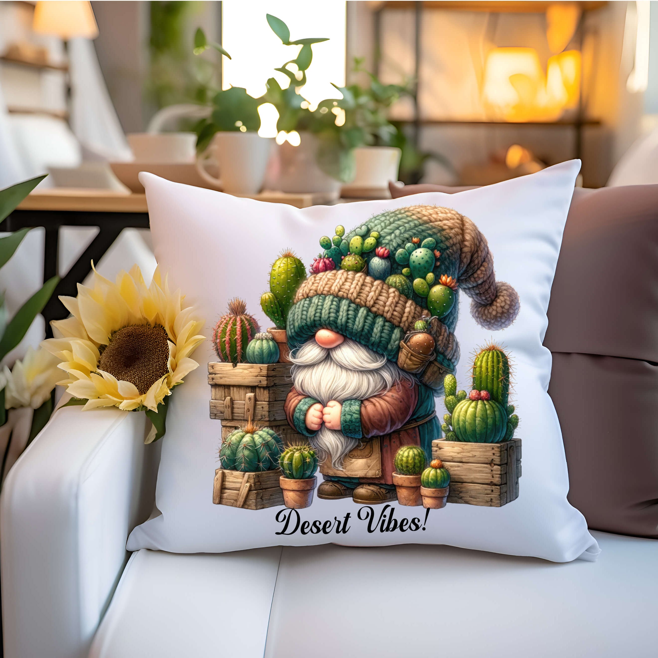 Add a whimsical desert charm to your home with this Personalized Cactus Gnome Pillow Cover! Featuring an adorable bearded gnome wearing a cactus-filled beanie, surrounded by potted succulents and wooden crates, this cozy pillow blends farmhouse warmth with Southwestern flair.