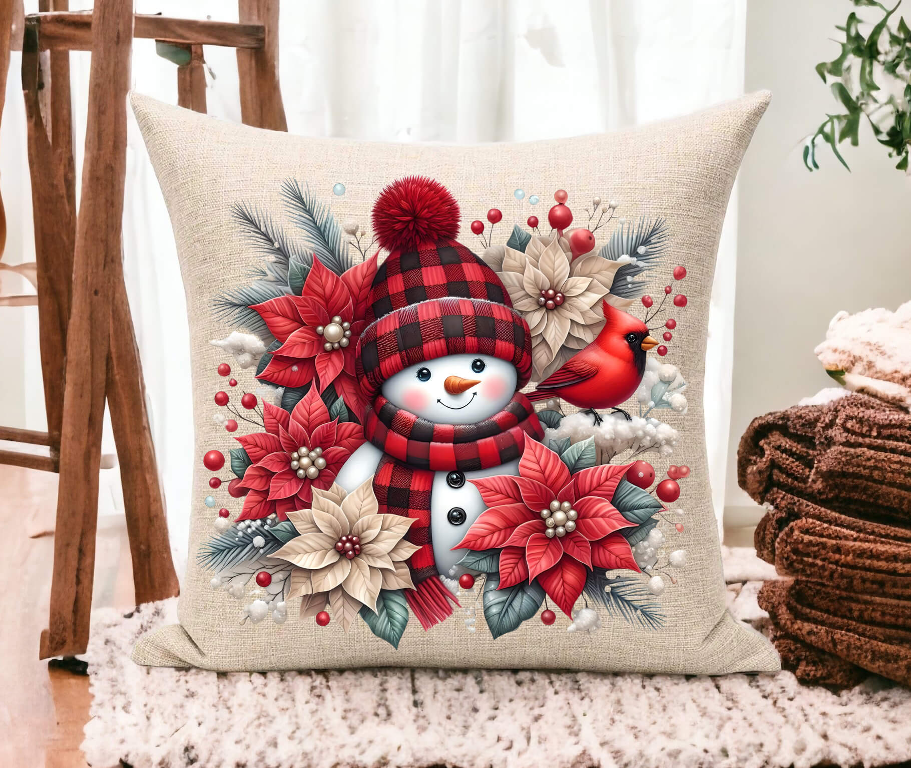 This premium throw pillow showcases an adorable snowman in a red buffalo-plaid hat and scarf, surrounded by poinsettias, berries, pine greenery, and a bright red cardinal. Your family name is printed in elegant script for a keepsake that doubles as festive home décor and a memorable Christmas gift.