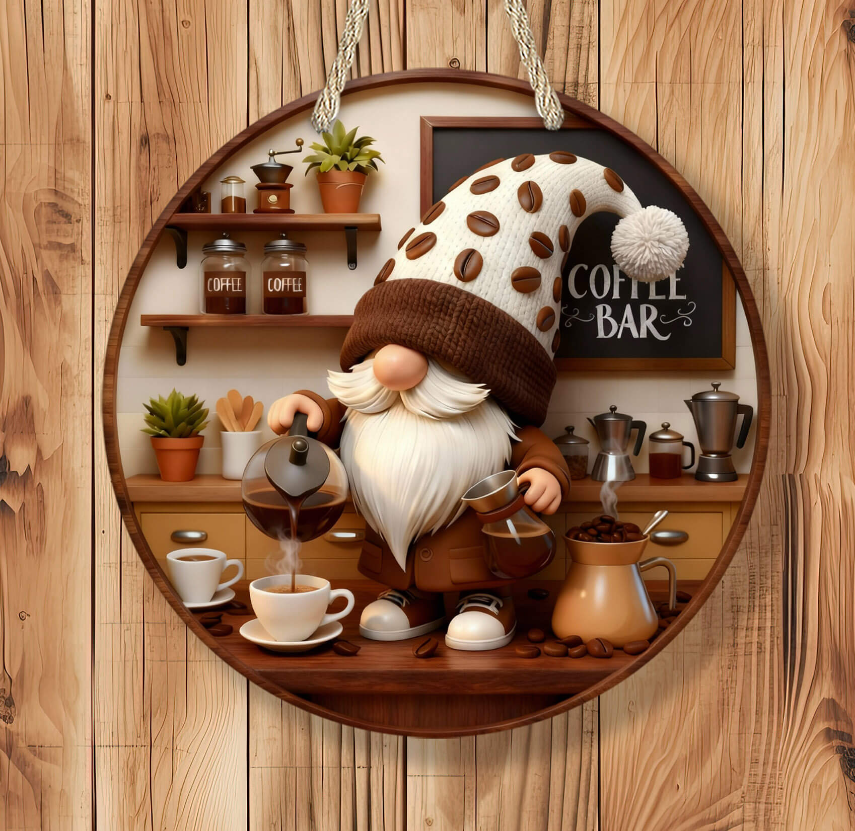 This personalized coffee gnome door hanger/sign brings warmth and humor to any kitchen, coffee nook, or home café. Featuring an adorable gnome pouring coffee among mugs and beans, this rustic-style sign is perfect for coffee lovers, baristas, or anyone who loves cozy farmhouse décor.