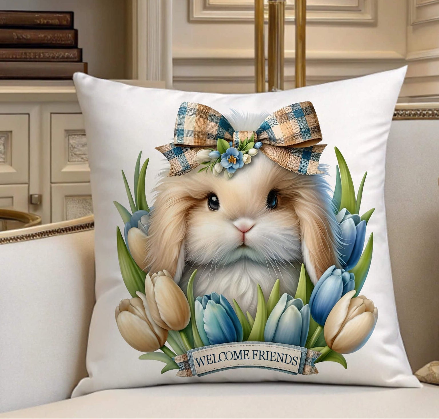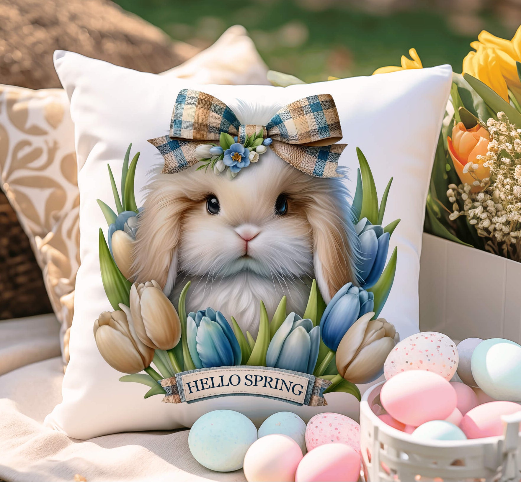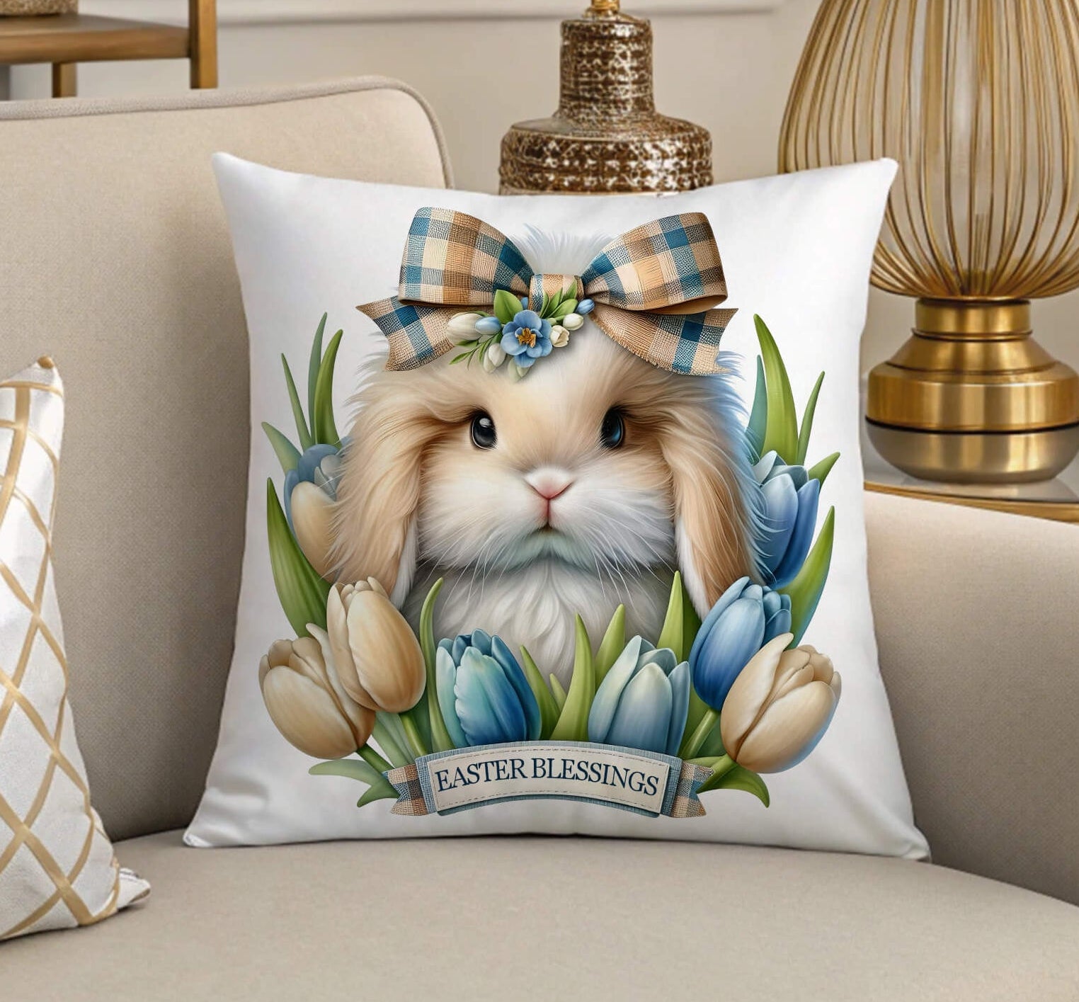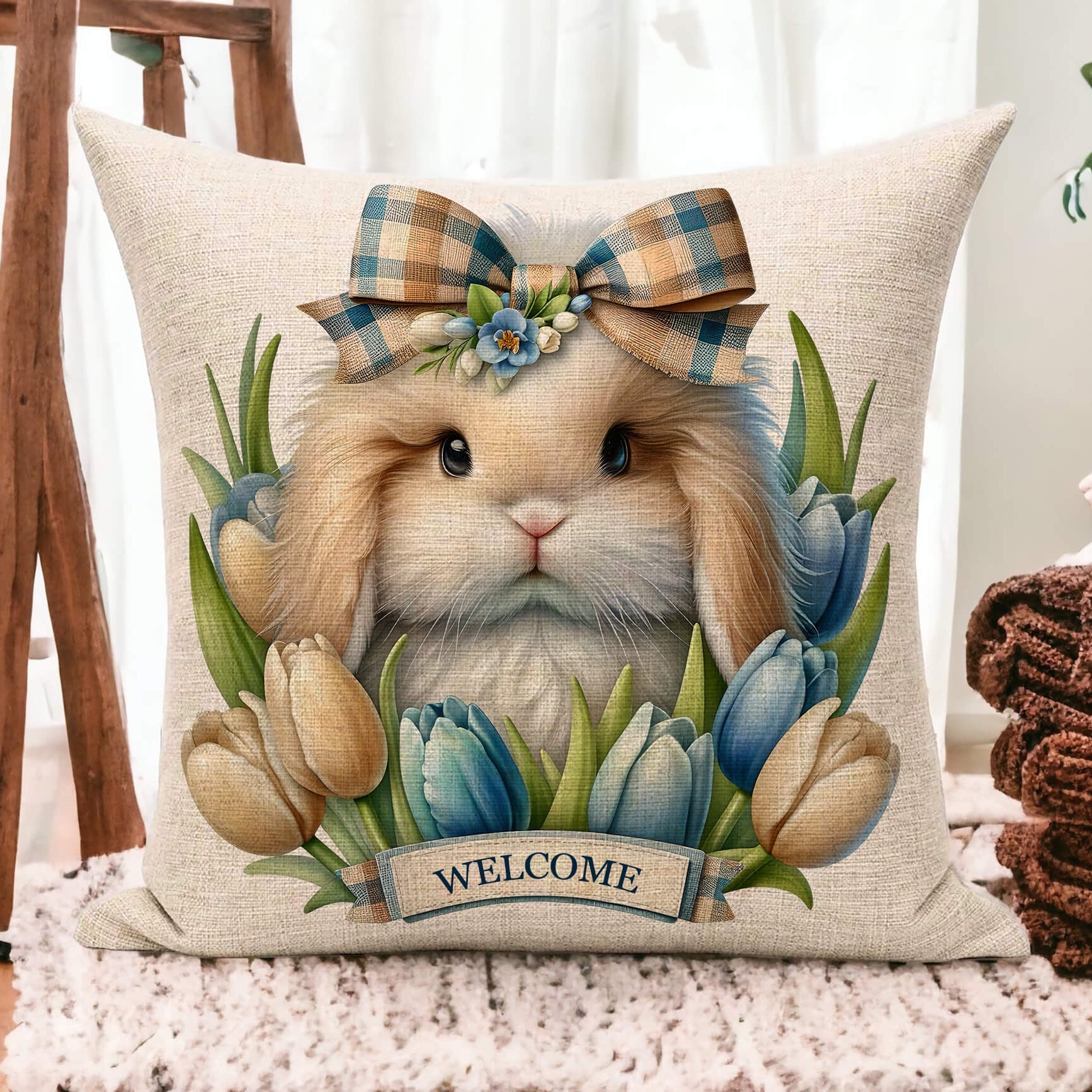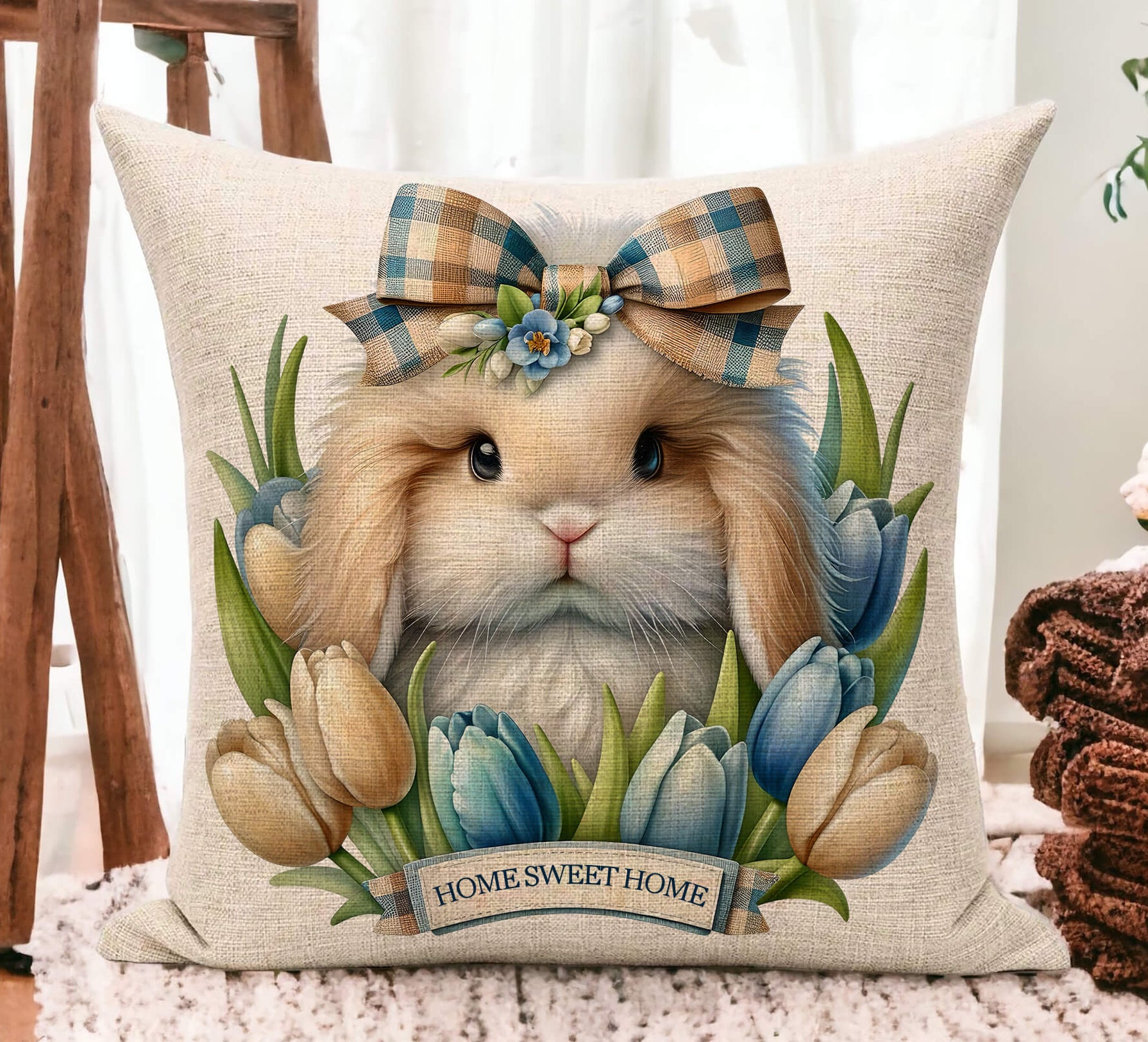 This neutral farmhouse-style Easter pillow adds warmth and charm to: