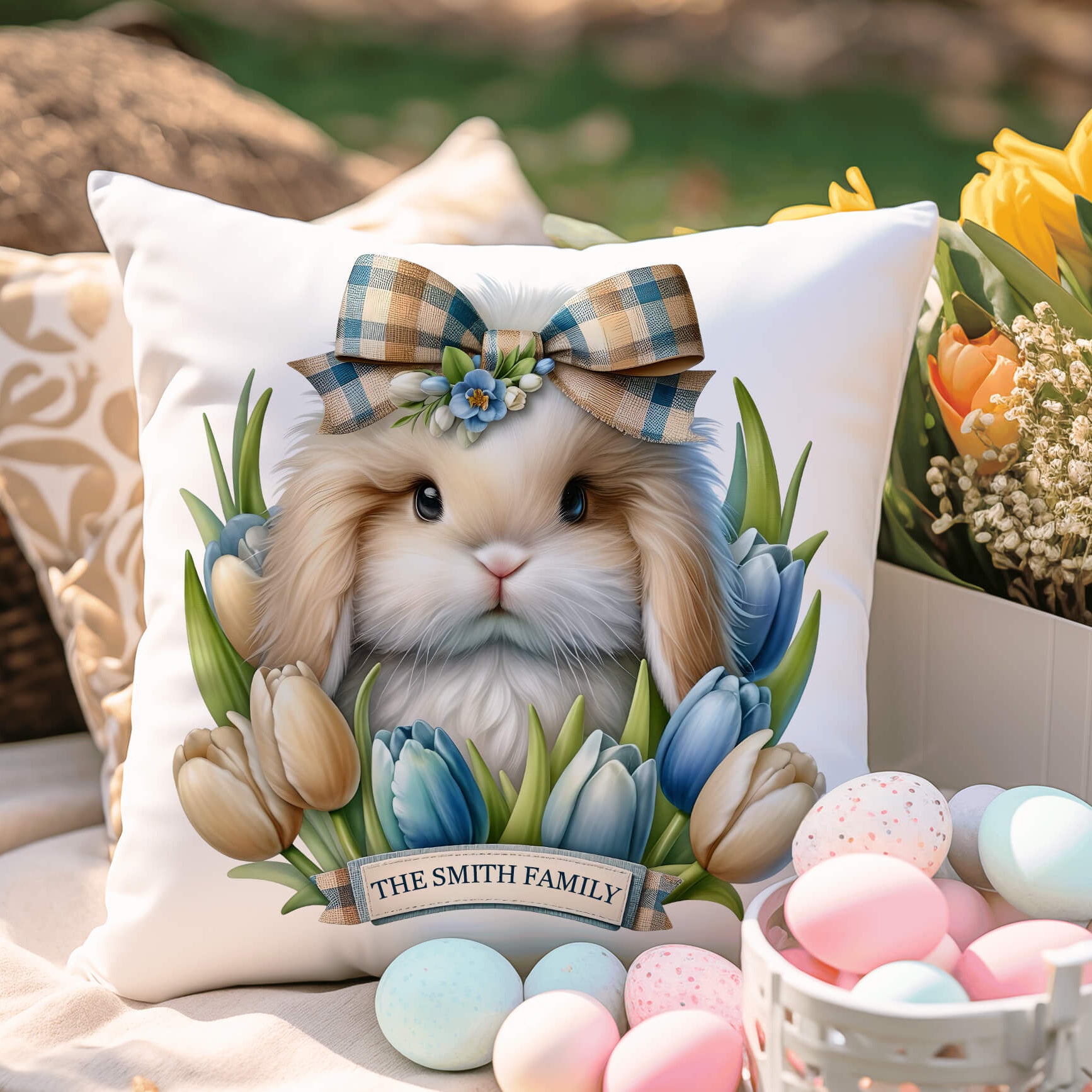 Celebrate spring with a cozy, personalized Easter bunny pillow cover featuring a sweet lop-eared rabbit surrounded by soft blue and beige tulips and your custom text, available in 18"x18" with a hidden zipper and in either beige linen blend or white polyester canvas. These beautiful pillow covers witll be an adorable for any spring home!