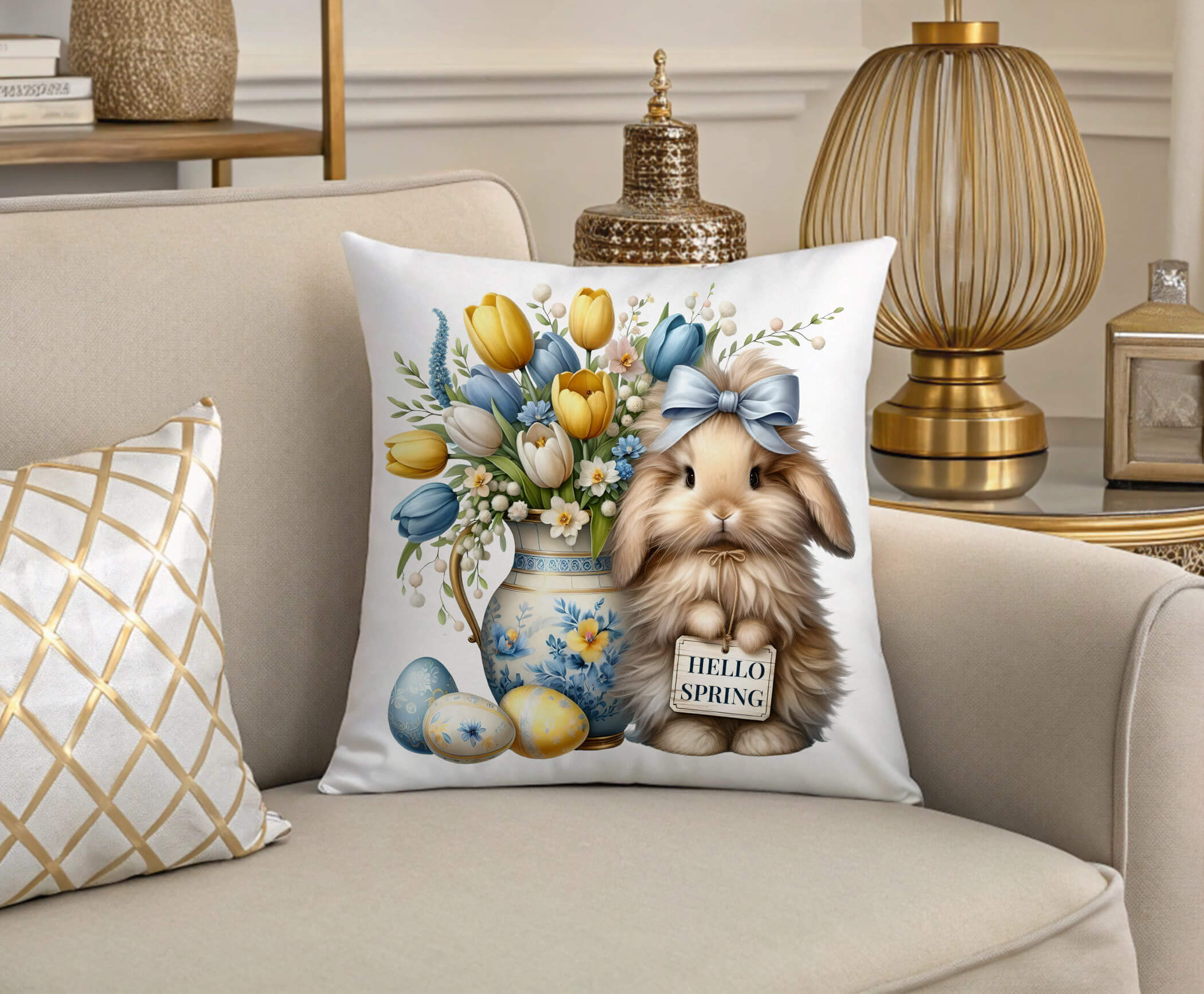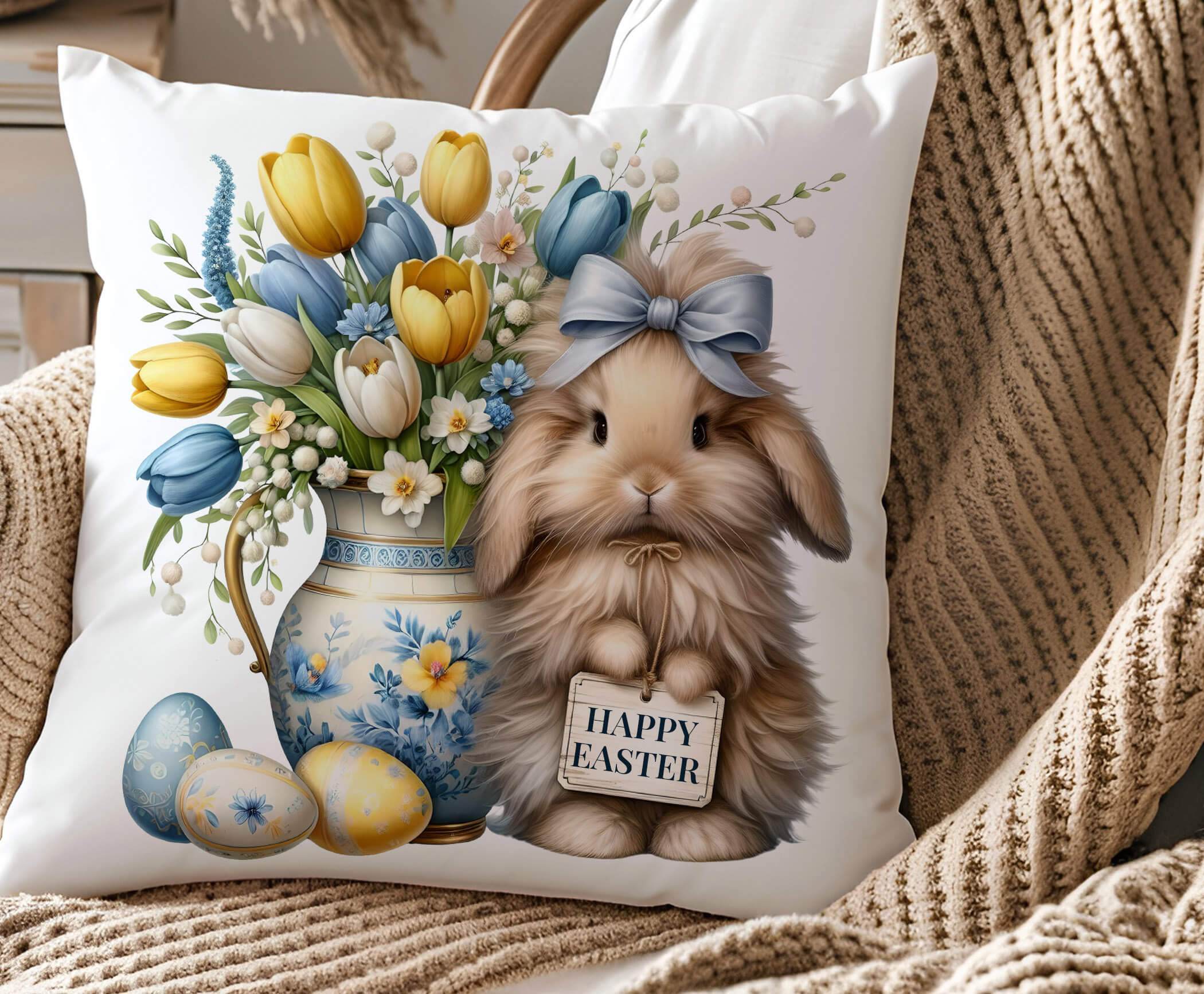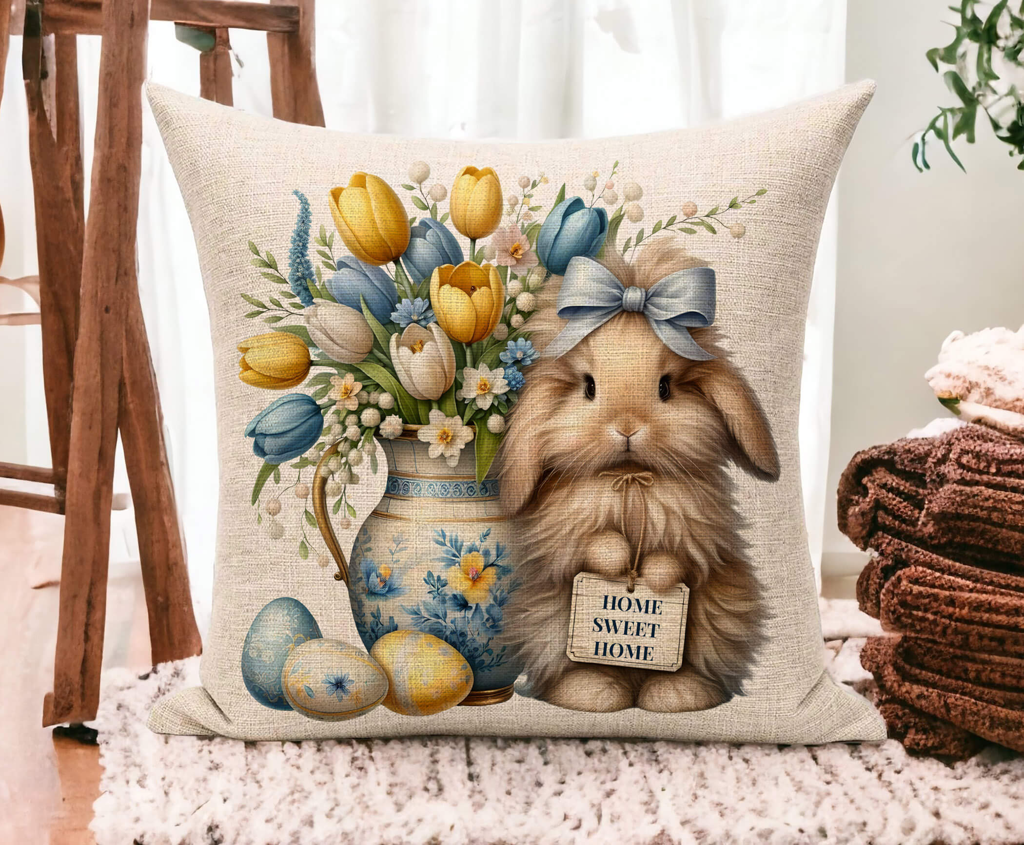 This farmhouse-style Easter pillow adds warmth and charm to: